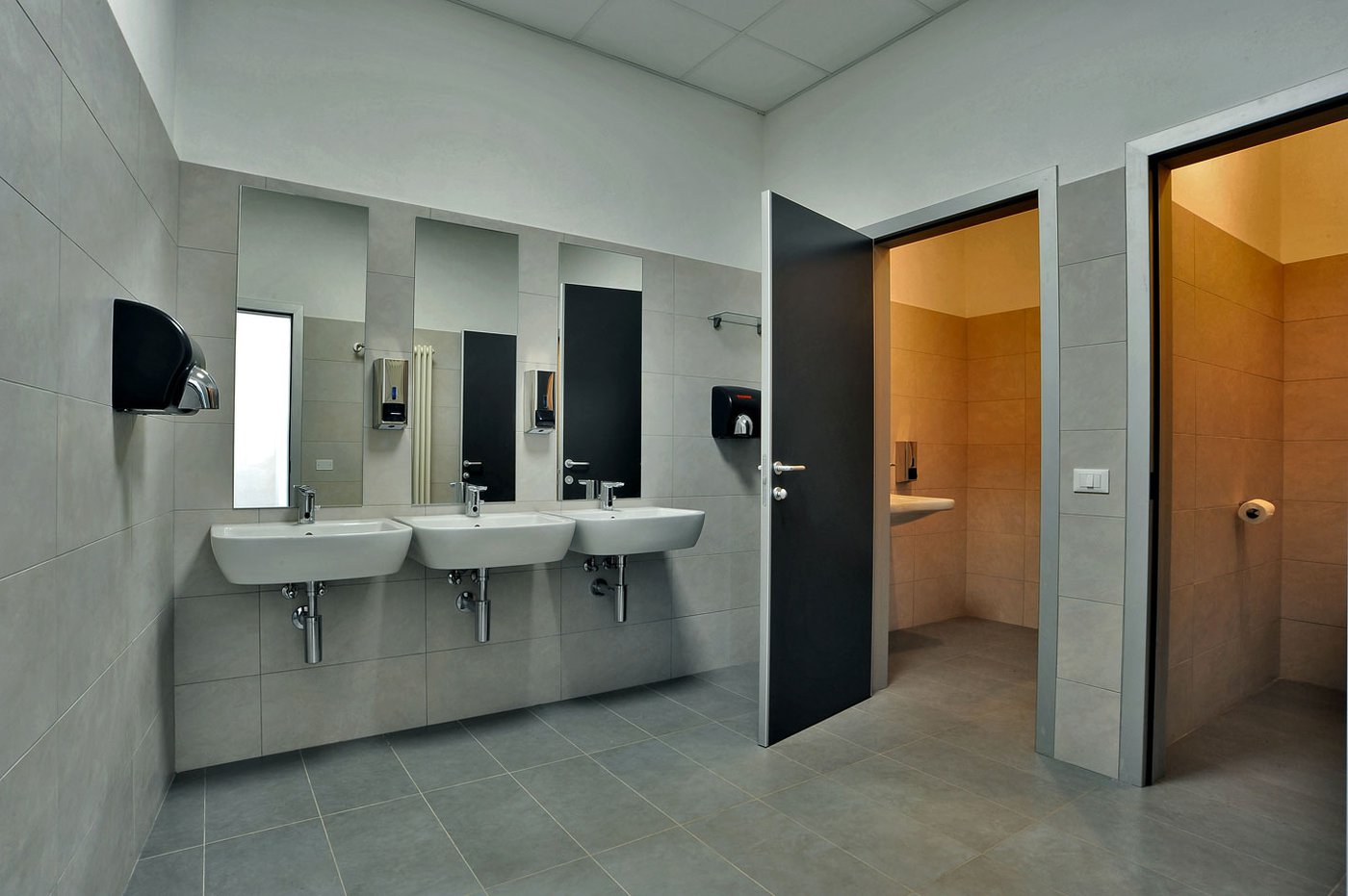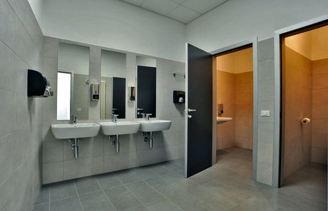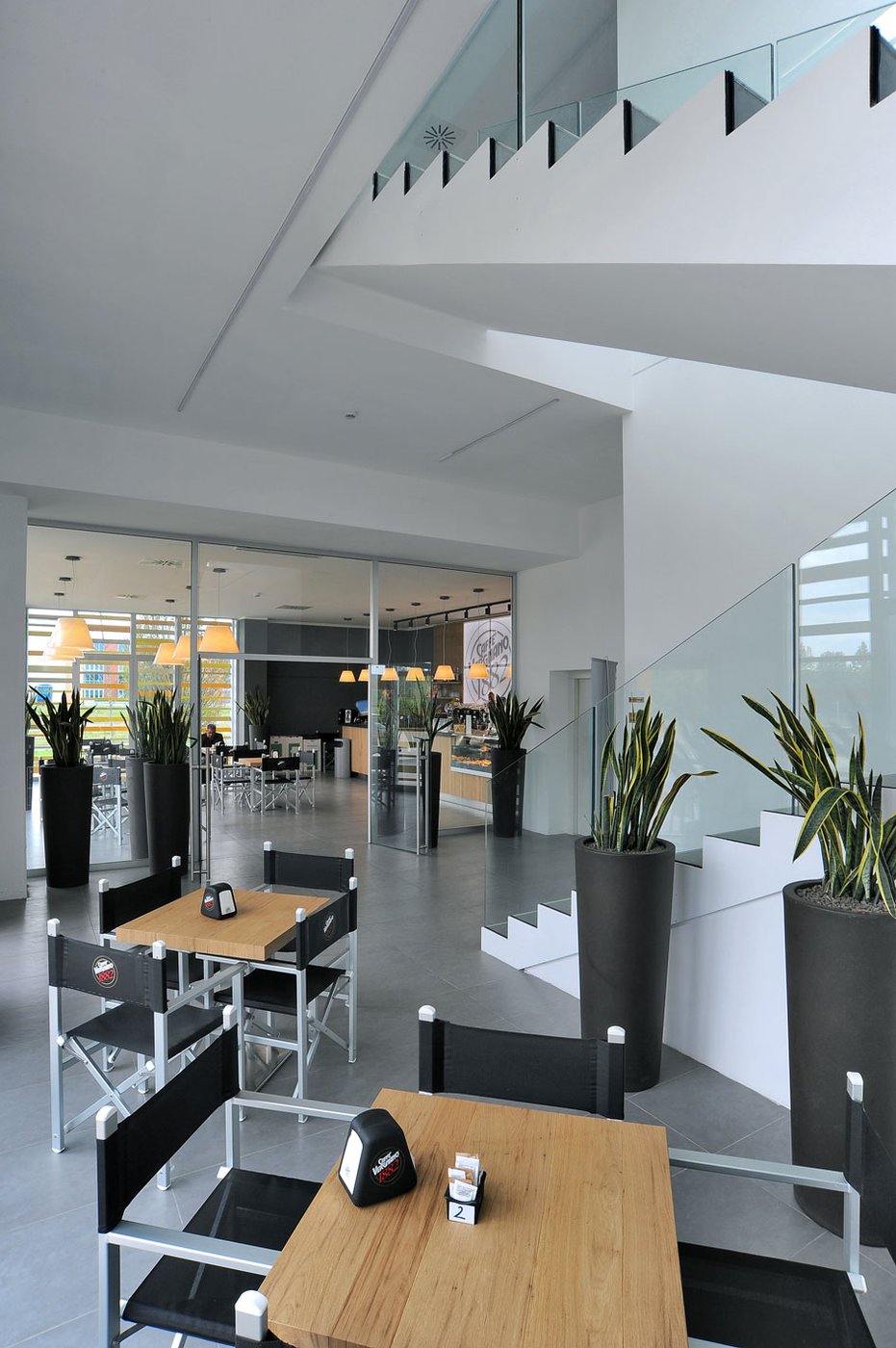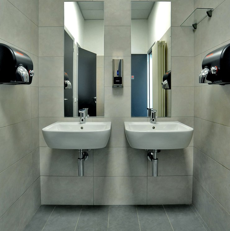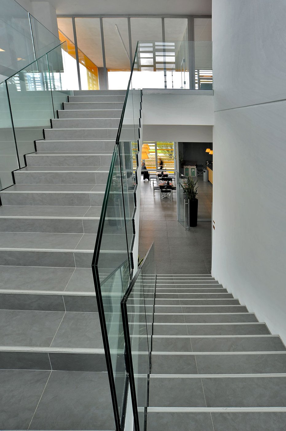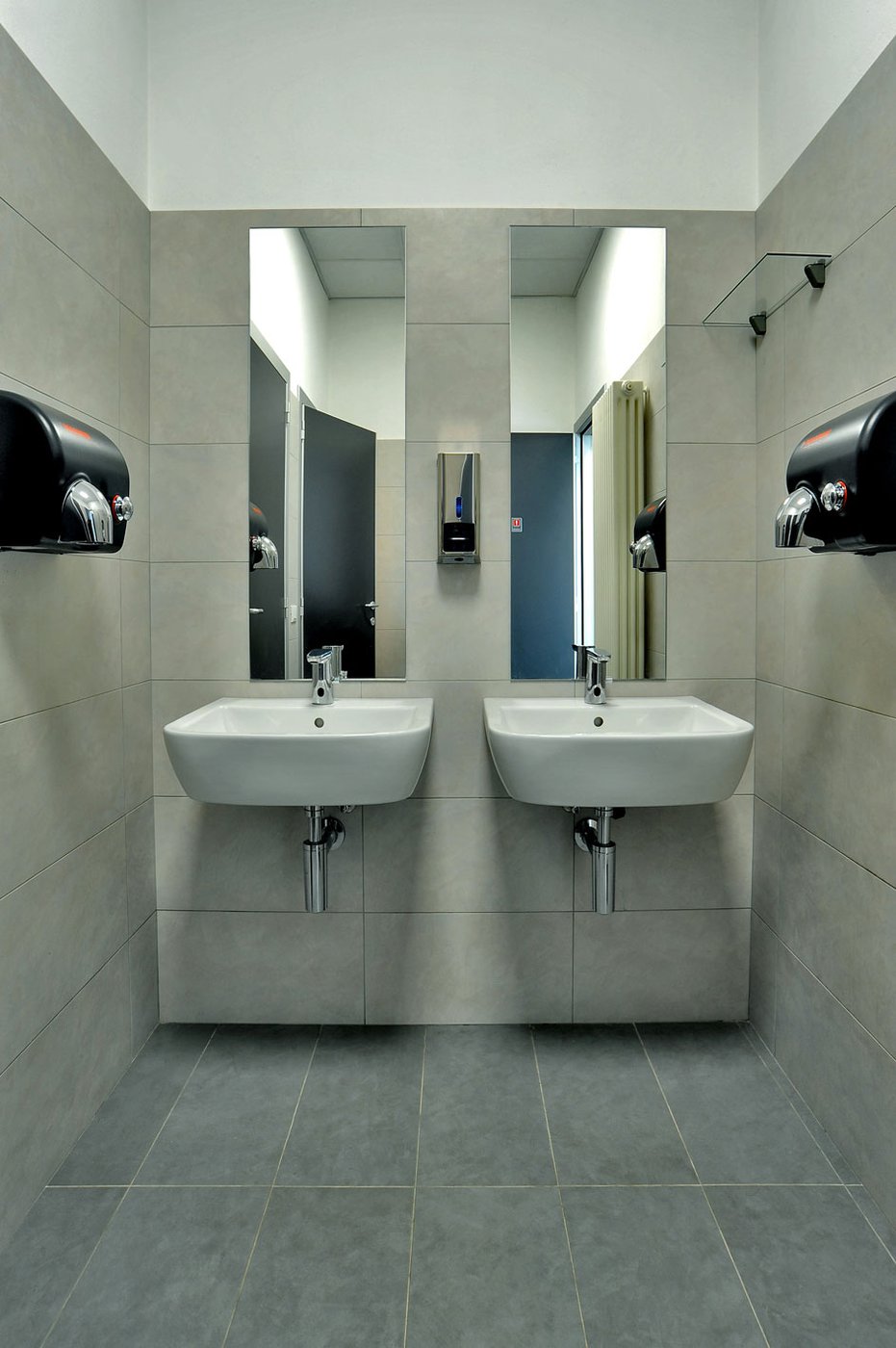 Featured in the interiors is the Work series, in a number of different shades, for a total of over 2500 square meters: from the kitchens to the offices, as well as the dining rooms and the toilets, these concrete-effect floor and wall coverings shape modern, inviting, informal settings.