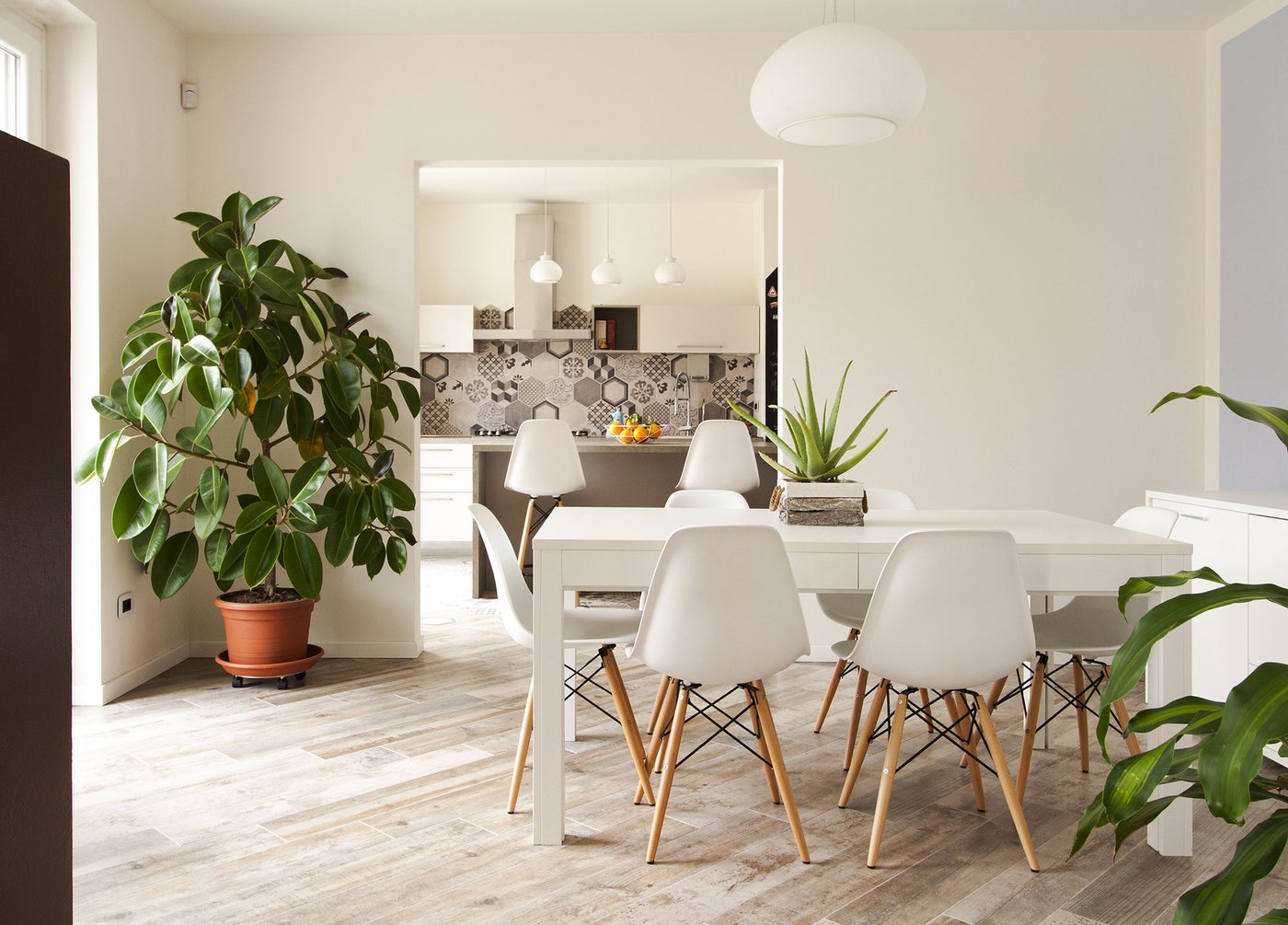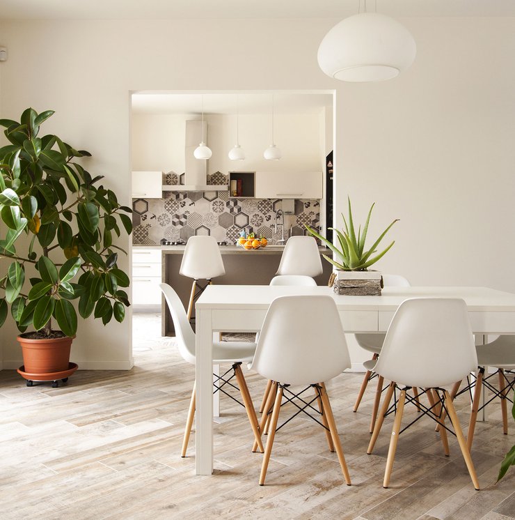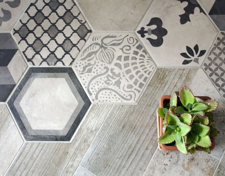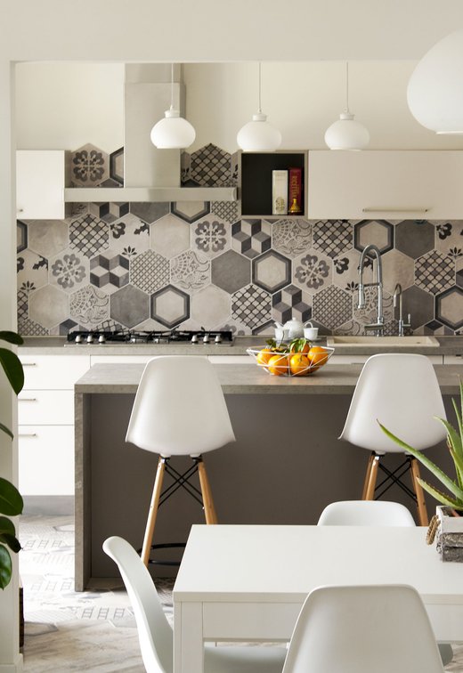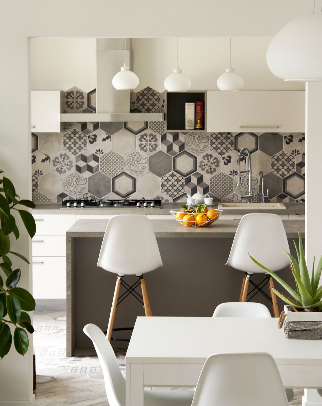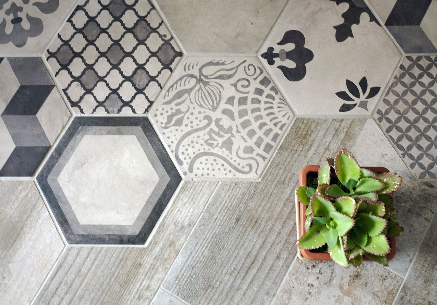 A kitchen with a modern design in Casa Monviso, embellished with an elegant wood/concrete crossover: the hexagon terracotta tiles in the Terra series are teamed with wood surfaces, creating original, trend-inspired floors. The Terra cementine tiles are also used on the wall behind the washbasin, creating immediately eye-catching, appealing geometries in shades of grey.