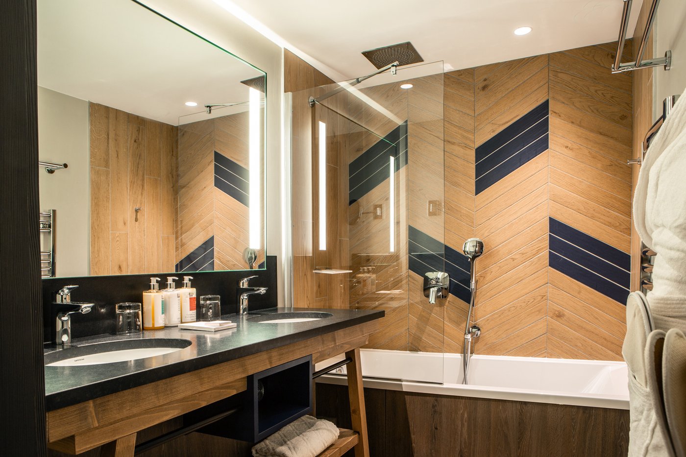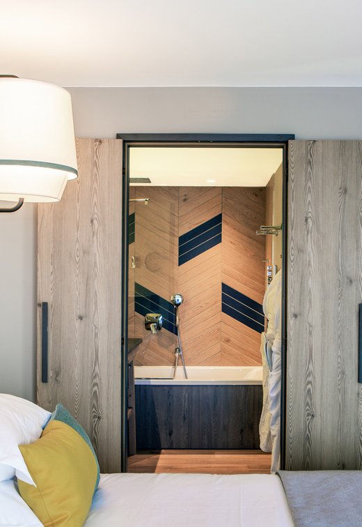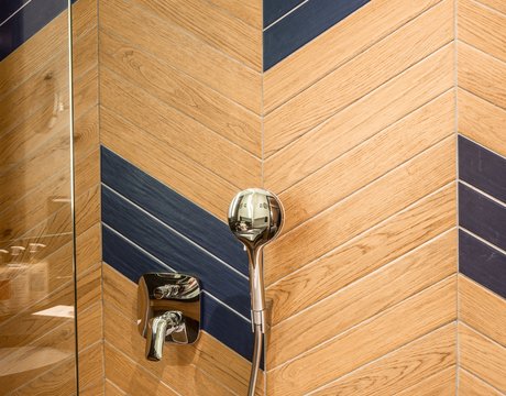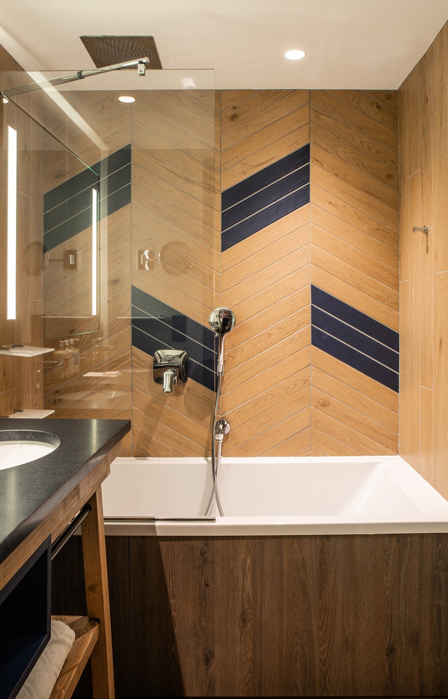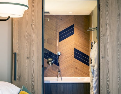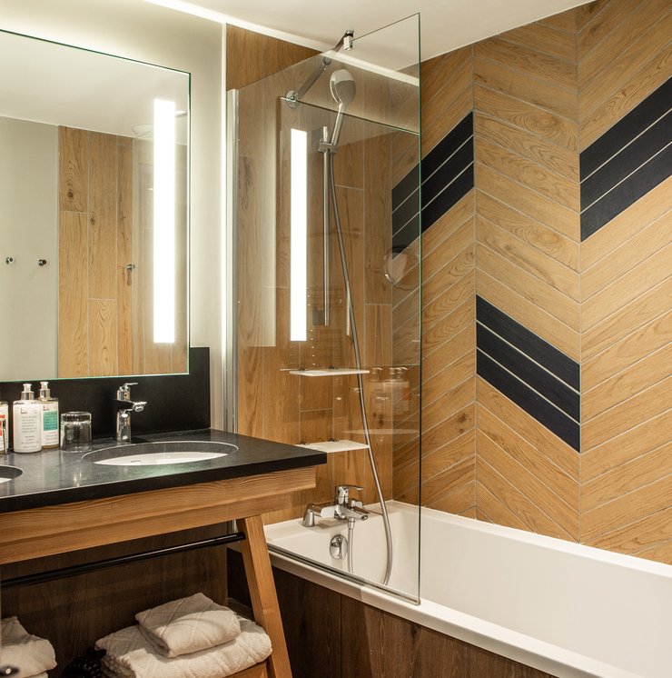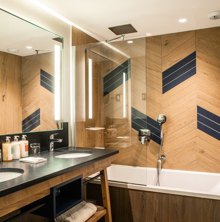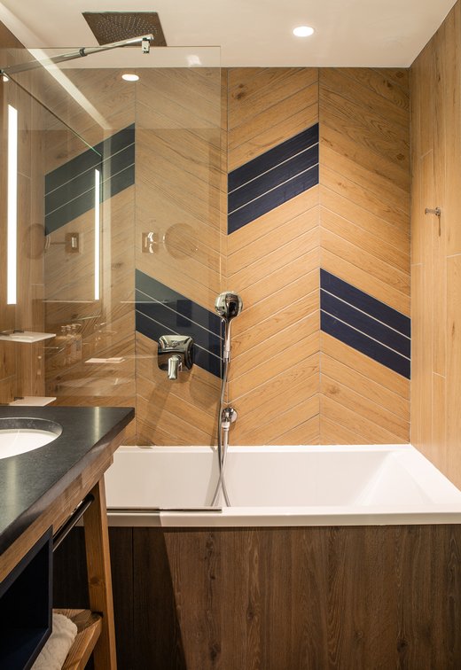 In addition to its undoubted aesthetic appeal, porcelain stoneware's resistance to bacteria, moisture and temperature sudden changes has made Lagom the most suitable choice for creating refined chevron-effect walls in the shower area, alternating between two diametrically opposed colours:- Blond and Blue-, a tribute to the colour tones of the forests and the blue symbol of Club Med Tignes.