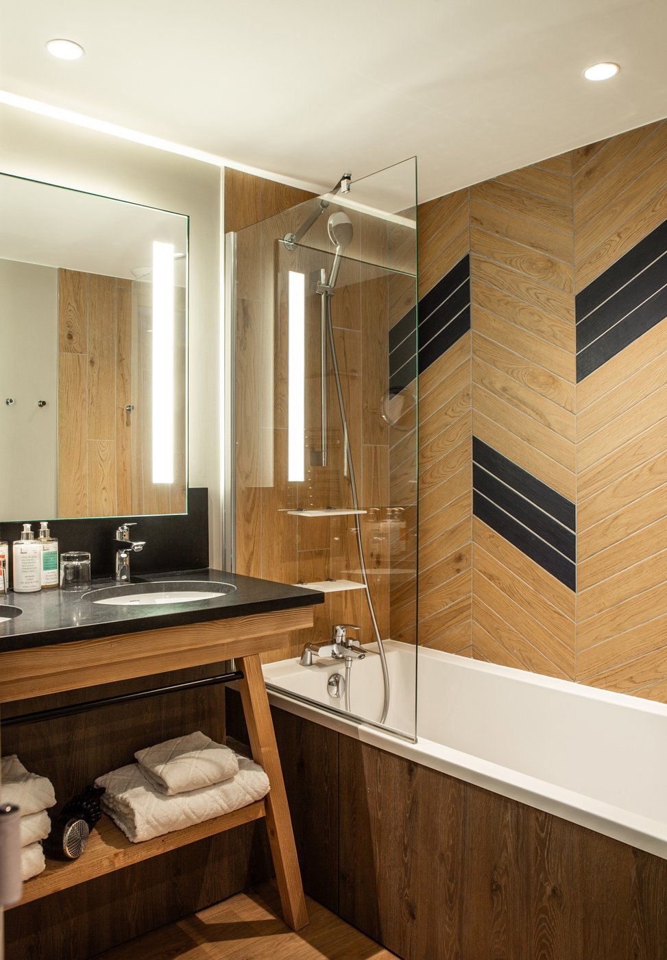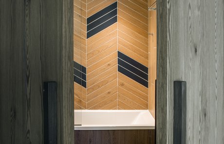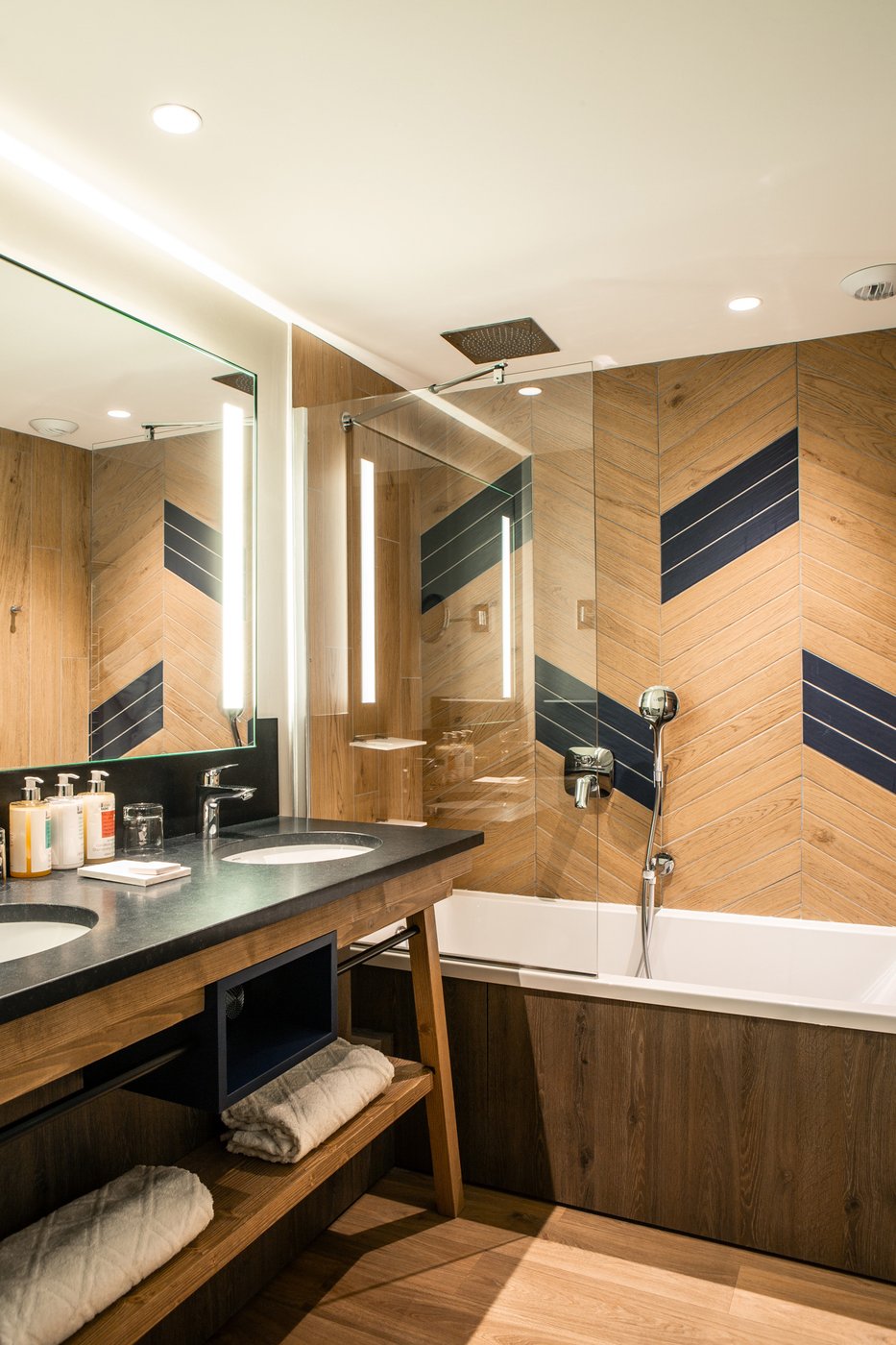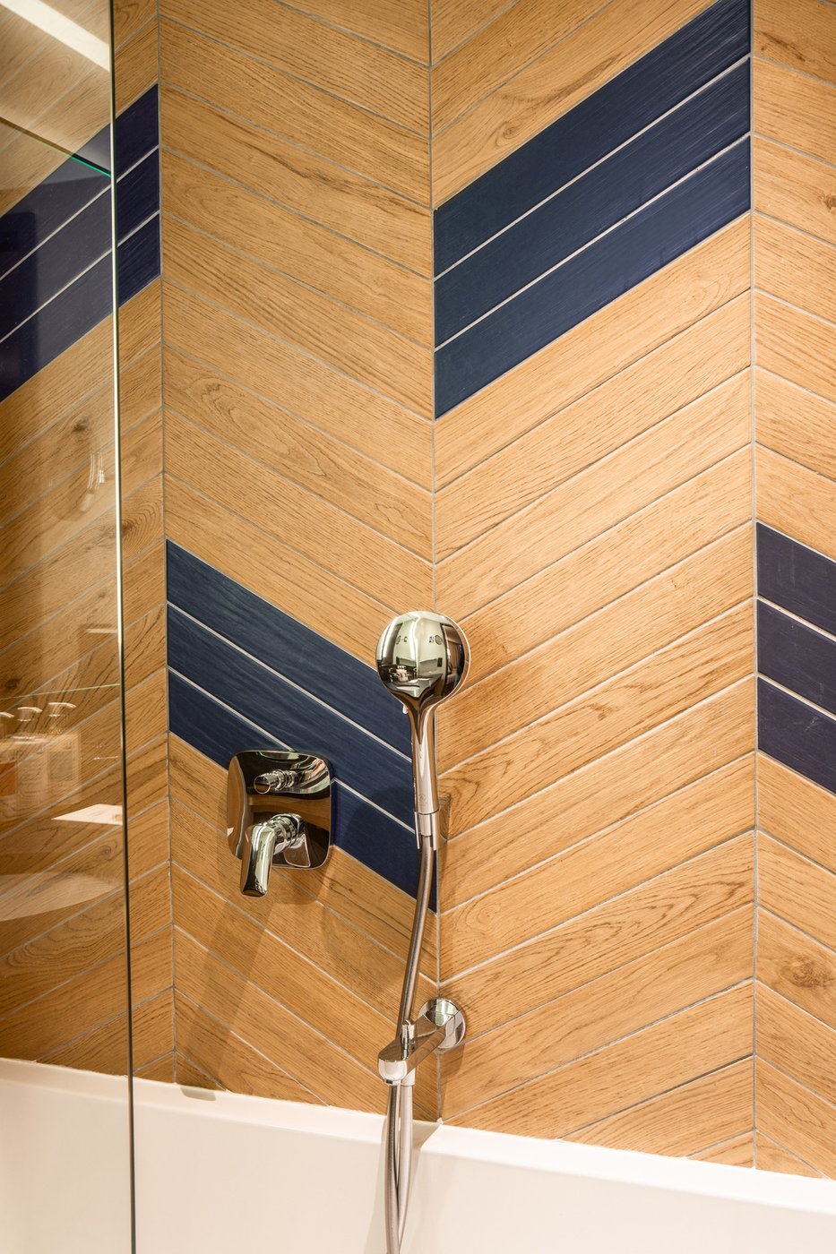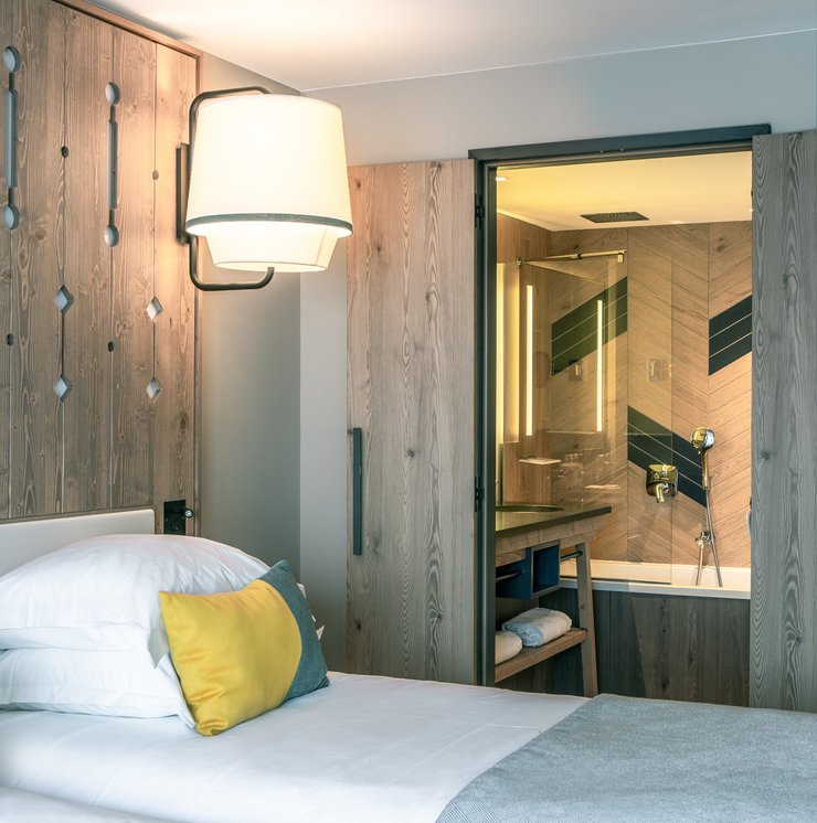 In addition to its undoubted aesthetic appeal, porcelain stoneware's resistance to bacteria, moisture and temperature sudden changes has made Lagom the most suitable choice for creating refined chevron-effect walls in the shower area, alternating between two diametrically opposed colours:- Blond and Blue-, a tribute to the colour tones of the forests and the blue symbol of Club Med Tignes.