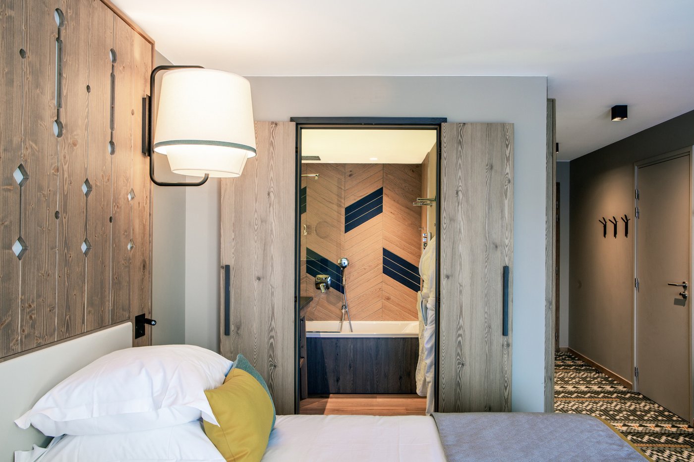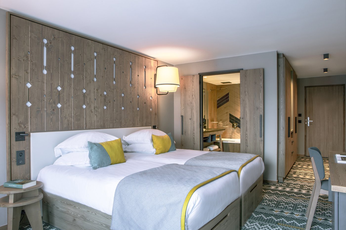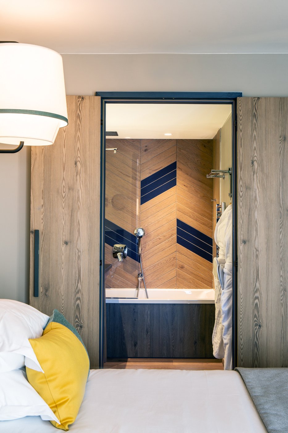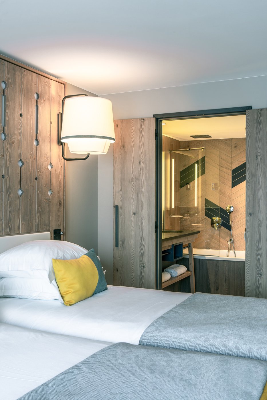 In addition to its undoubted aesthetic appeal, porcelain stoneware's resistance to bacteria, moisture and temperature sudden changes has made Lagom the most suitable choice for creating refined chevron-effect walls in the shower area, alternating between two diametrically opposed colours:- Blond and Blue-, a tribute to the colour tones of the forests and the blue symbol of Club Med Tignes.