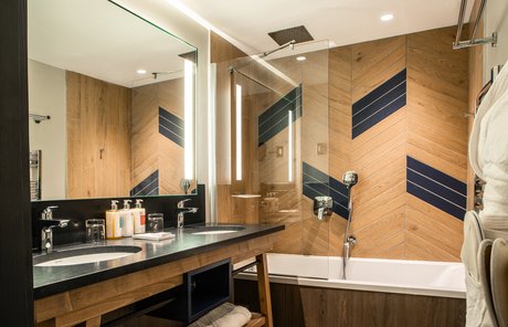 The settings are characterised by an exclusive yet informal atmosphere, thanks to furnishings where selected colours and patterns add liveliness to traditional mountain features. The elegant, light and spacious suites are an invitation to absolute relaxation and offer every comfort, including a delightful bathroom characterised by simple but exquisite furnishings, wooden tones and soothing details for the well-being of body and mind.