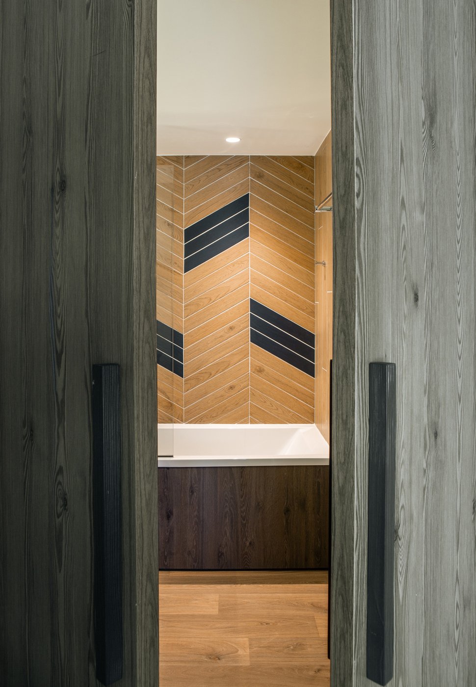 Just inside each bathroom, the wood-effect Lagom slats by Marca Corona were installed: a collection that draws on Nordic interior design and its minimalist appeal to deliver environments that are essential, but no less charming.