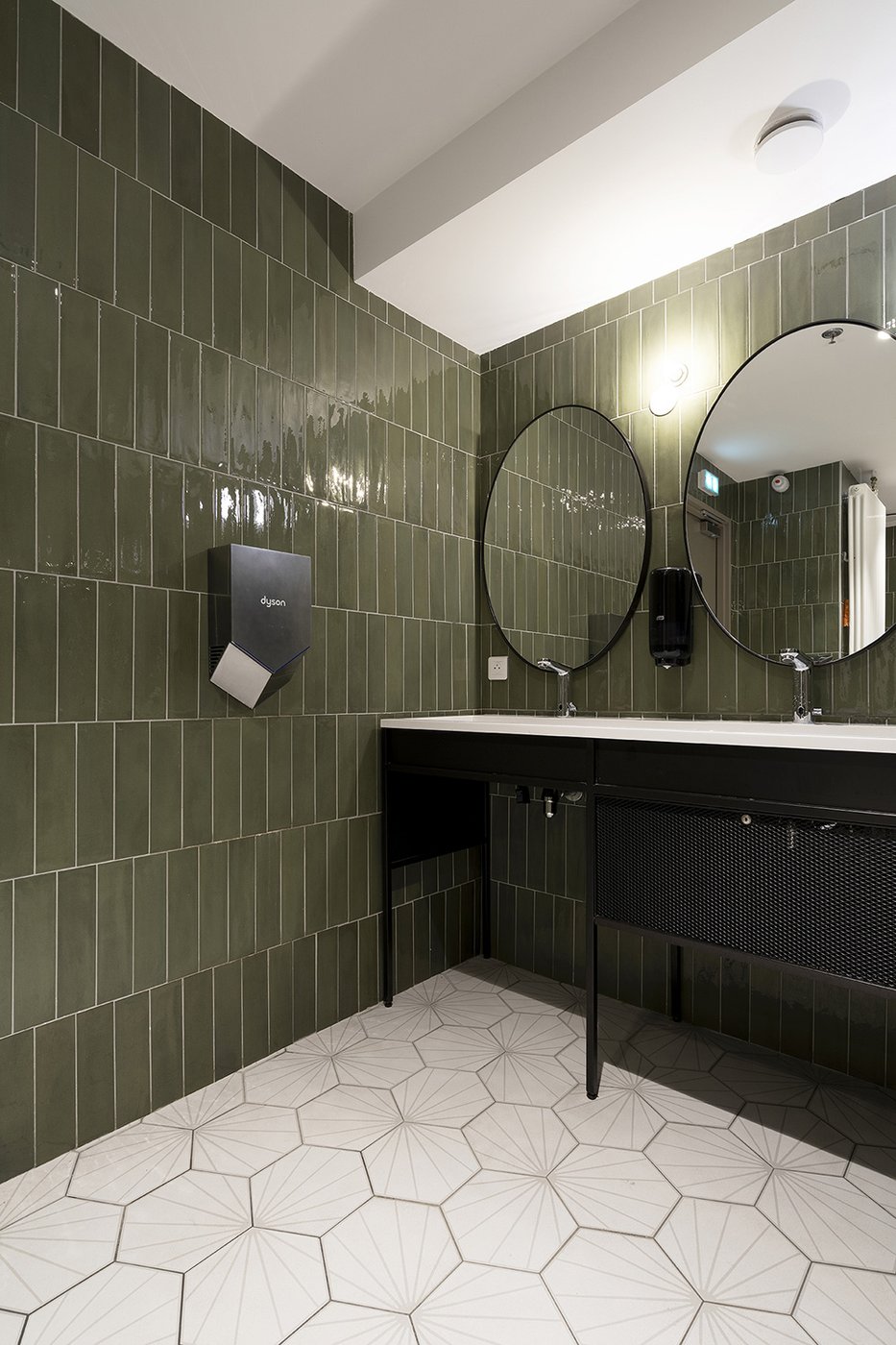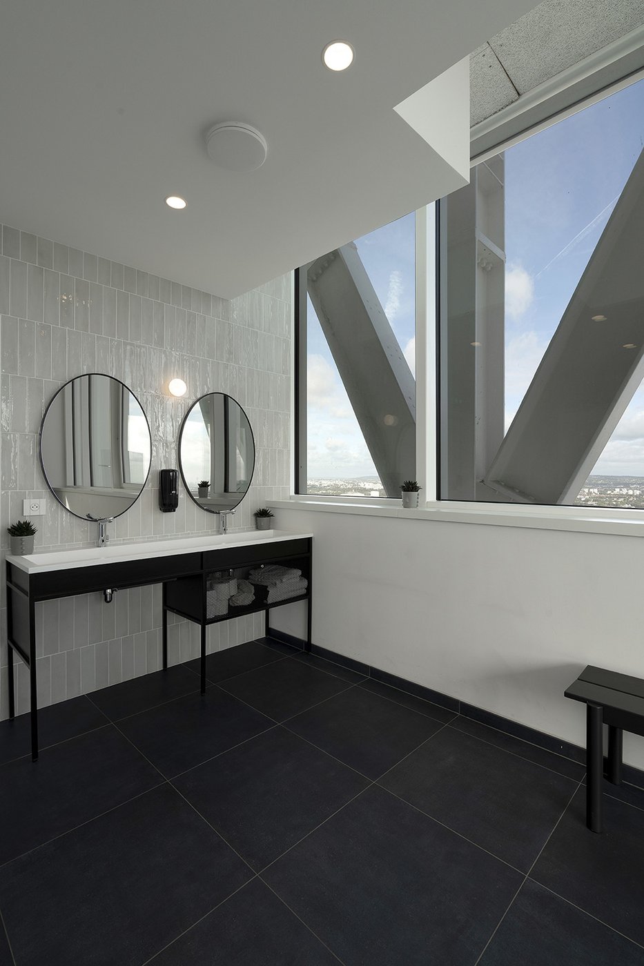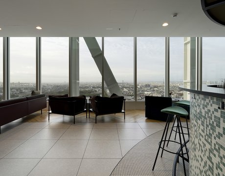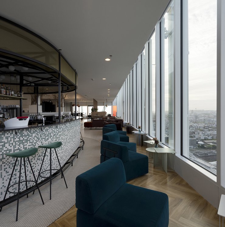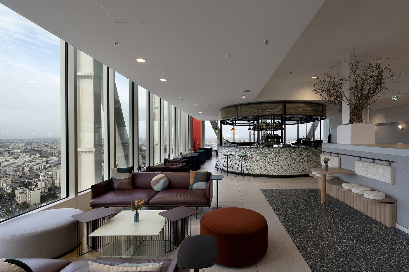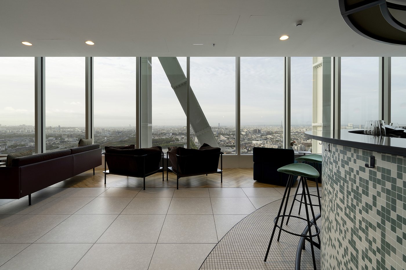 The design concept combines verticality with light-filled, fluid interiors, prioritising the visual experience and contact with the panorama across Paris. The Marca Corona ceramic surfaces were chosen for their versatility, as they are versatile in materials and sizes and able to adapt to vertical and horizontal spaces and damp areas.