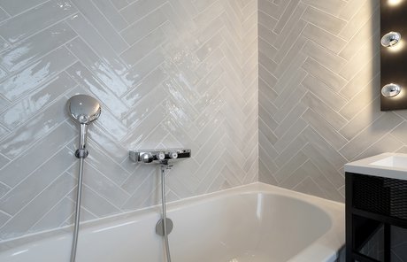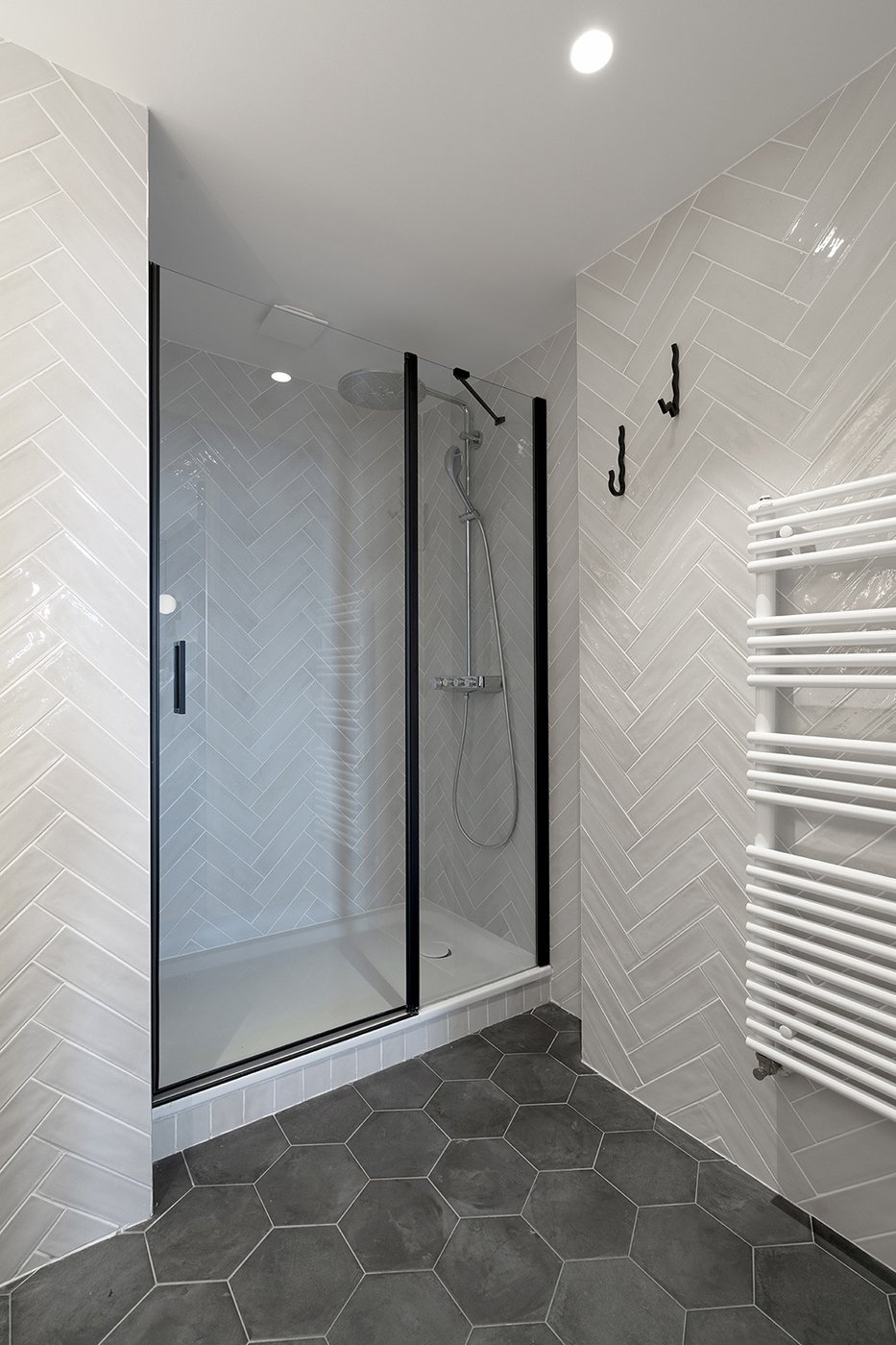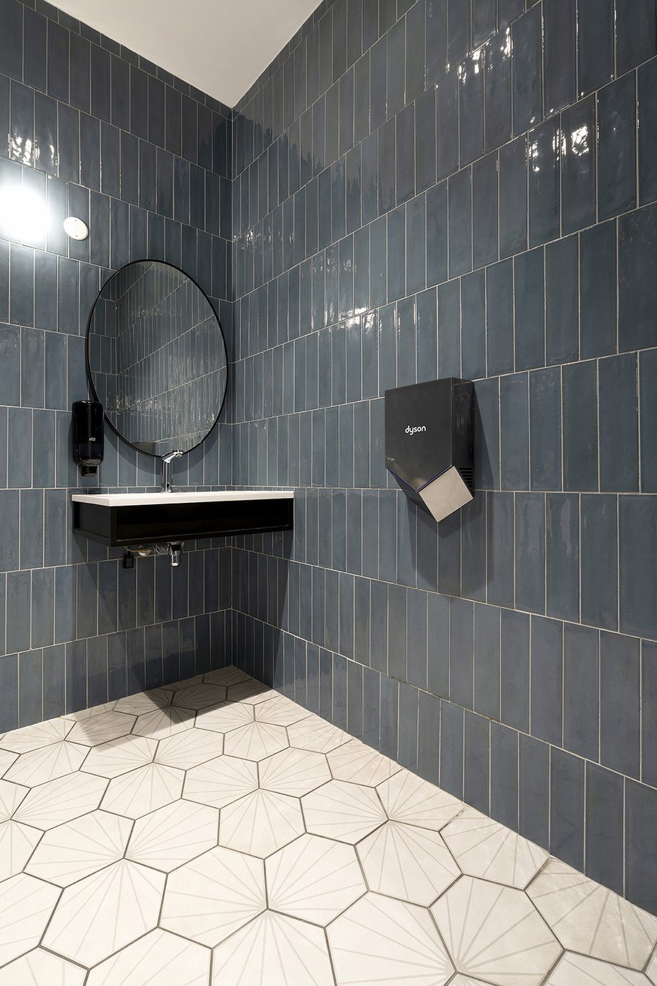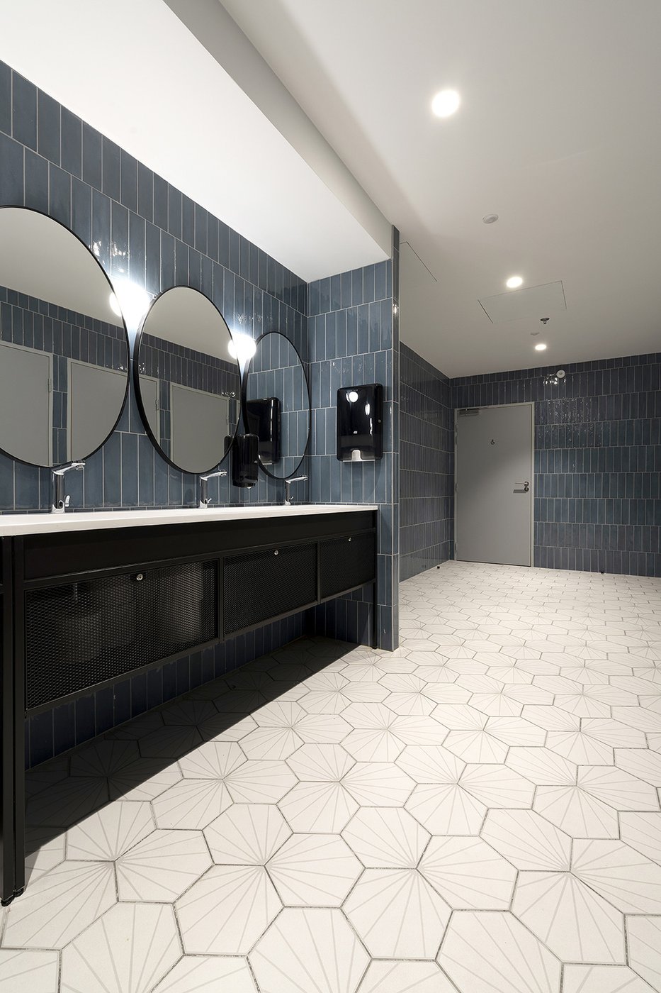 The washrooms have a stronger graphic and tactile personality provided by the Paprica hexagonal tiles and Terra Grigio highlights, while the indoor finishes feature the lovely, delicate Multiforme Gaata and Giada colours.