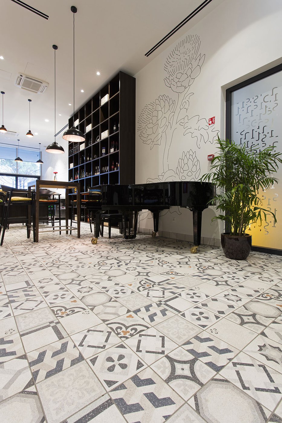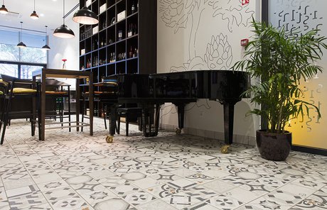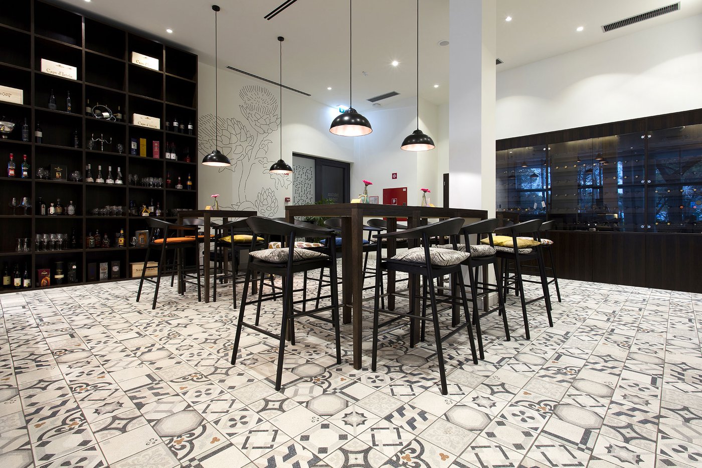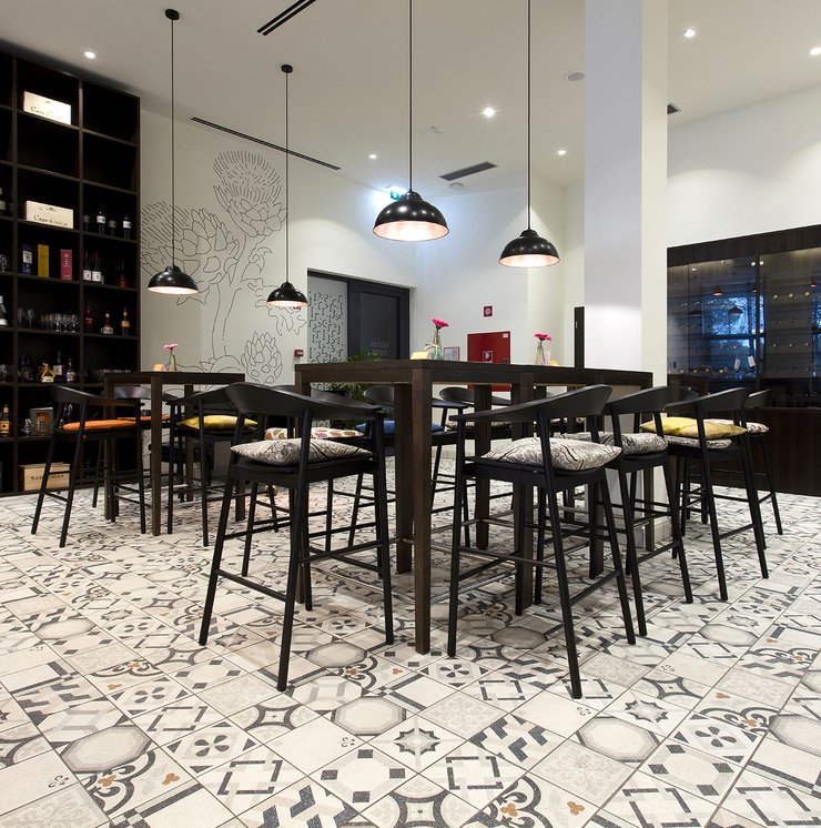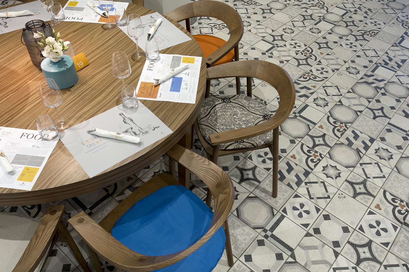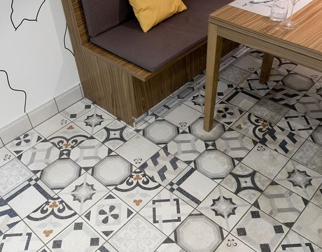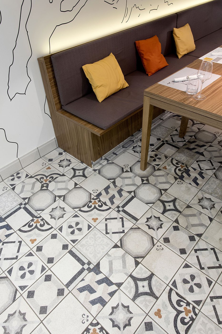 Istrian Bistro & Tapas Bar is a venue with an authentic flavour, right in the centre of Portorož: the country-style stone effect retro tiles Forme are the perfect choice for this simple, informal eatery. In the dining room, the accent is on the “terrazzo” effect, and the numerous decor elements in the collection have been used to create an original, decorative carpet-style surface, featuring the 20x20 size. The same decor mix is also found on the walls of the kitchen and in the bar area.