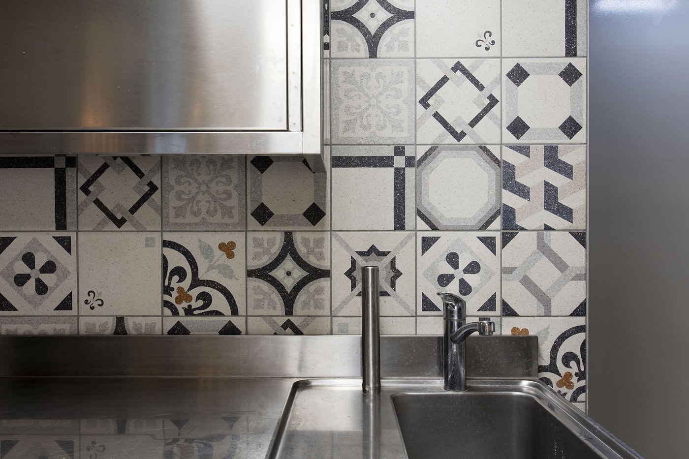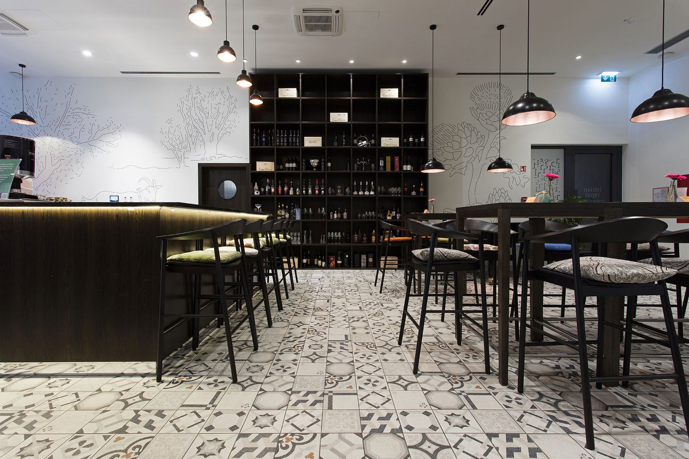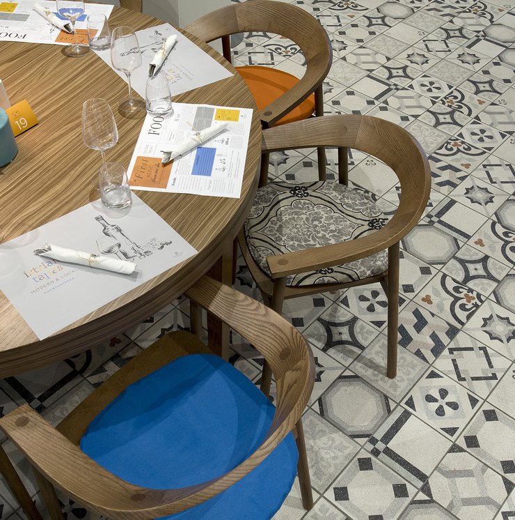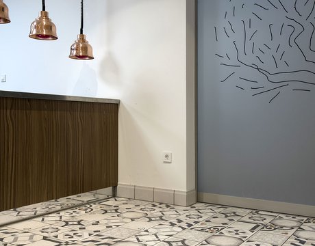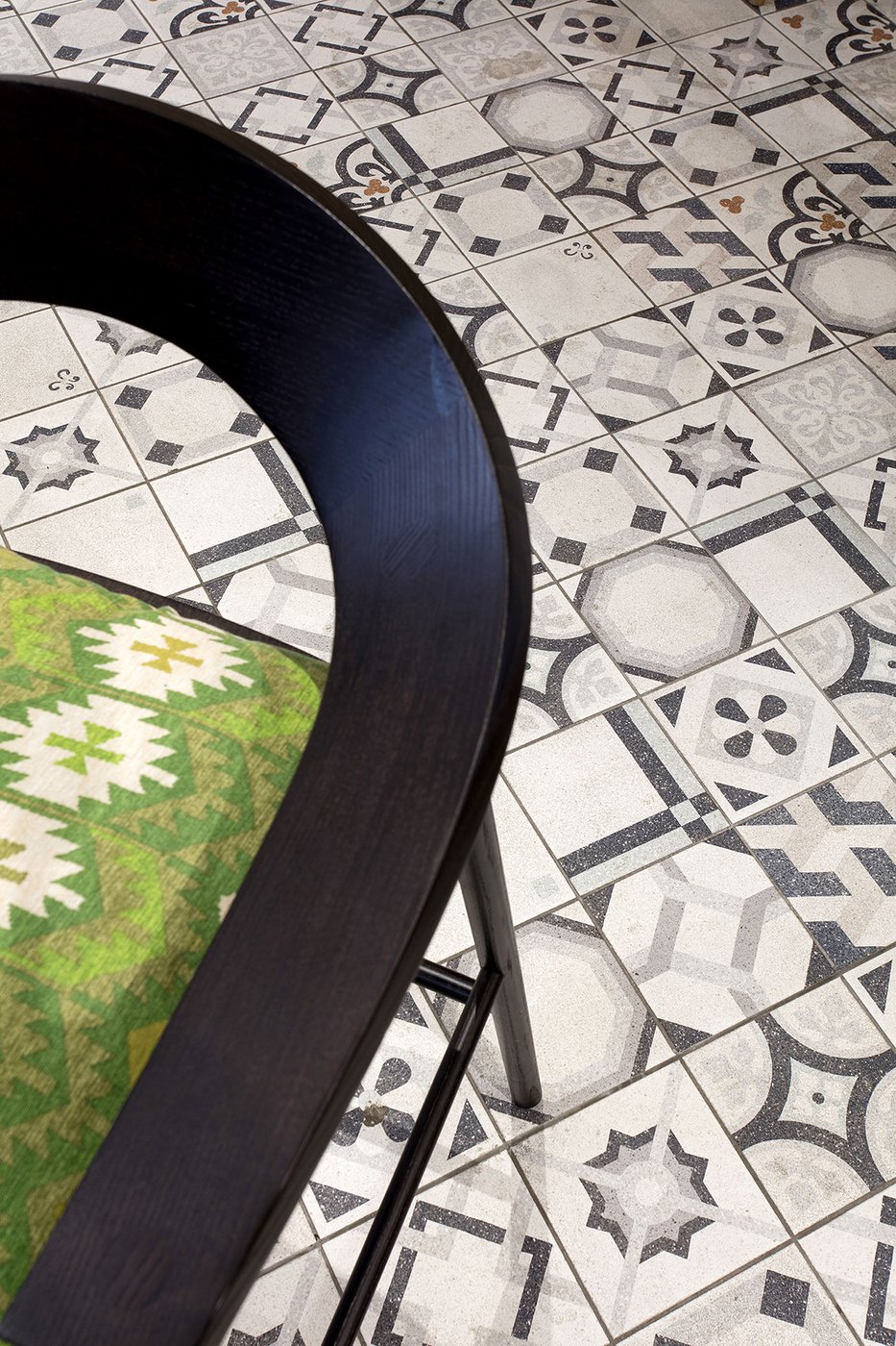Istrian Bistro & Tapas Bar is a venue with an authentic flavour, right in the centre of Portorož: the country-style stone effect retro tiles Forme are the perfect choice for this simple, informal eatery. In the dining room, the accent is on the “terrazzo” effect, and the numerous decor elements in the collection have been used to create an original, decorative carpet-style surface, featuring the 20x20 size. The same decor mix is also found on the walls of the kitchen and in the bar area.