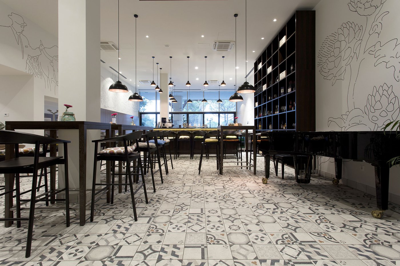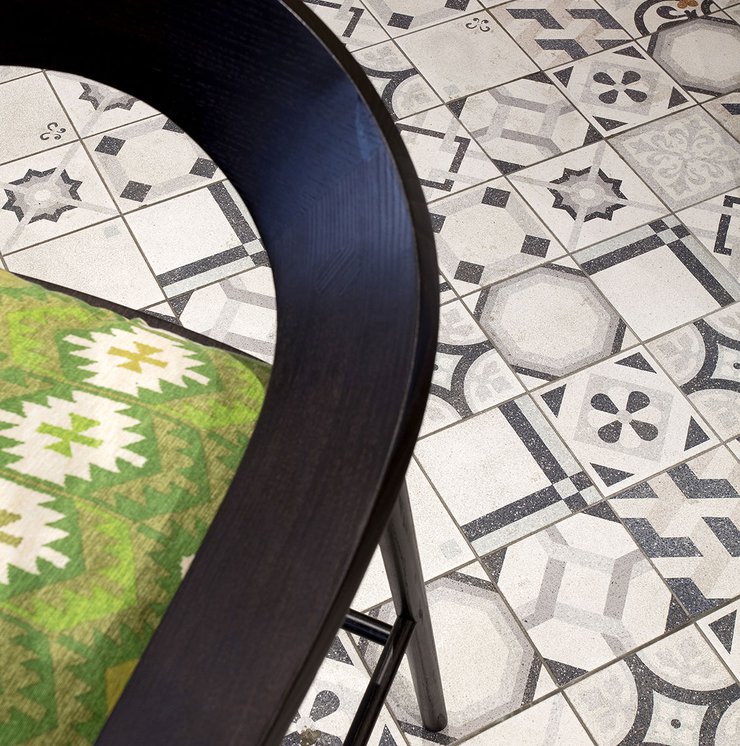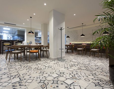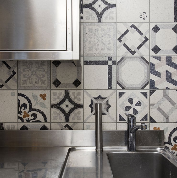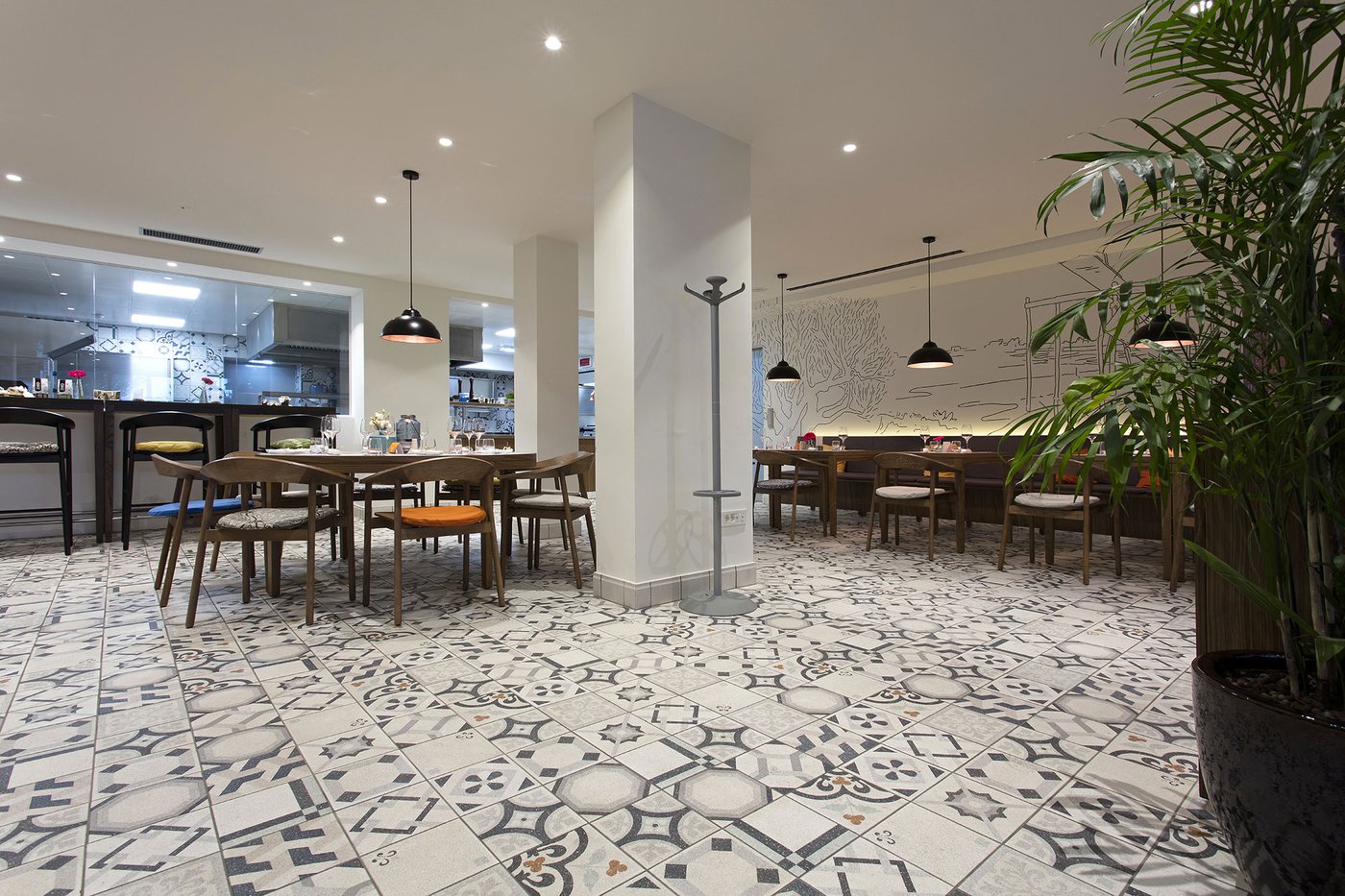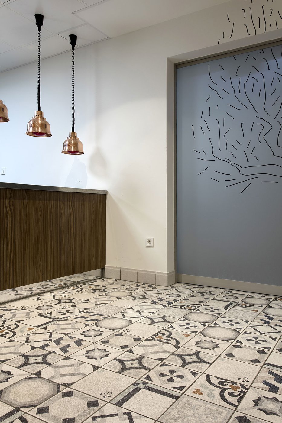 Istrian Bistro & Tapas Bar is a venue with an authentic flavour, right in the centre of Portorož: the country-style stone effect retro tiles Forme are the perfect choice for this simple, informal eatery. In the dining room, the accent is on the “terrazzo” effect, and the numerous decor elements in the collection have been used to create an original, decorative carpet-style surface, featuring the 20x20 size. The same decor mix is also found on the walls of the kitchen and in the bar area.