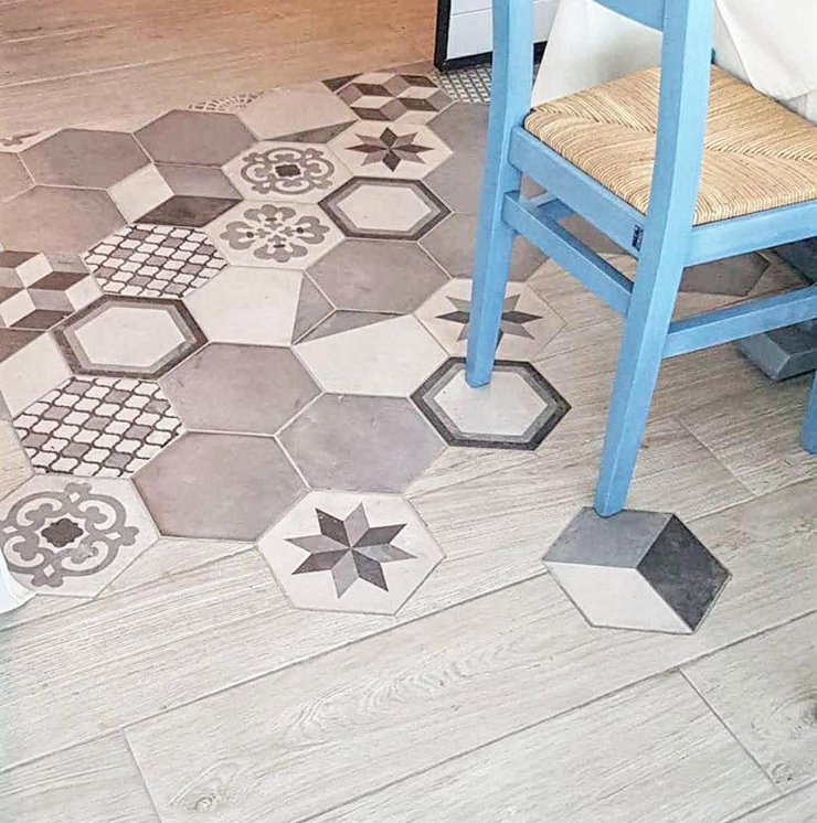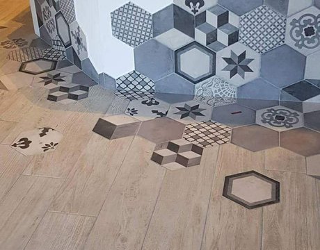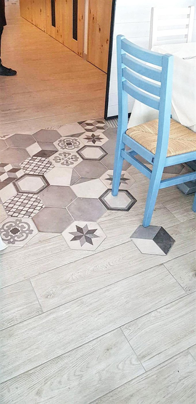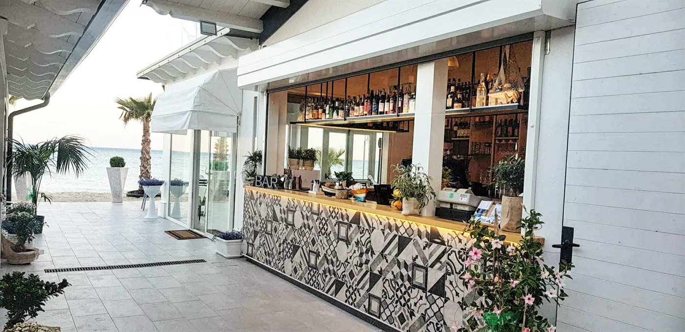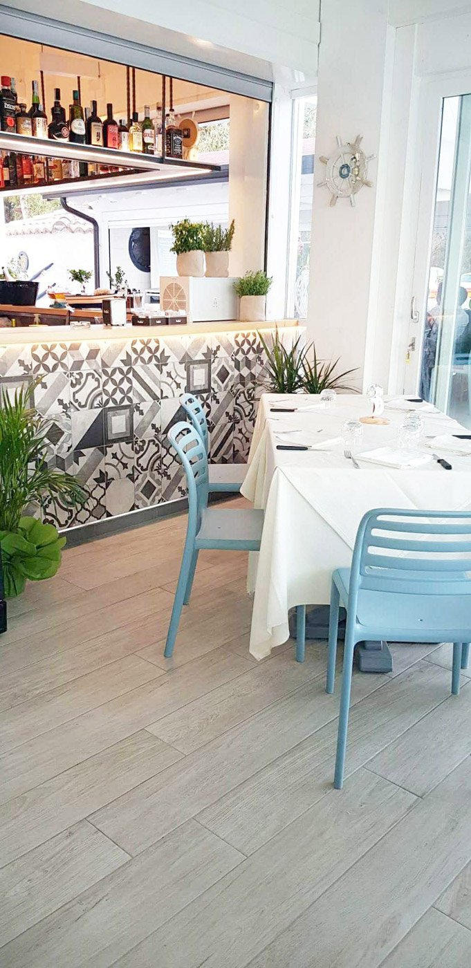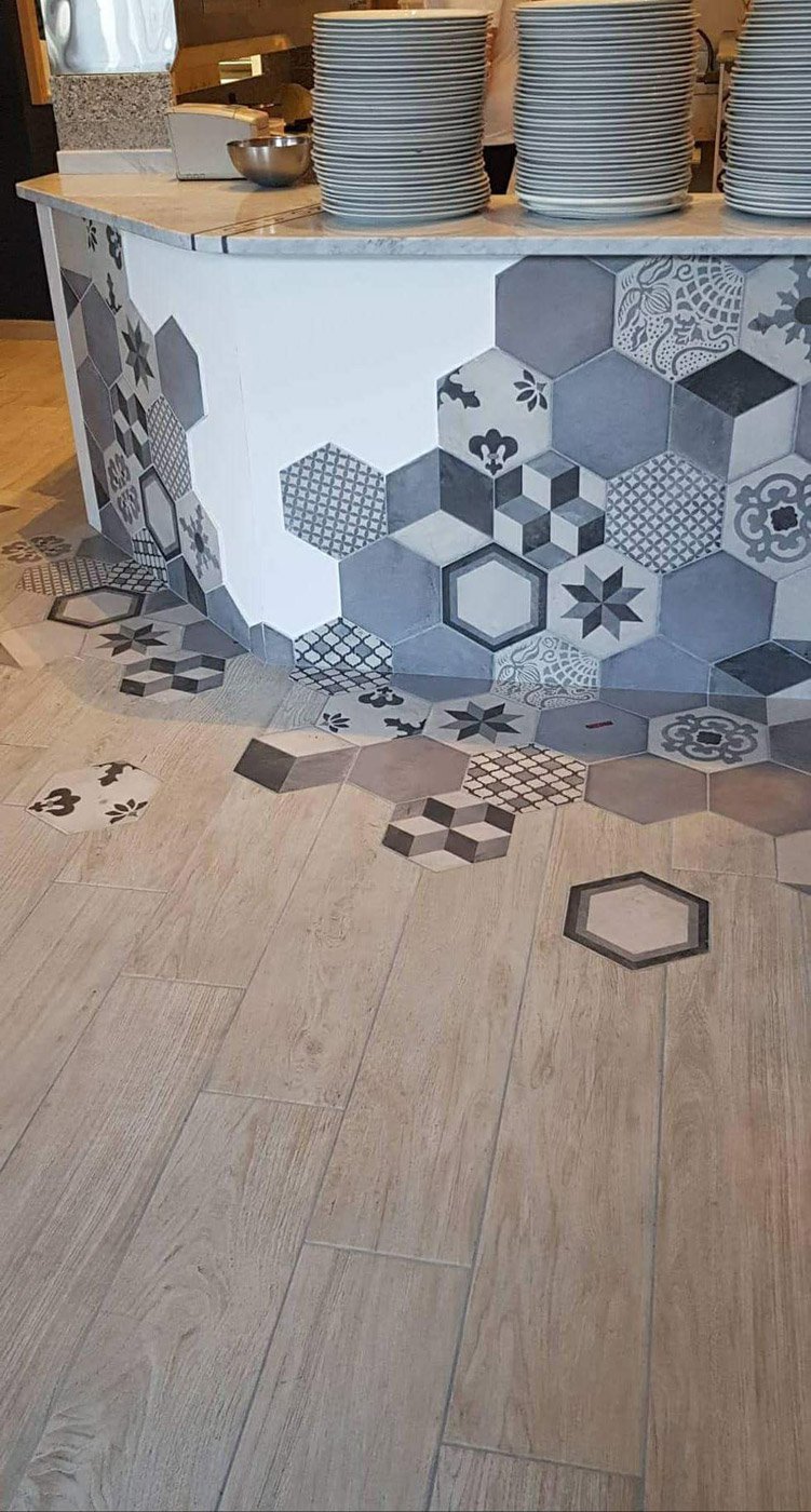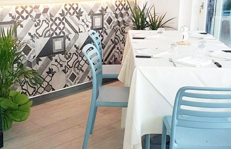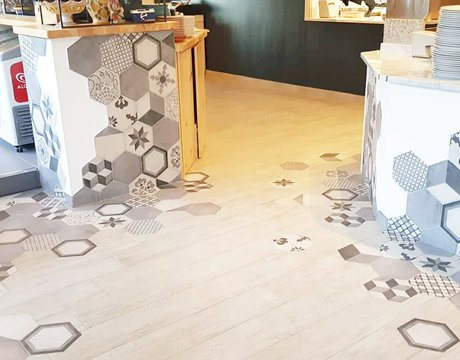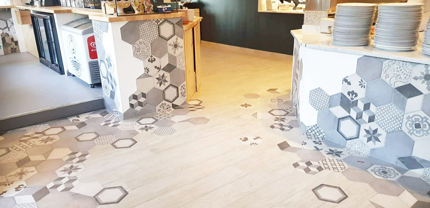 In Lido Faro Blu - a new restaurant on the Ionian sea - customers are welcomed by Terra ornamental tiles, proposed in a modern mix & match with natural wood. Marca Corona concrete effect surfaces were used for the floor and wall, in the hexagonal format and 20x20, in the main room, in the bar area and around the pizza oven.