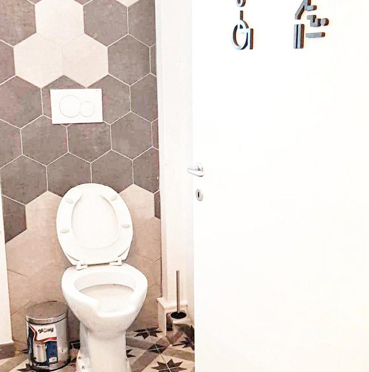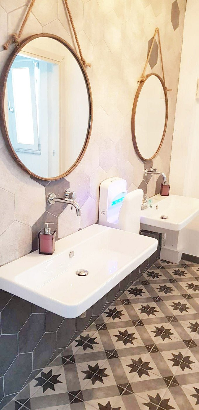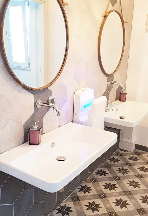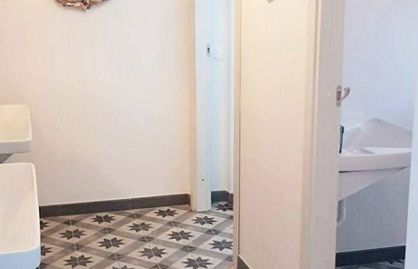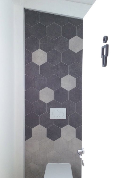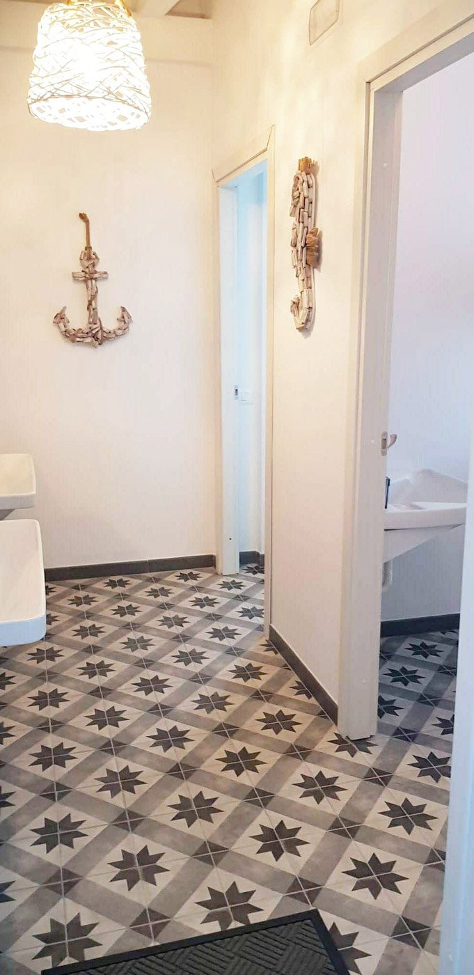 The anthracite colored tiles are alternated with the Mix Decori F to create a fresh and enveloping decorative carpet. In the toilets, instead, the focus is on the Stella 20x20 decoration alone, alongside the fabric effect floor tiles TexTile, the innovative Marca Corona fabric effect series.