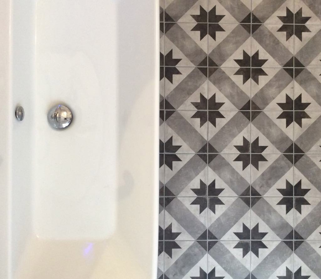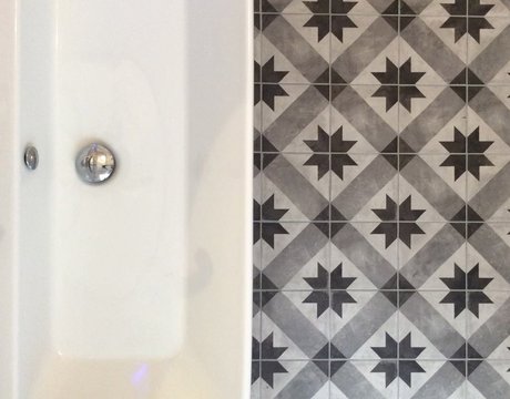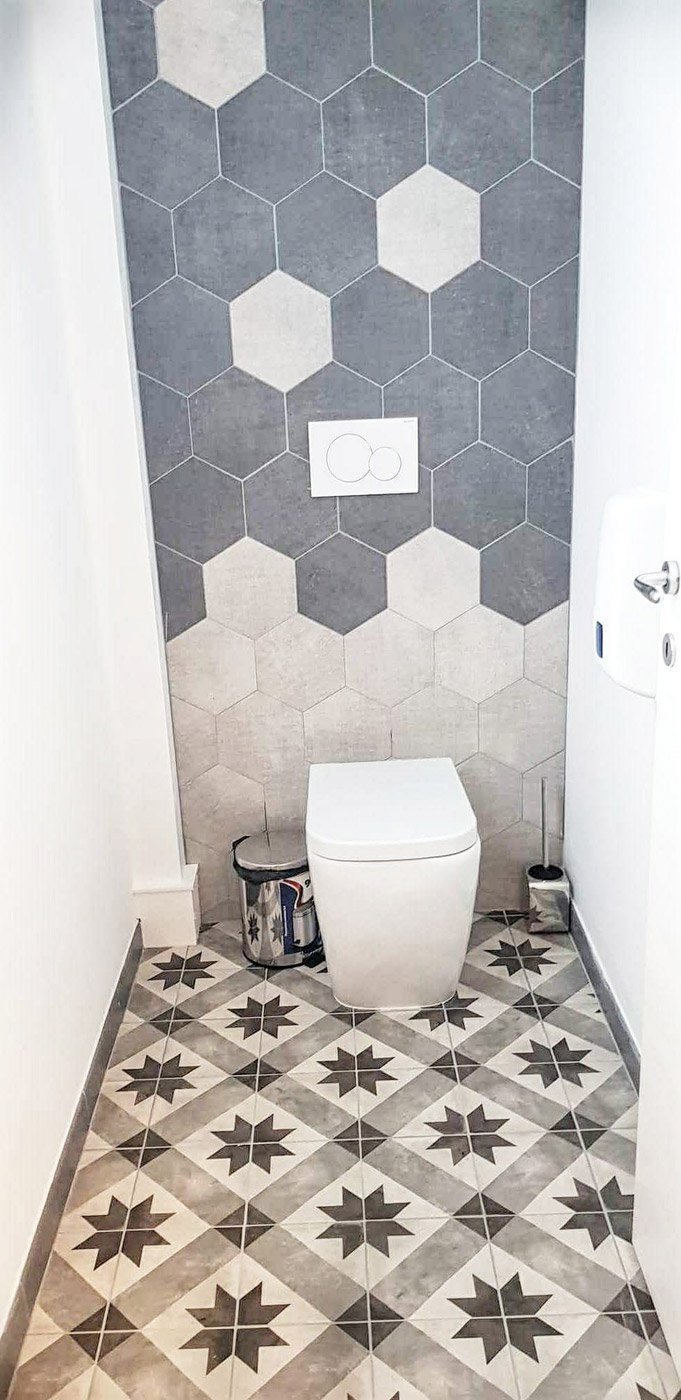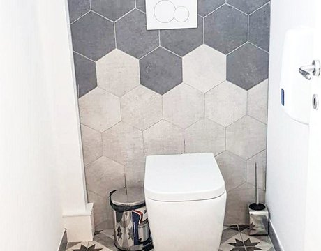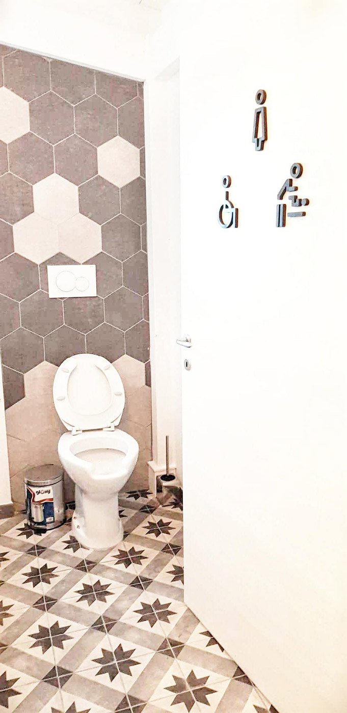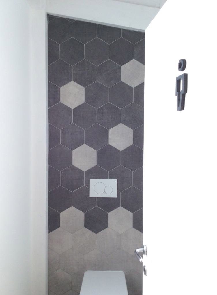 The anthracite colored tiles are alternated with the Mix Decori F to create a fresh and enveloping decorative carpet. In the toilets, instead, the focus is on the Stella 20x20 decoration alone, alongside the fabric effect floor tiles TexTile, the innovative Marca Corona fabric effect series.