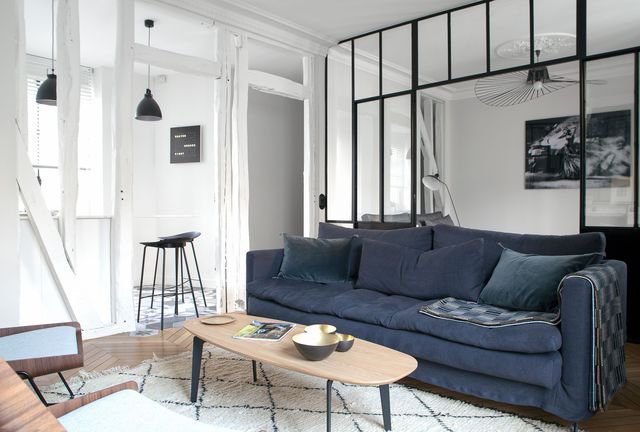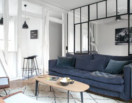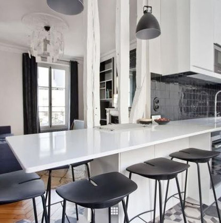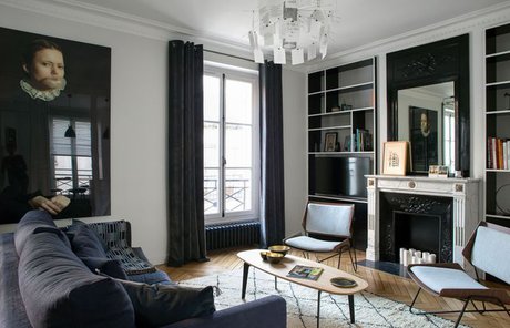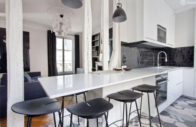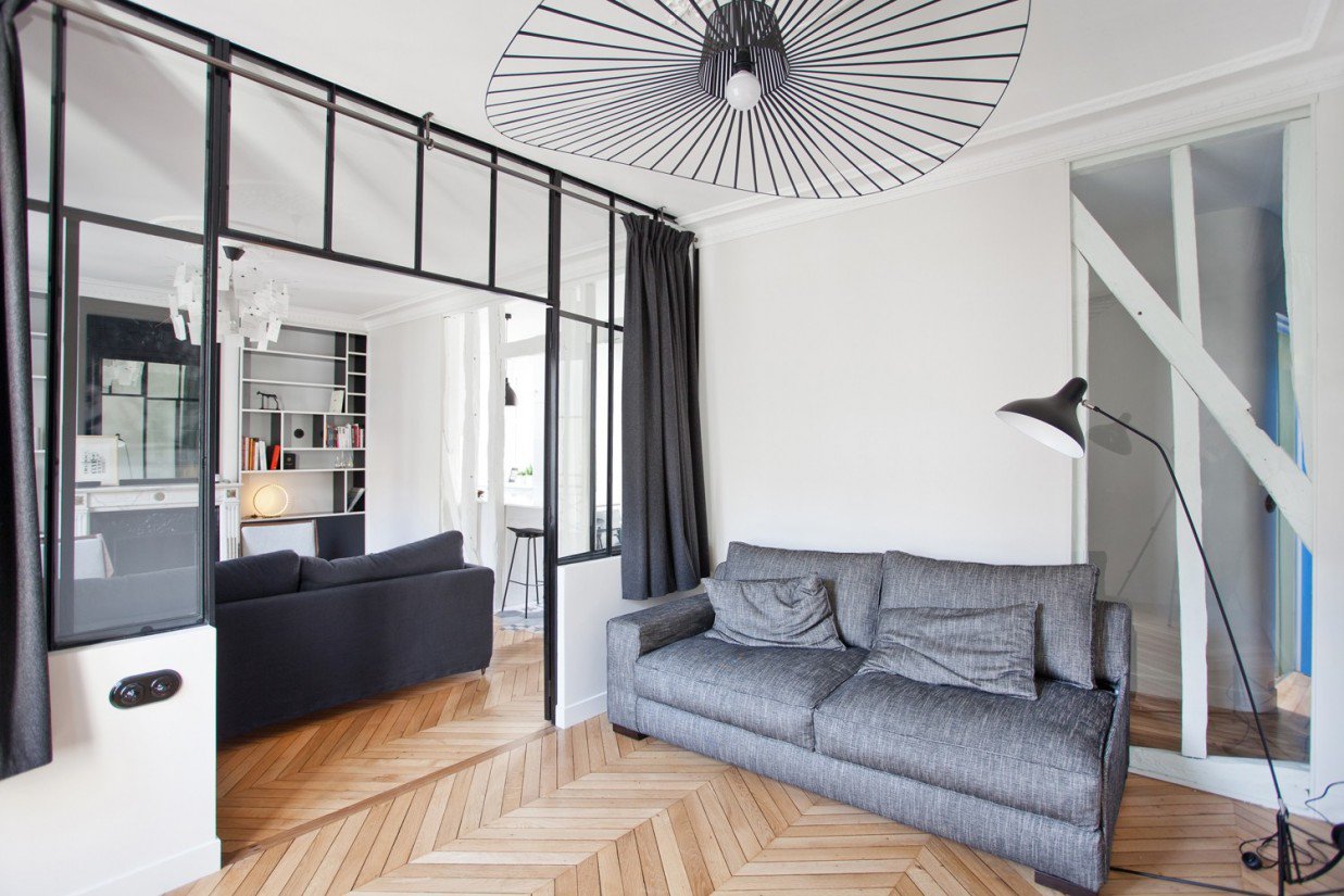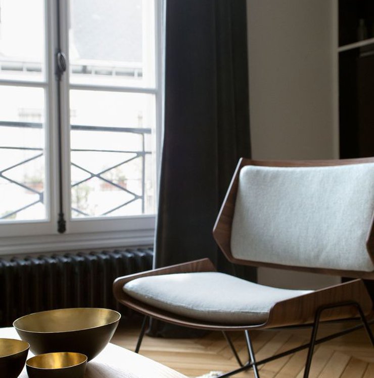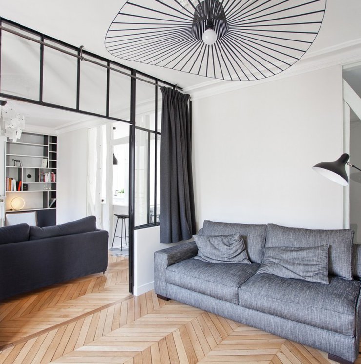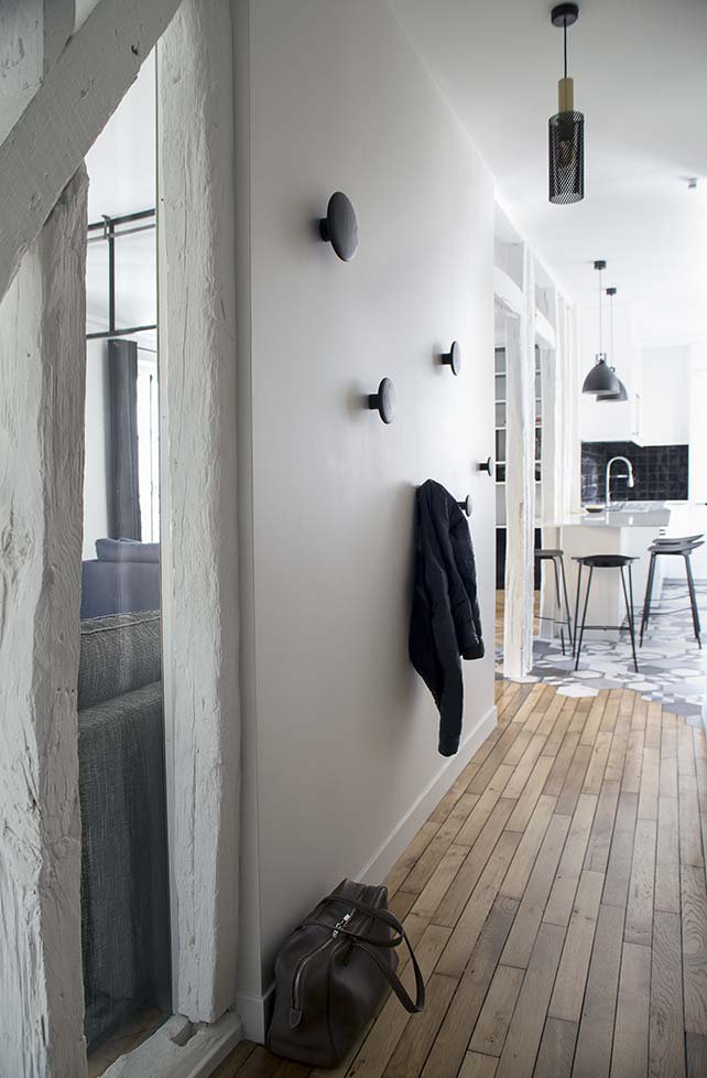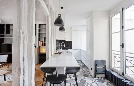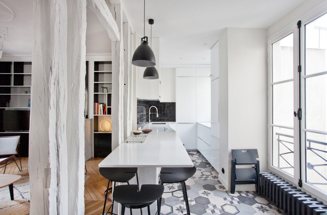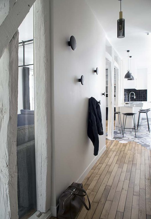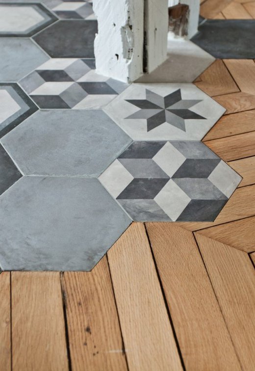 For the renovation of this apartment in the sixième arrondissement in Paris, the Ouest Home architecture firm chose the hexagon terracotta tiles from the Terra series, used to turn the kitchen into an elegant composition of grey shades featuring original graphic details that engage beautifully with the parquet flooring in the living area.