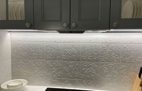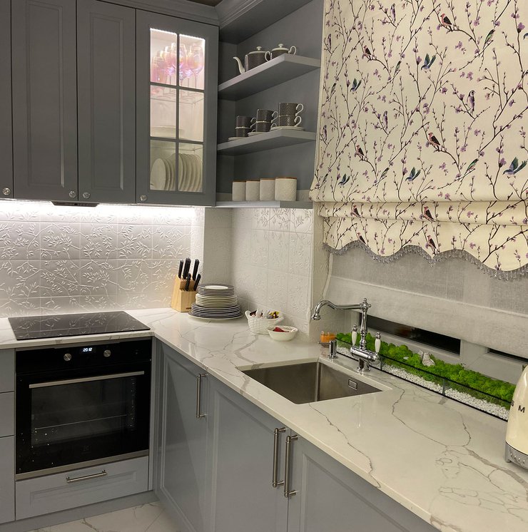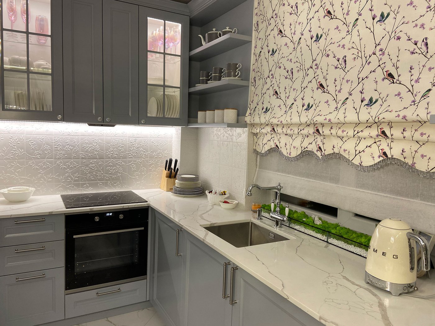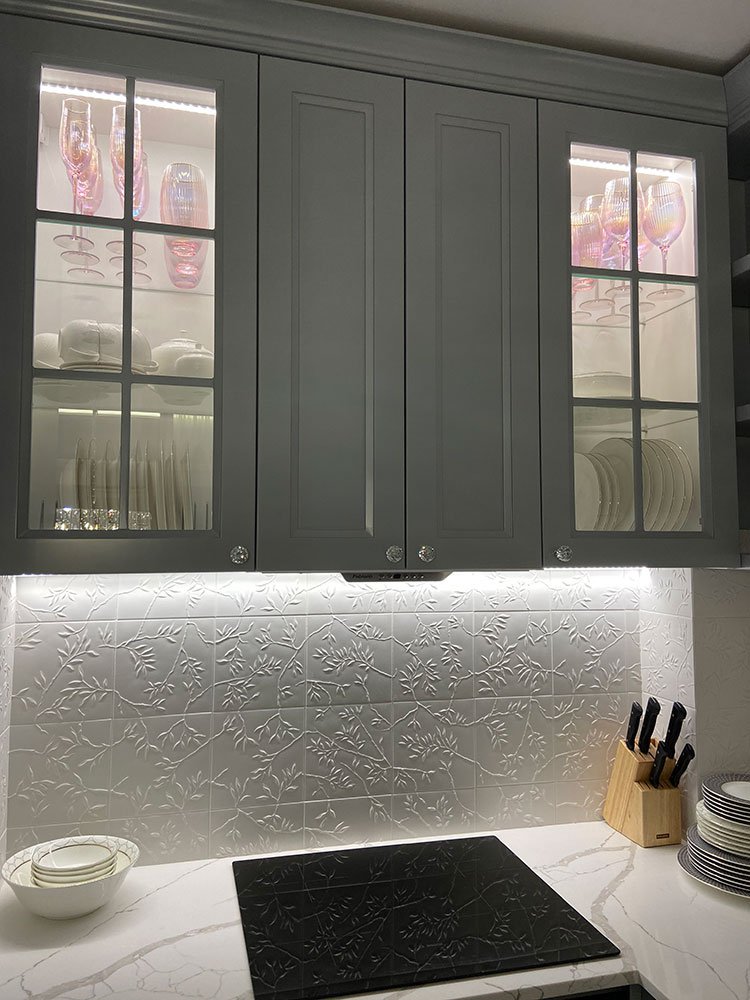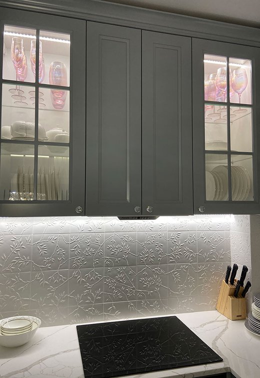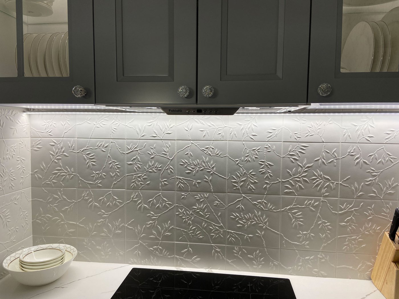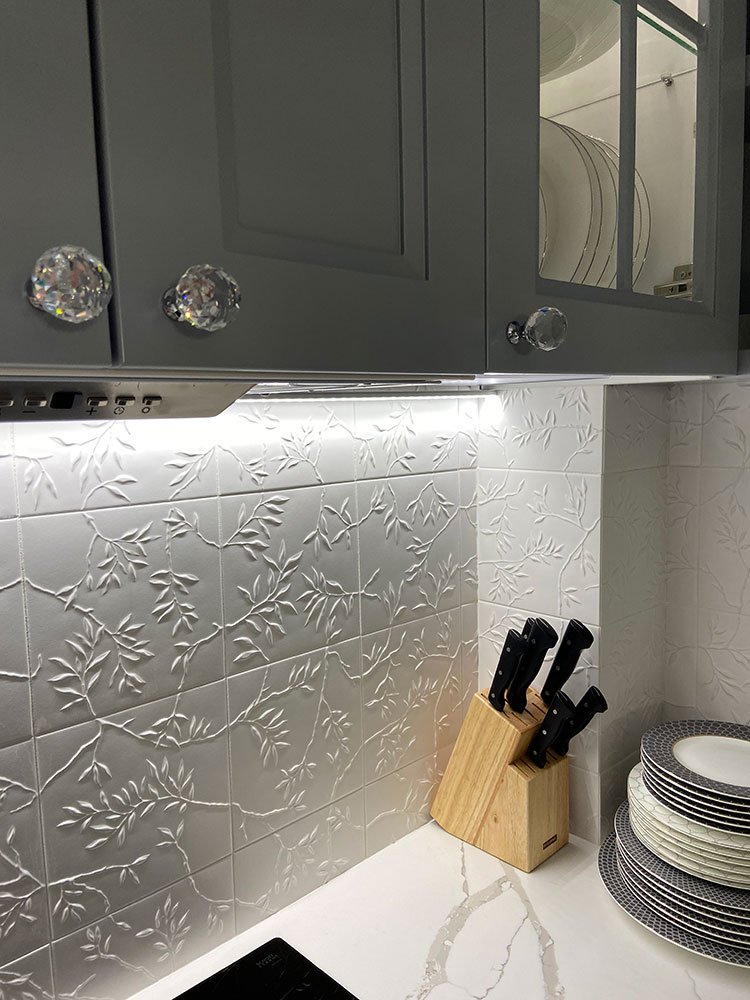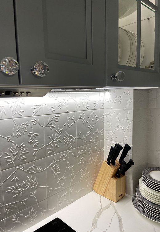 Luxury furnishings, glam details and Italian-made ceramics were chosen to enrich the new Vorontsovski Apartment private residence. In the kitchen, the most lived-in and loved room in the home, we find the 4D coverings by Marca Corona, used as a splash guard behind the sink and along the whole counter top. Incredibly sophisticated in the shade of White, the Nature three-dimensional relief tiles add a very exclusive and refined touch.