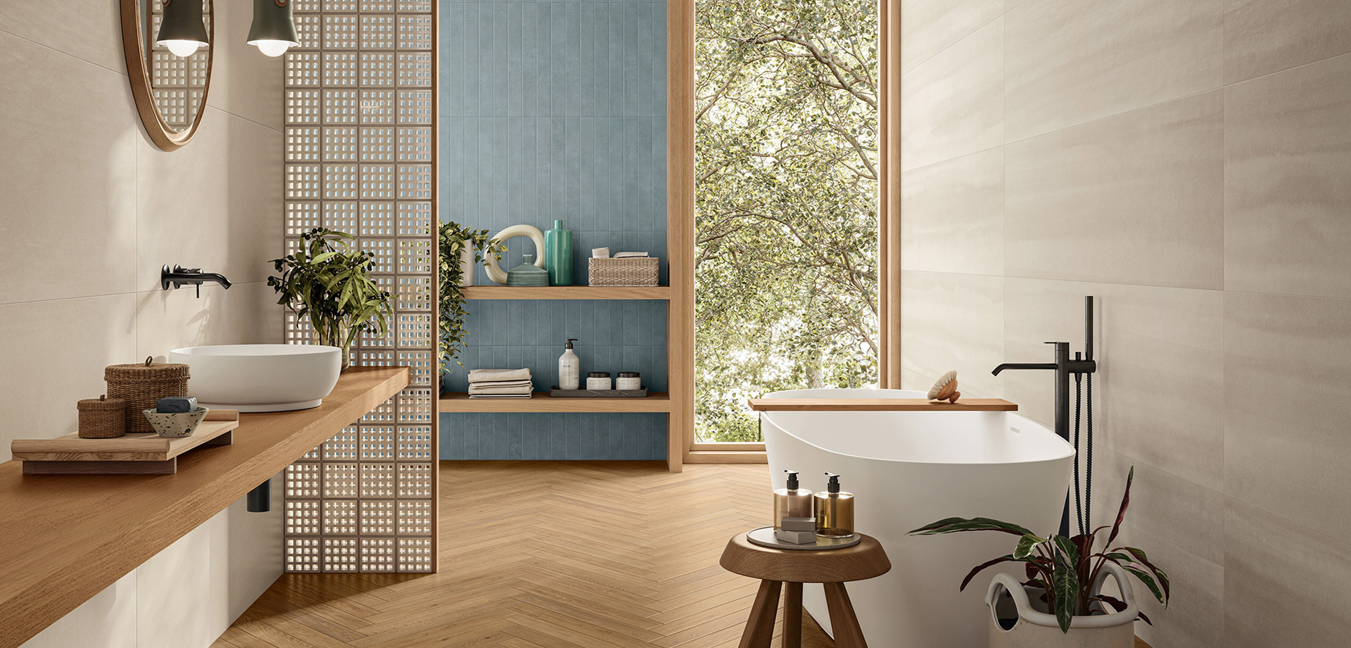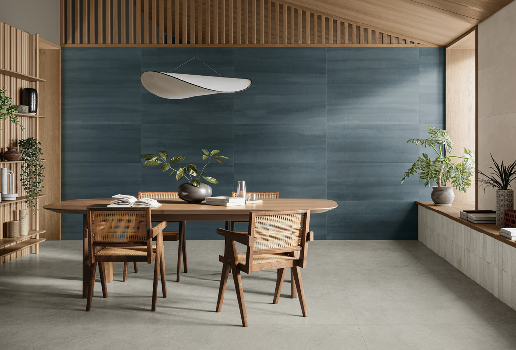 El formato 50x120 cm, fácil de mover y colocar, ayuda a vestir los espacios con continuidad reduciendo las juntas visibles. El aspecto ligeramente ondulado confiere un efecto material agradable al tacto, mientras que la resistencia de la cerámica de pasta blanca garantiza durabilidad y facilidad de mantenimiento.