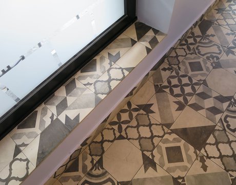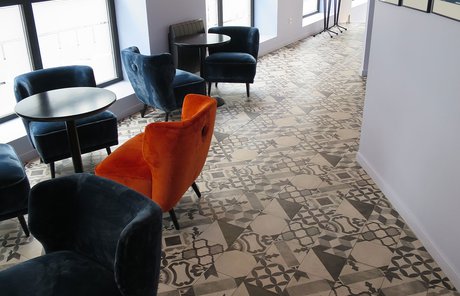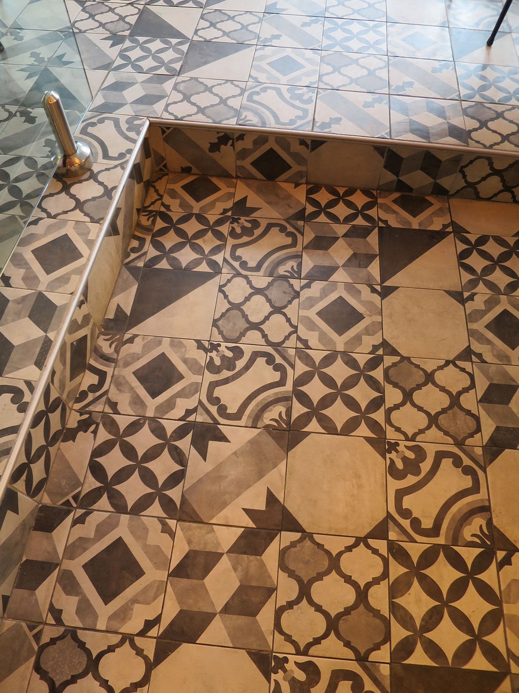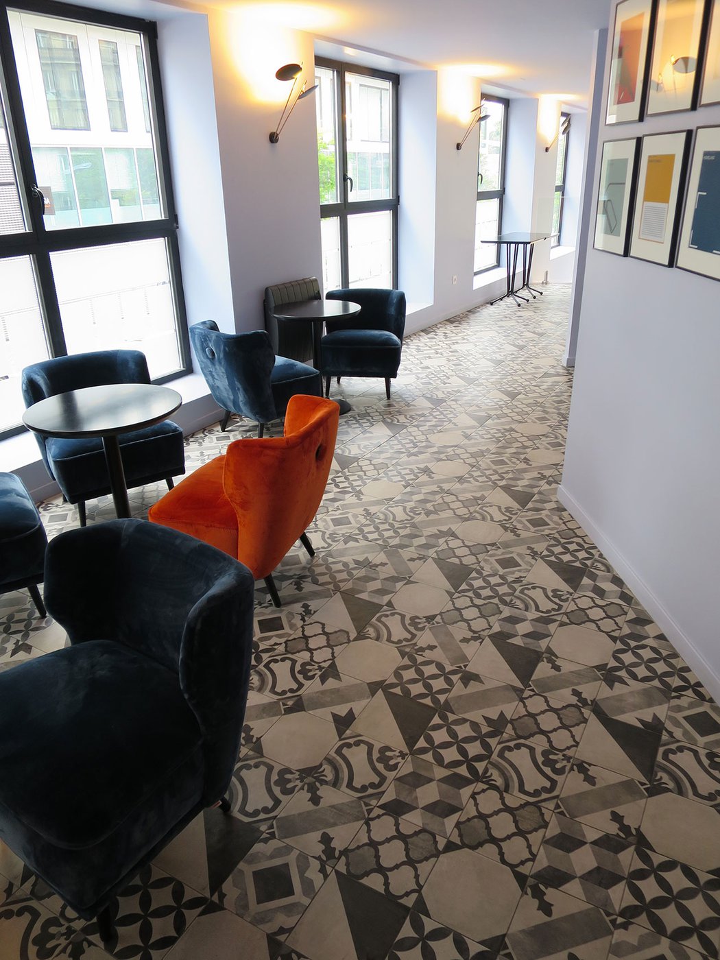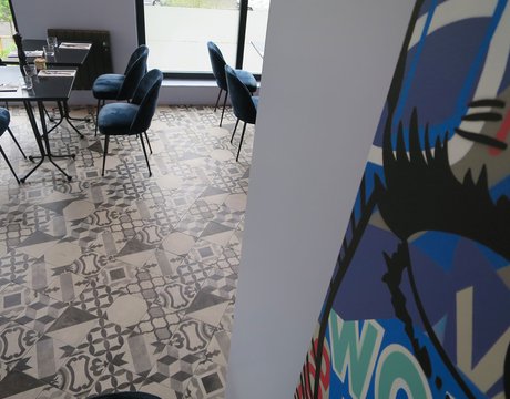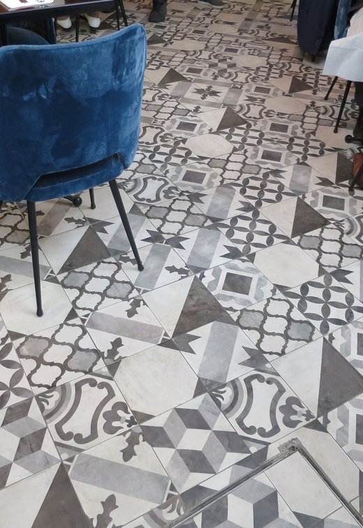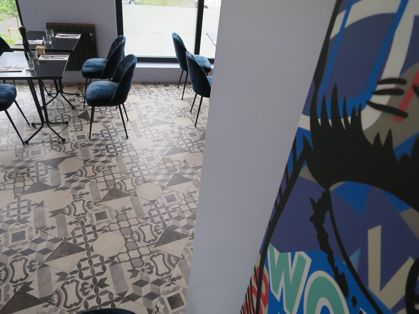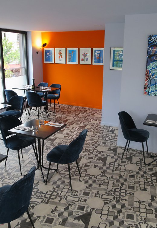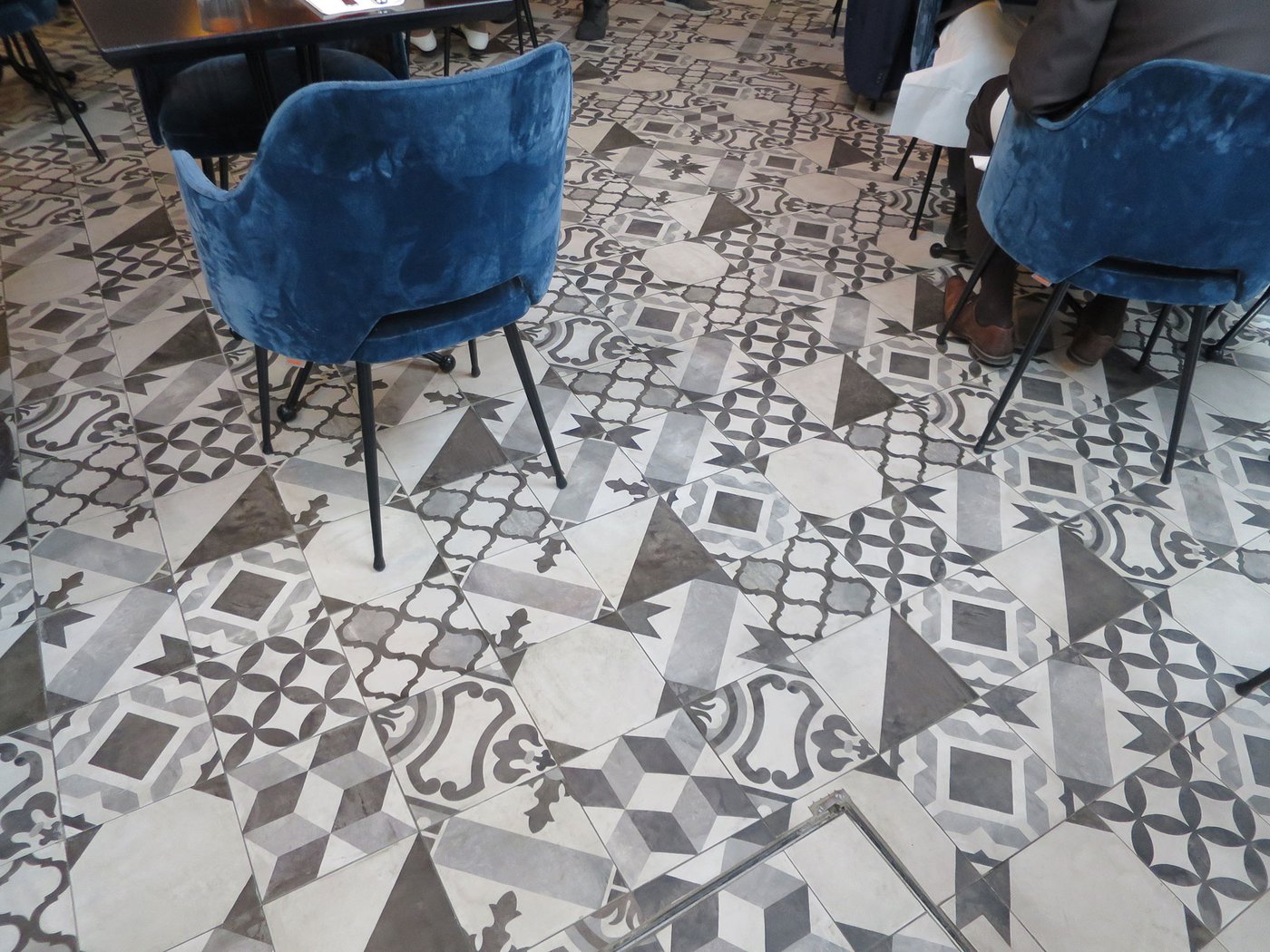 Para embellecer el comedor y los baños de esta brasería parisina se han elegido las elegantes baldosas hidráulicas Terra. El delicado formato 20x20 luce todas las decoraciones de la serie, creando una mezcla con acabado yeso original y elegante.