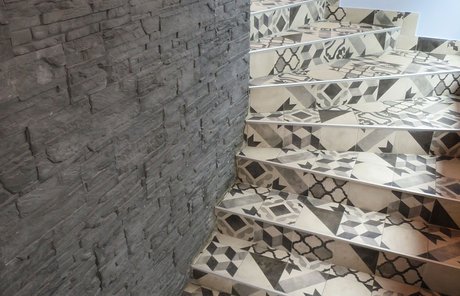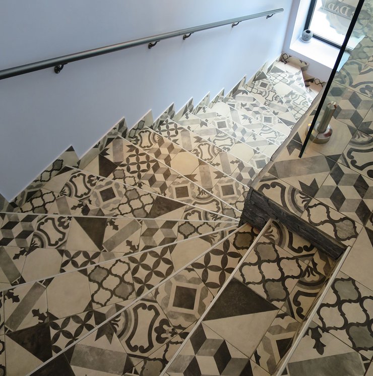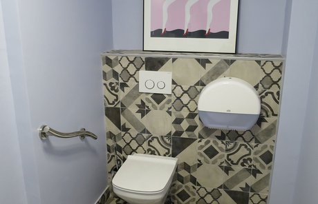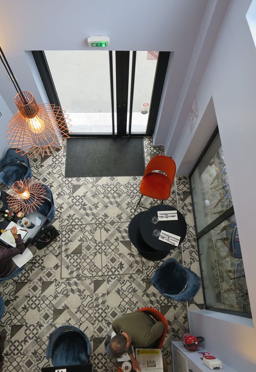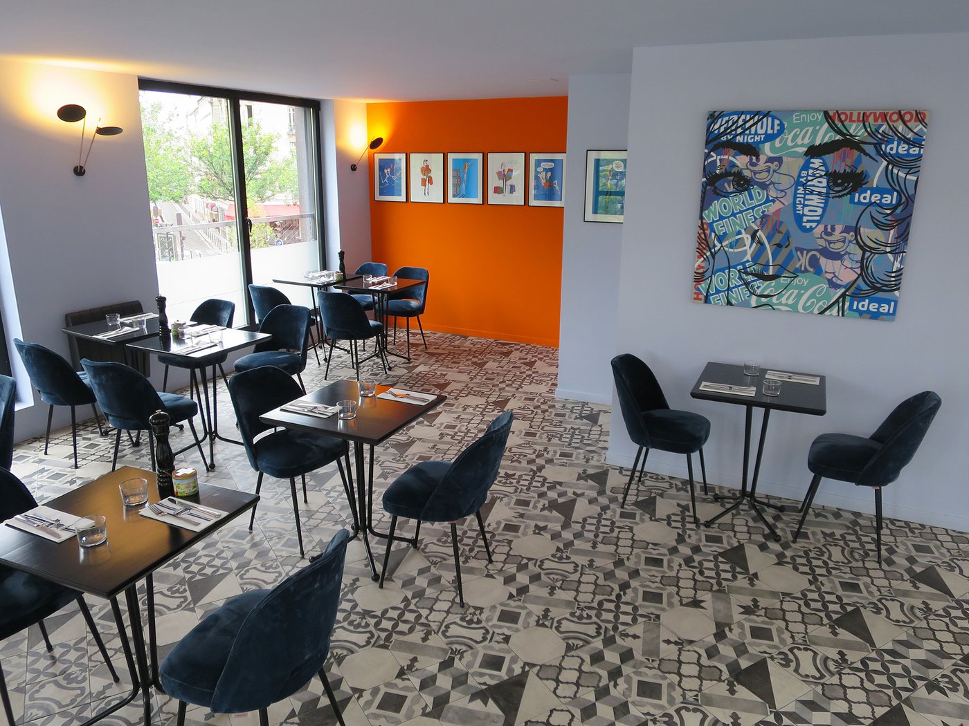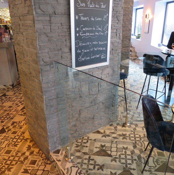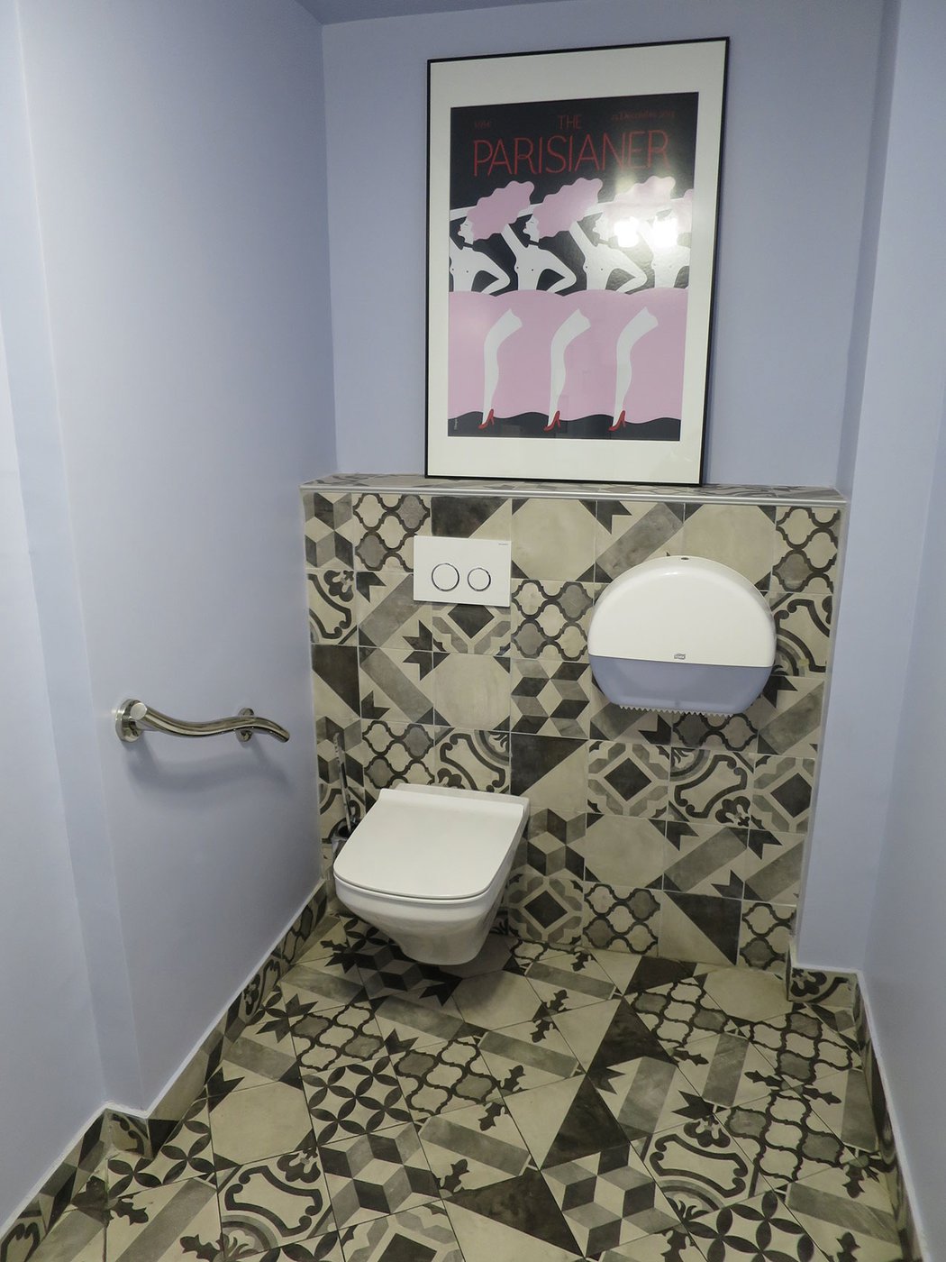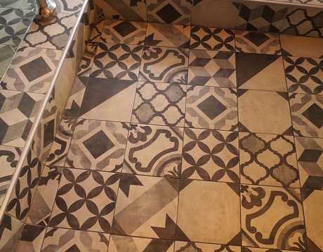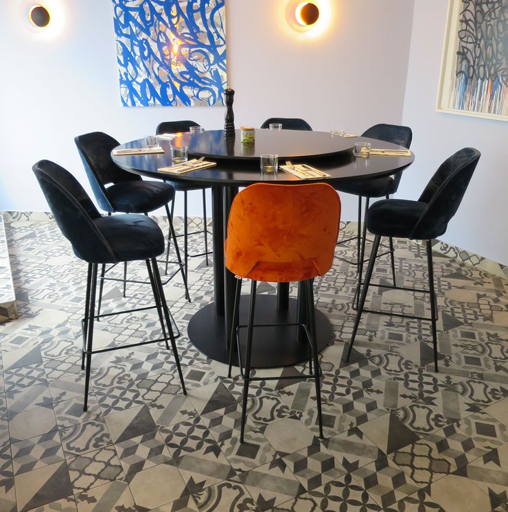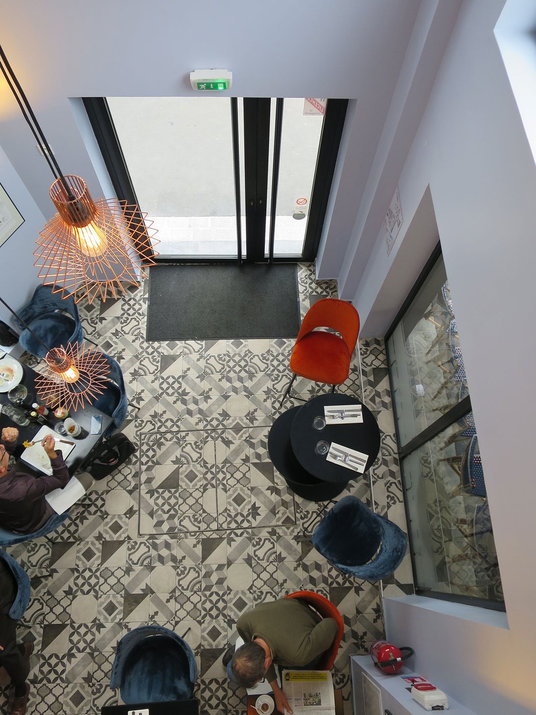 Para embellecer el comedor y los baños de esta brasería parisina se han elegido las elegantes baldosas hidráulicas Terra. El delicado formato 20x20 luce todas las decoraciones de la serie, creando una mezcla con acabado yeso original y elegante.