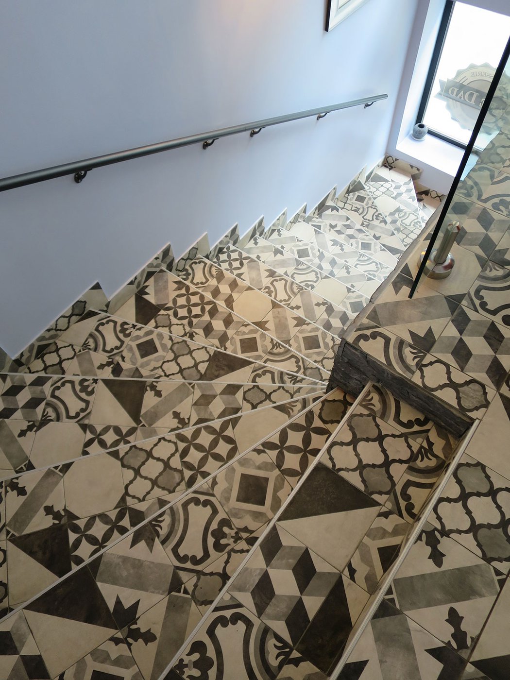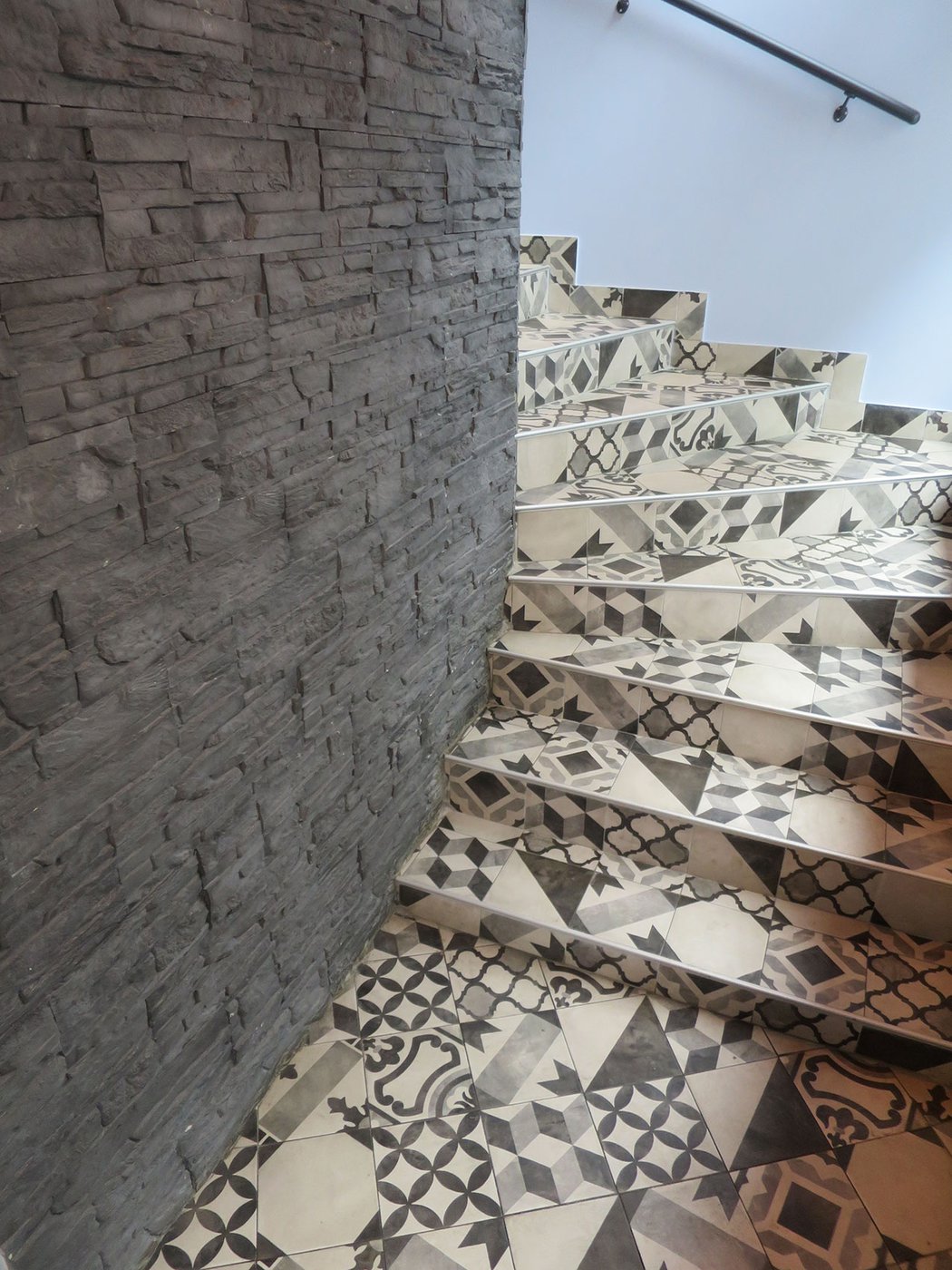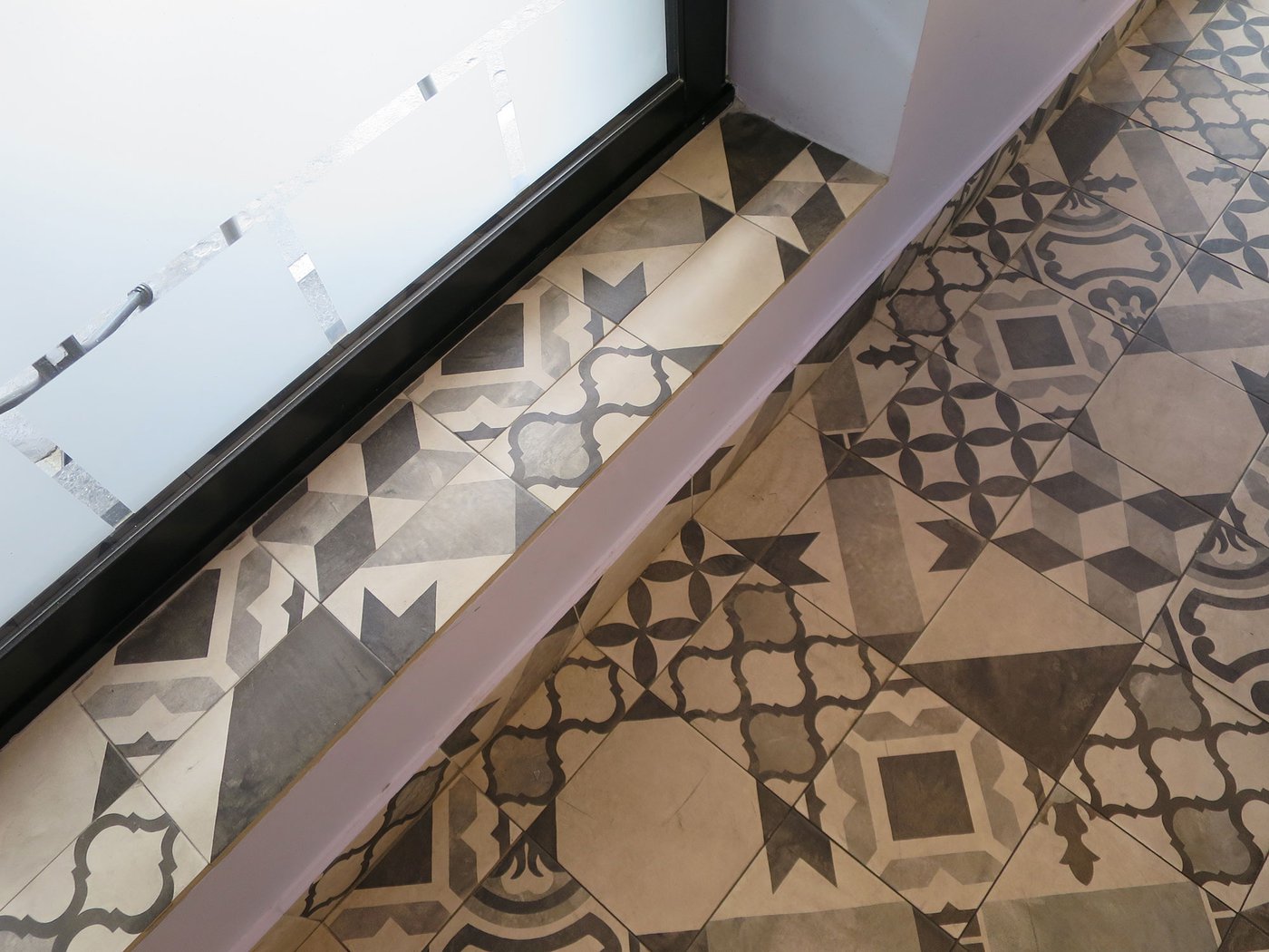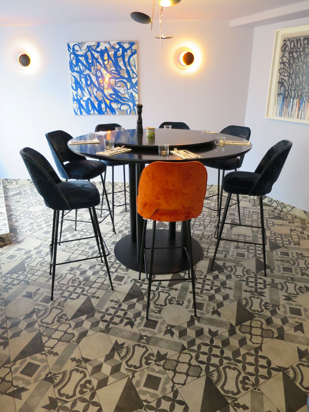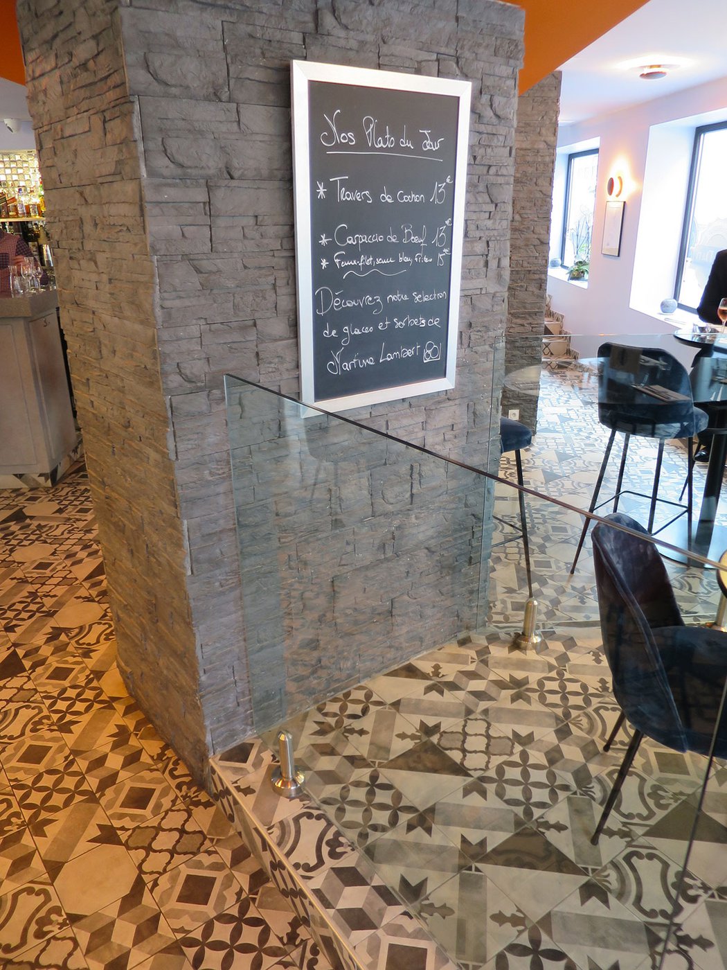 Para embellecer el comedor y los baños de esta brasería parisina se han elegido las elegantes baldosas hidráulicas Terra. El delicado formato 20x20 luce todas las decoraciones de la serie, creando una mezcla con acabado yeso original y elegante.