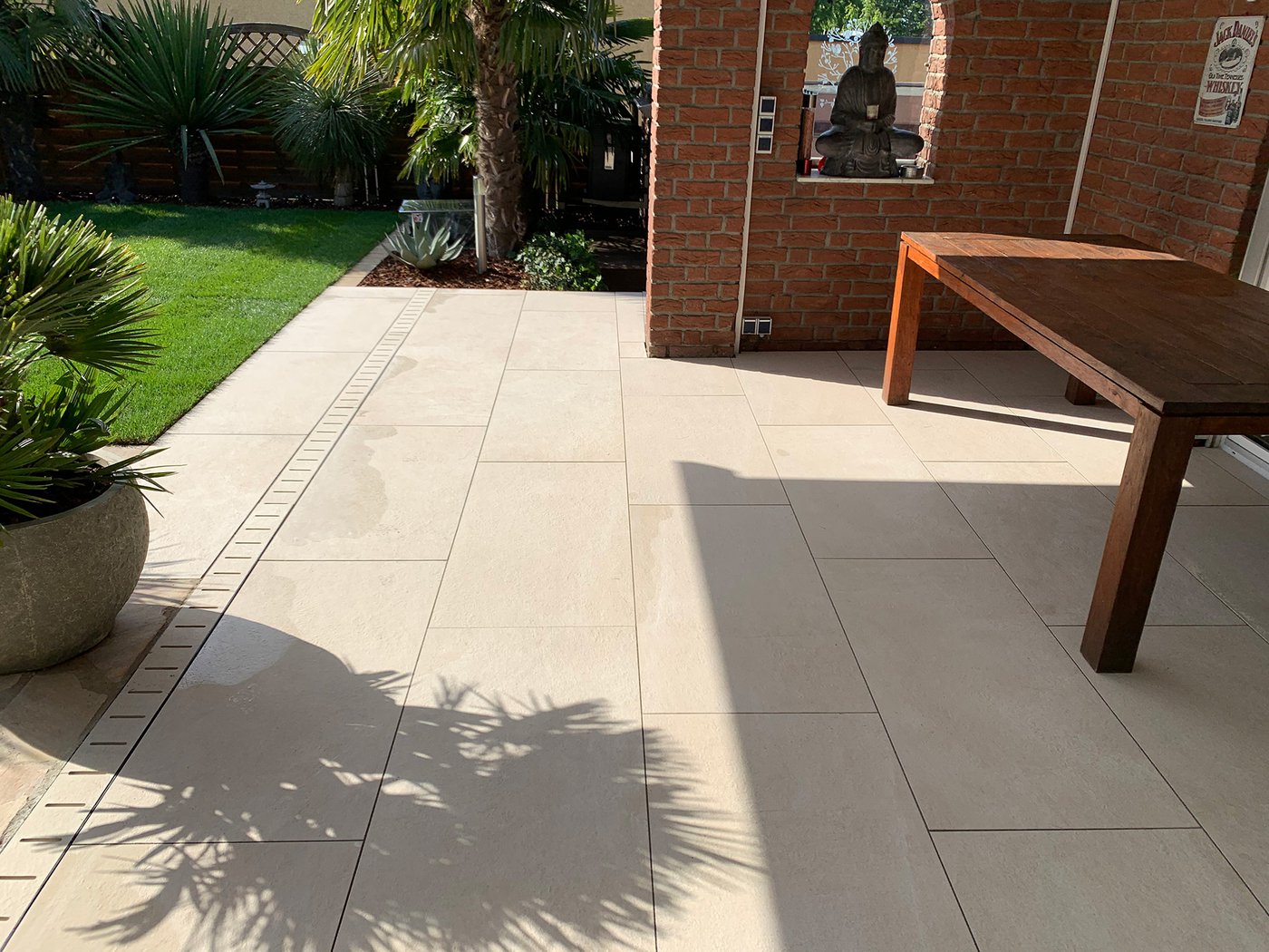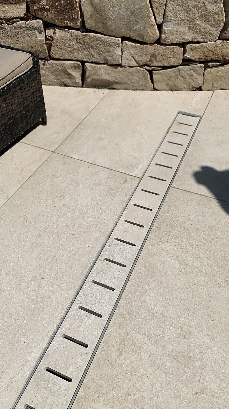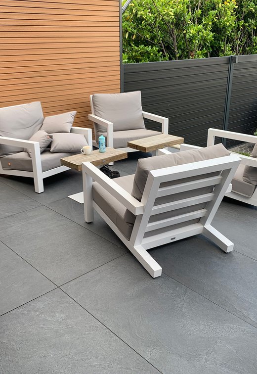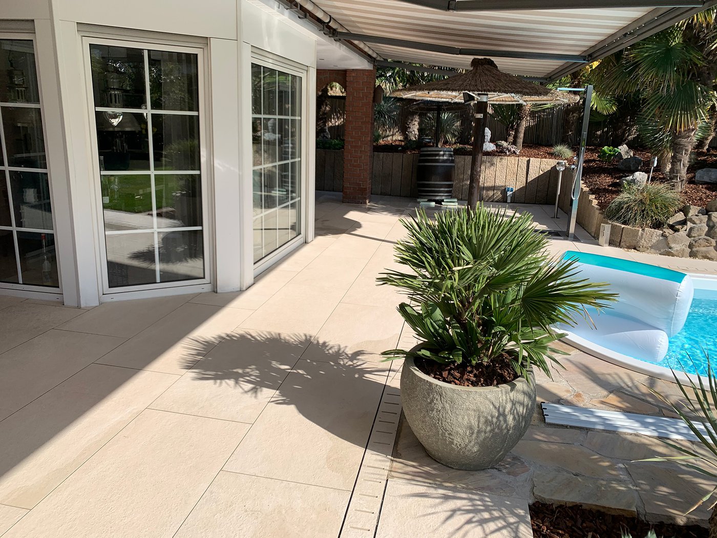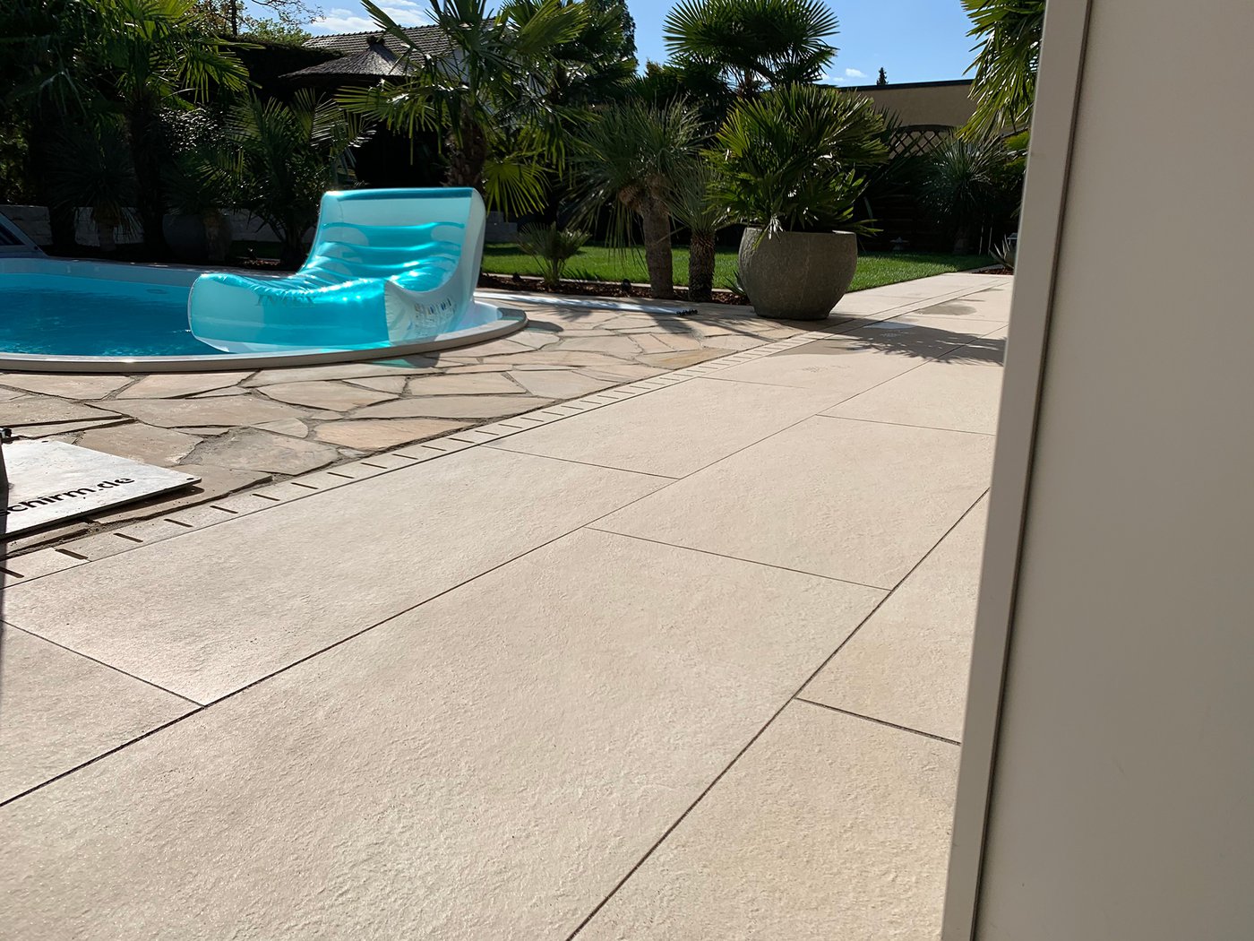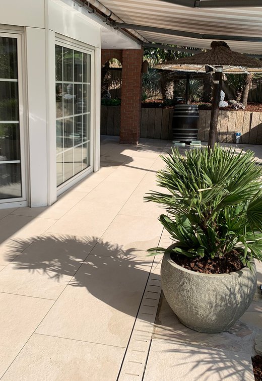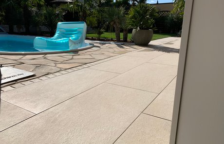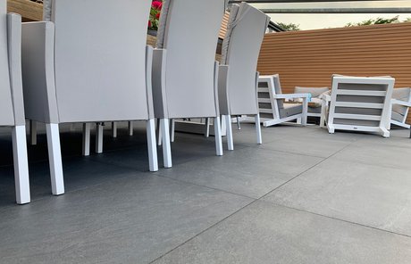 Con el tono beige, Matrix transmite una atmósfera elegante y mediterránea al jardín de la entrada y a la zona de la piscina, donde se requiere máxima seguridad y prestaciones antideslizantes. En el patio trasero, con zona de relajación y barbacoa, encontramos la variante Dark, que imprime un carácter más moderno y atrevido.