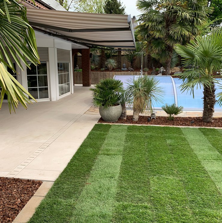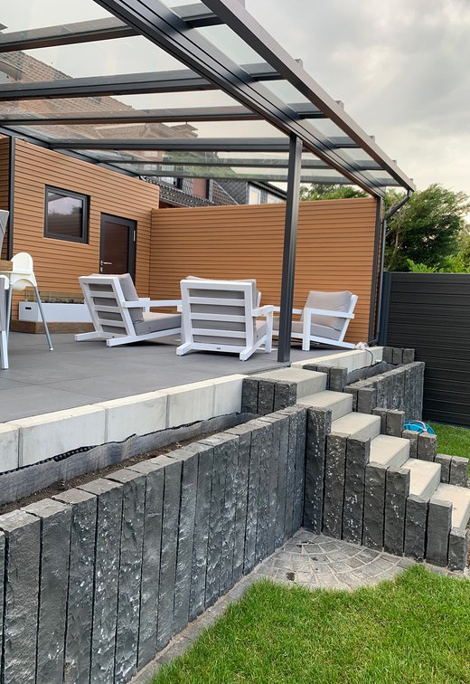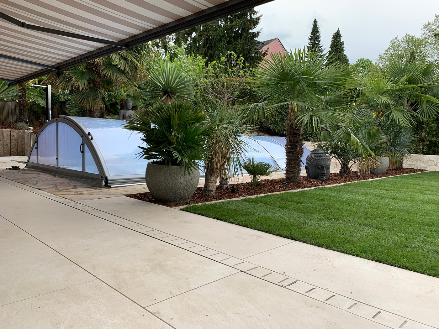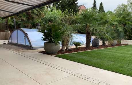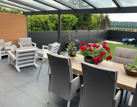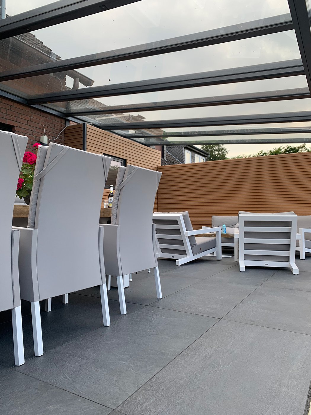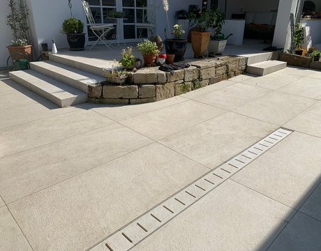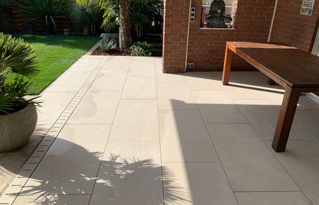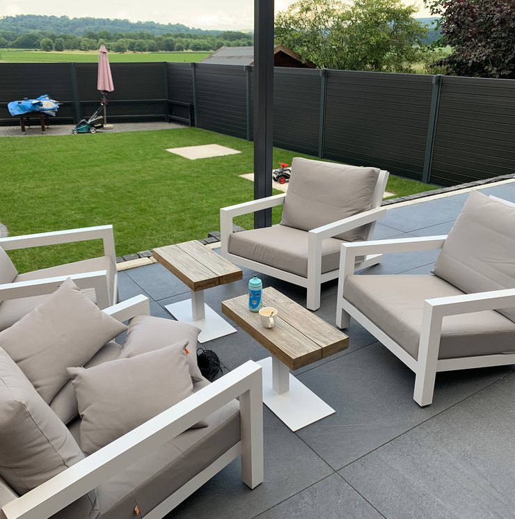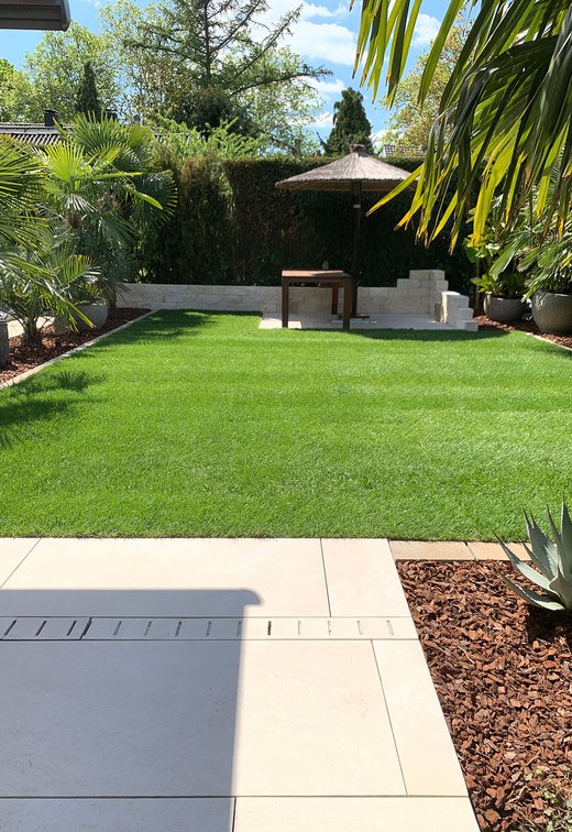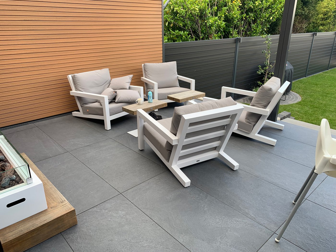 Con el tono beige, Matrix transmite una atmósfera elegante y mediterránea al jardín de la entrada y a la zona de la piscina, donde se requiere máxima seguridad y prestaciones antideslizantes. En el patio trasero, con zona de relajación y barbacoa, encontramos la variante Dark, que imprime un carácter más moderno y atrevido.