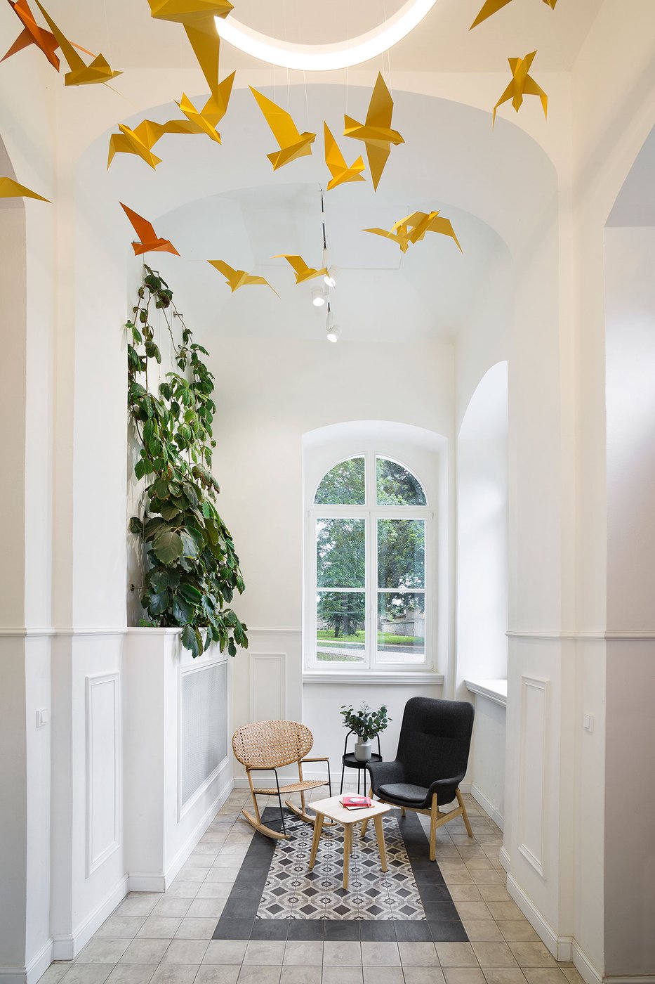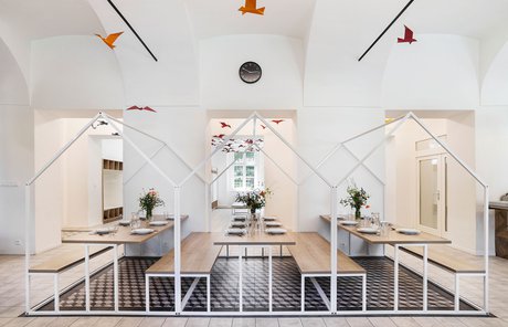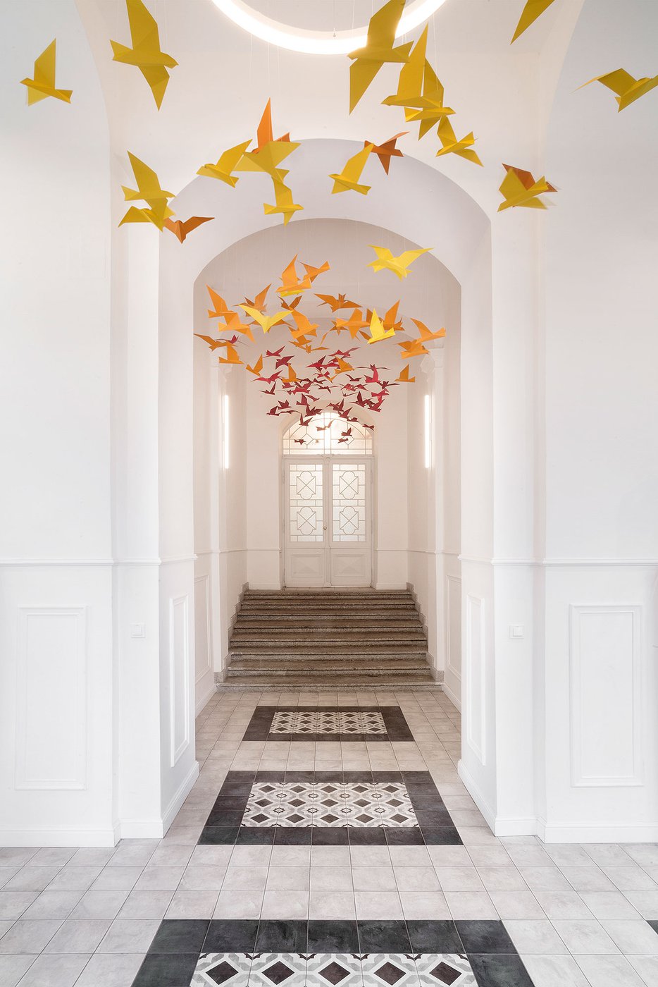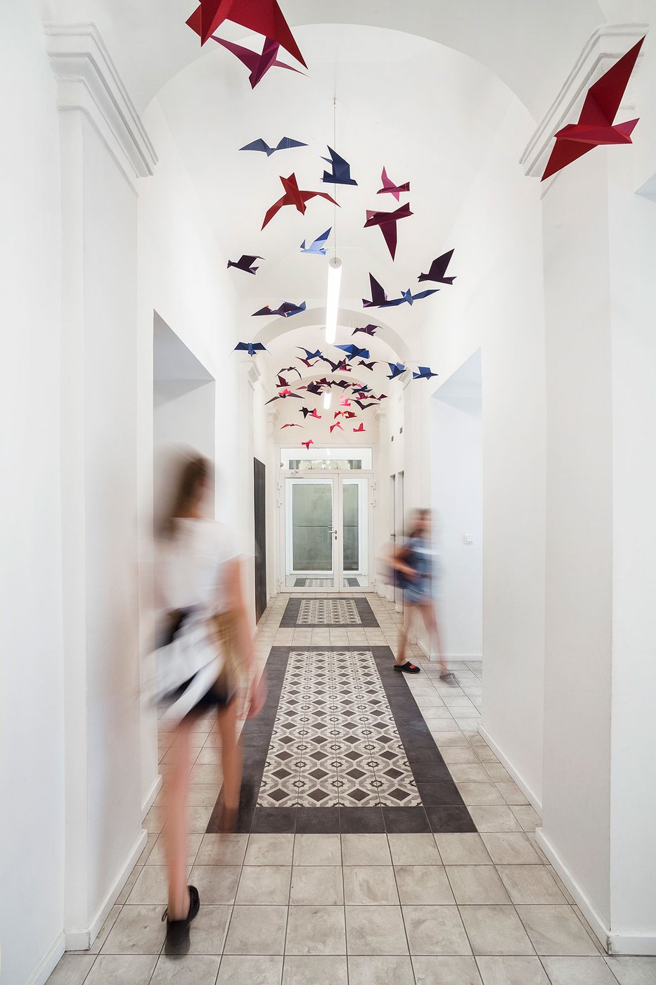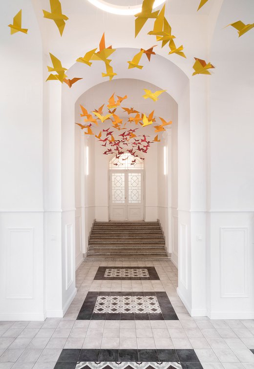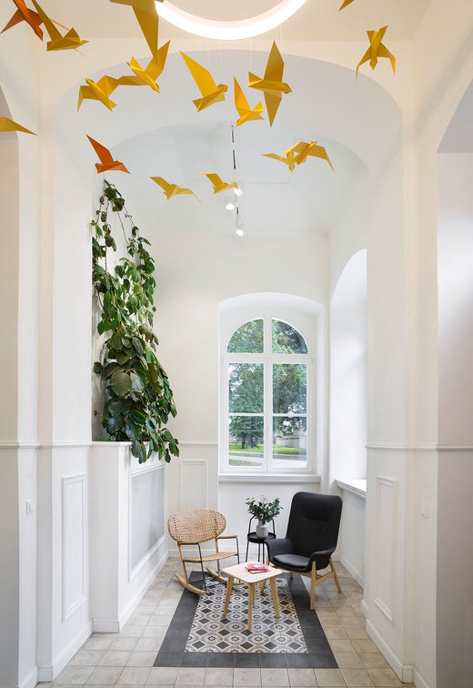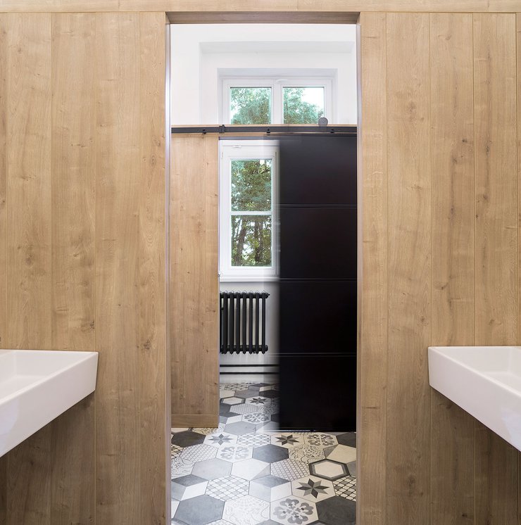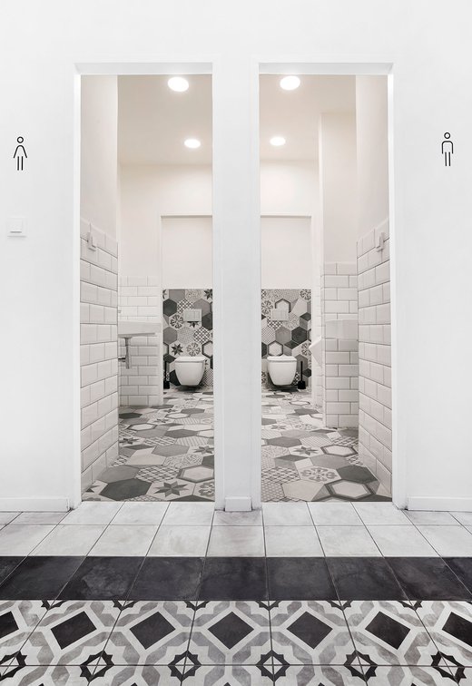 Para la remodelación de este antiguo castillo, convertido ahora en una escuela privada de primaria del método Montessori, el estudio Opálka Design ha elegido las baldosas, en formato pequeño, de nuestra Linea 1741. La serie Terra, baldosas hidráulicas de gres porcelánico sumamente decorativas, es perfecta para acoger a los jóvenes alumnos y crear un ambiente fresco y desenfadado. Ya desde la entrada, que se asoma a un hermoso parque centenario, los visitantes quedan cautivados por las cómodas butacas, por los coloridos origamis colgados del techo y por los originales pavimentos, donde la divertida decoración Geometria es enmarcada por los elegantes fondos gris y negro.