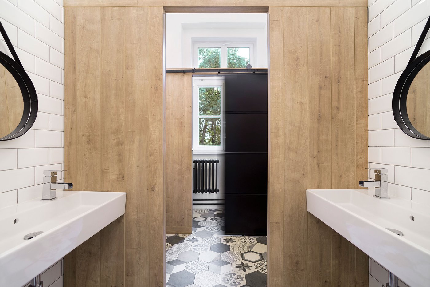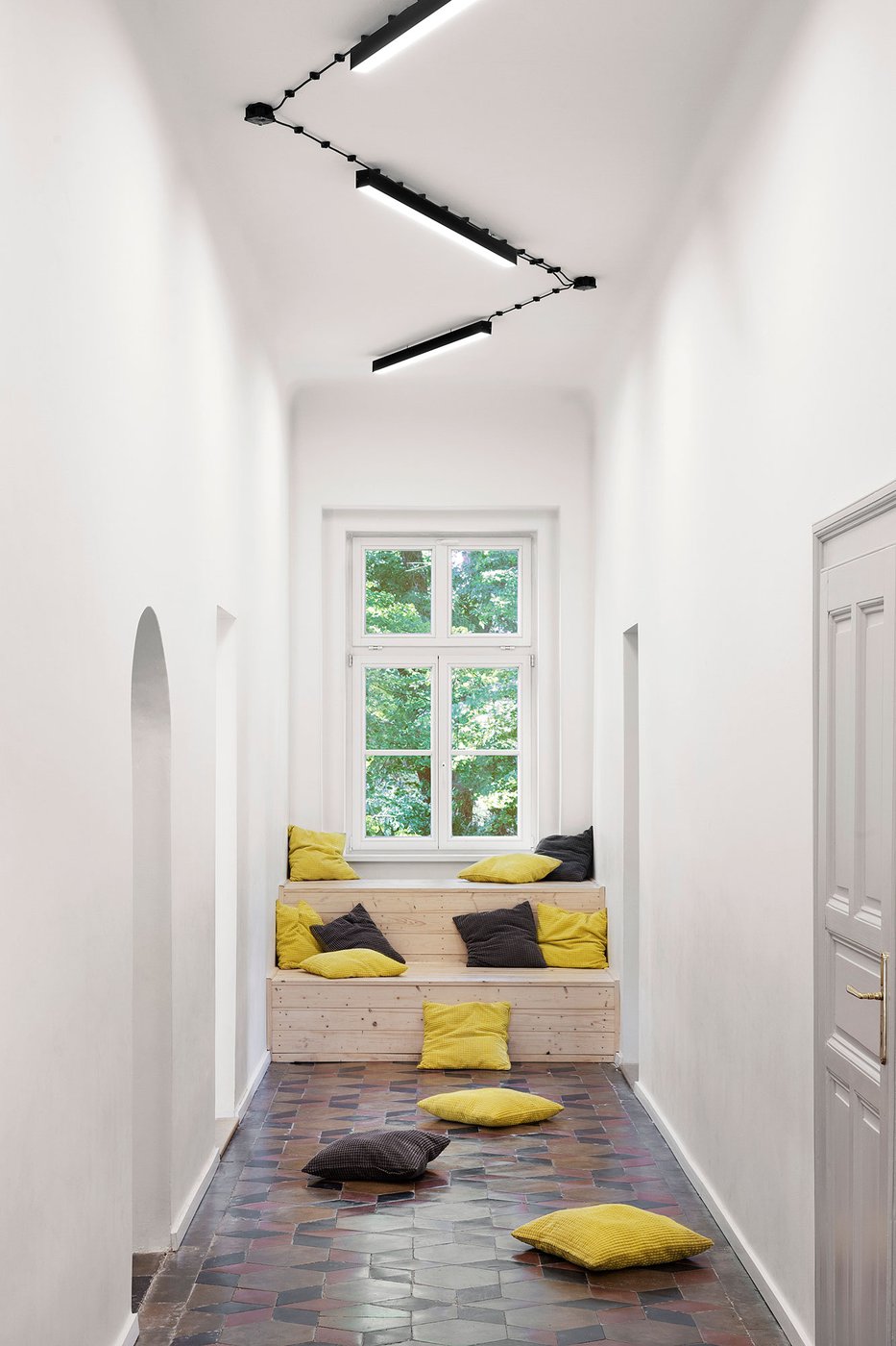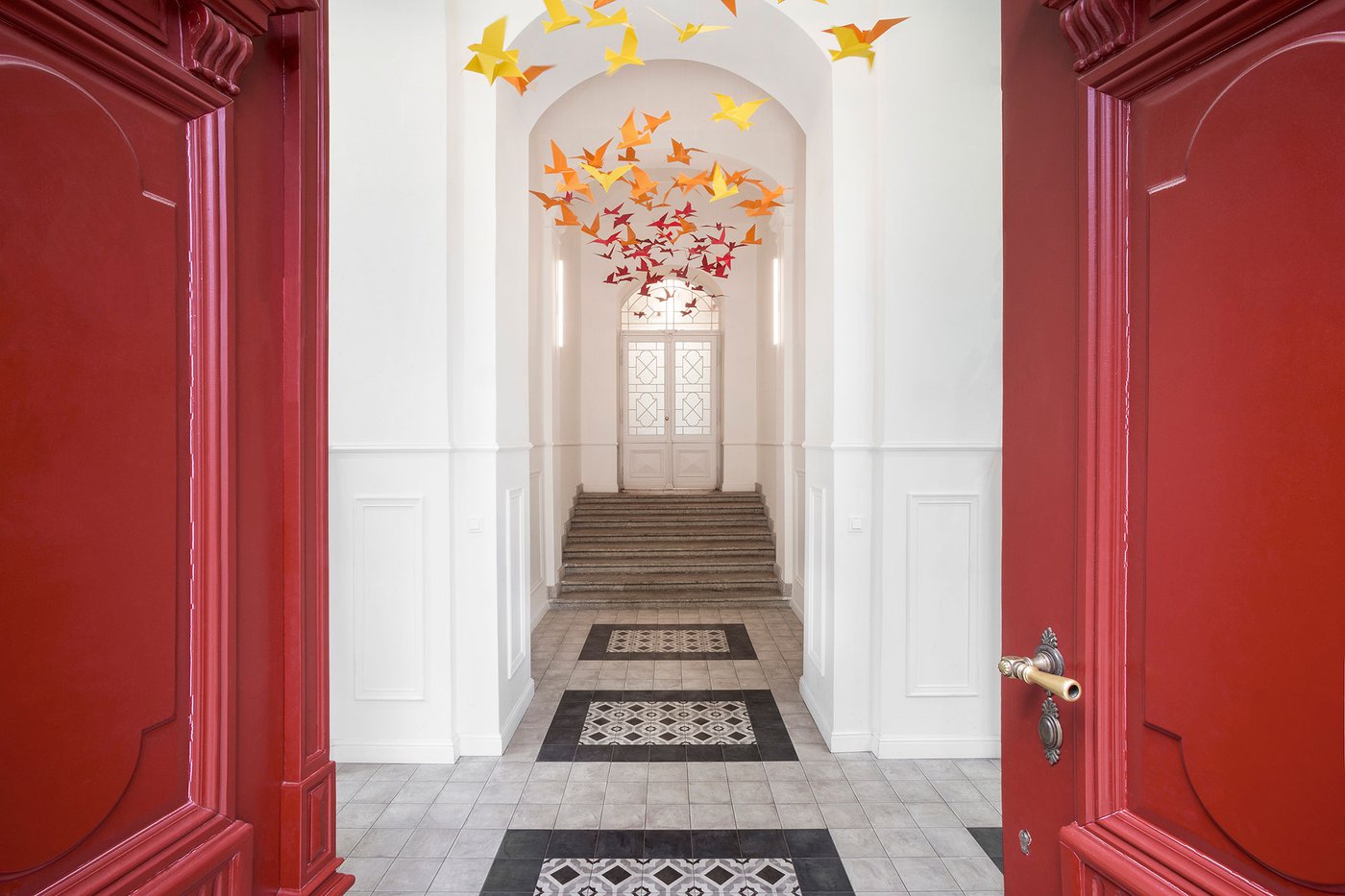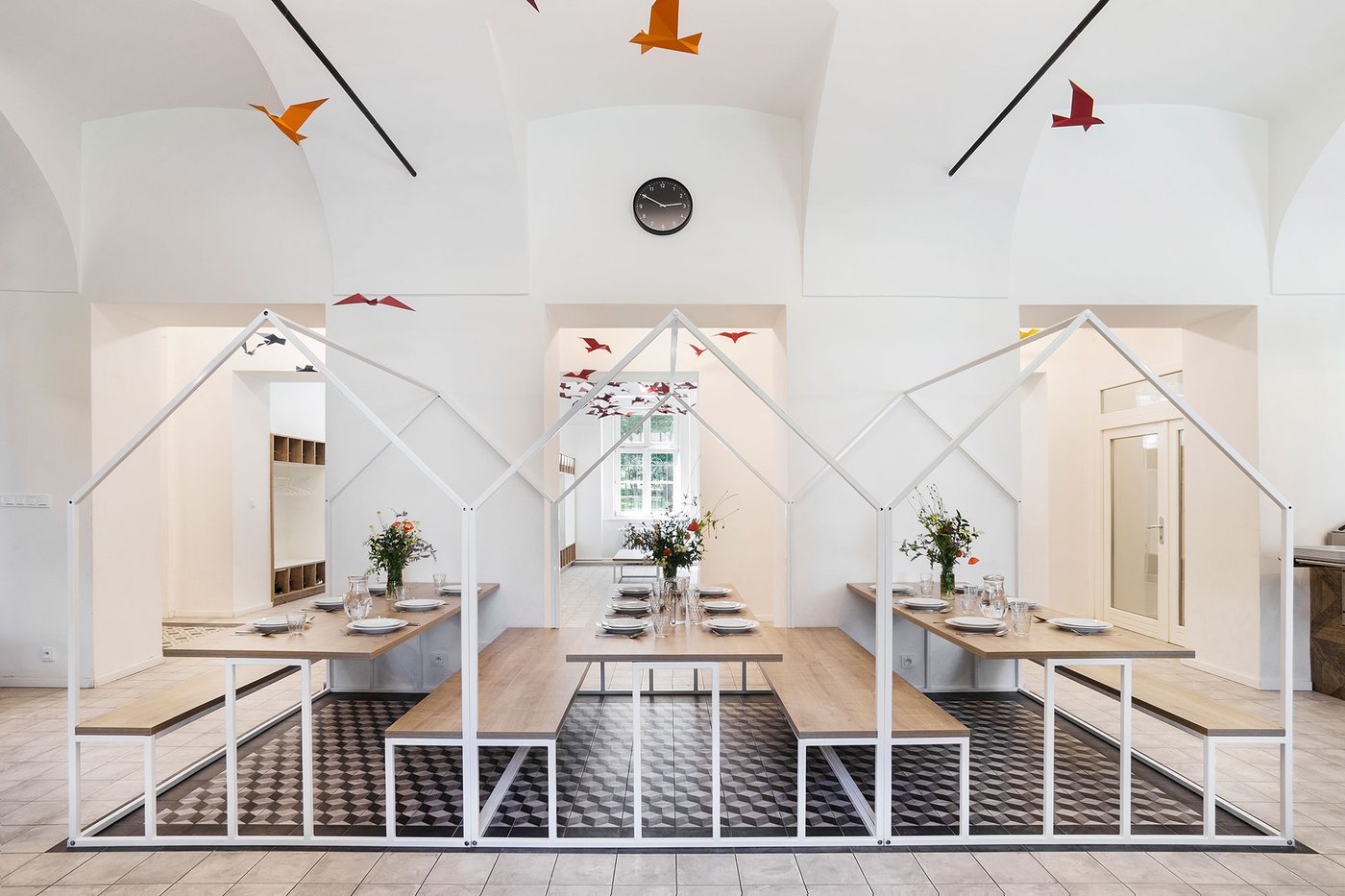 Para la remodelación de este antiguo castillo, convertido ahora en una escuela privada de primaria del método Montessori, el estudio Opálka Design ha elegido las baldosas, en formato pequeño, de nuestra Linea 1741. La serie Terra, baldosas hidráulicas de gres porcelánico sumamente decorativas, es perfecta para acoger a los jóvenes alumnos y crear un ambiente fresco y desenfadado. Ya desde la entrada, que se asoma a un hermoso parque centenario, los visitantes quedan cautivados por las cómodas butacas, por los coloridos origamis colgados del techo y por los originales pavimentos, donde la divertida decoración Geometria es enmarcada por los elegantes fondos gris y negro.