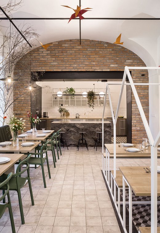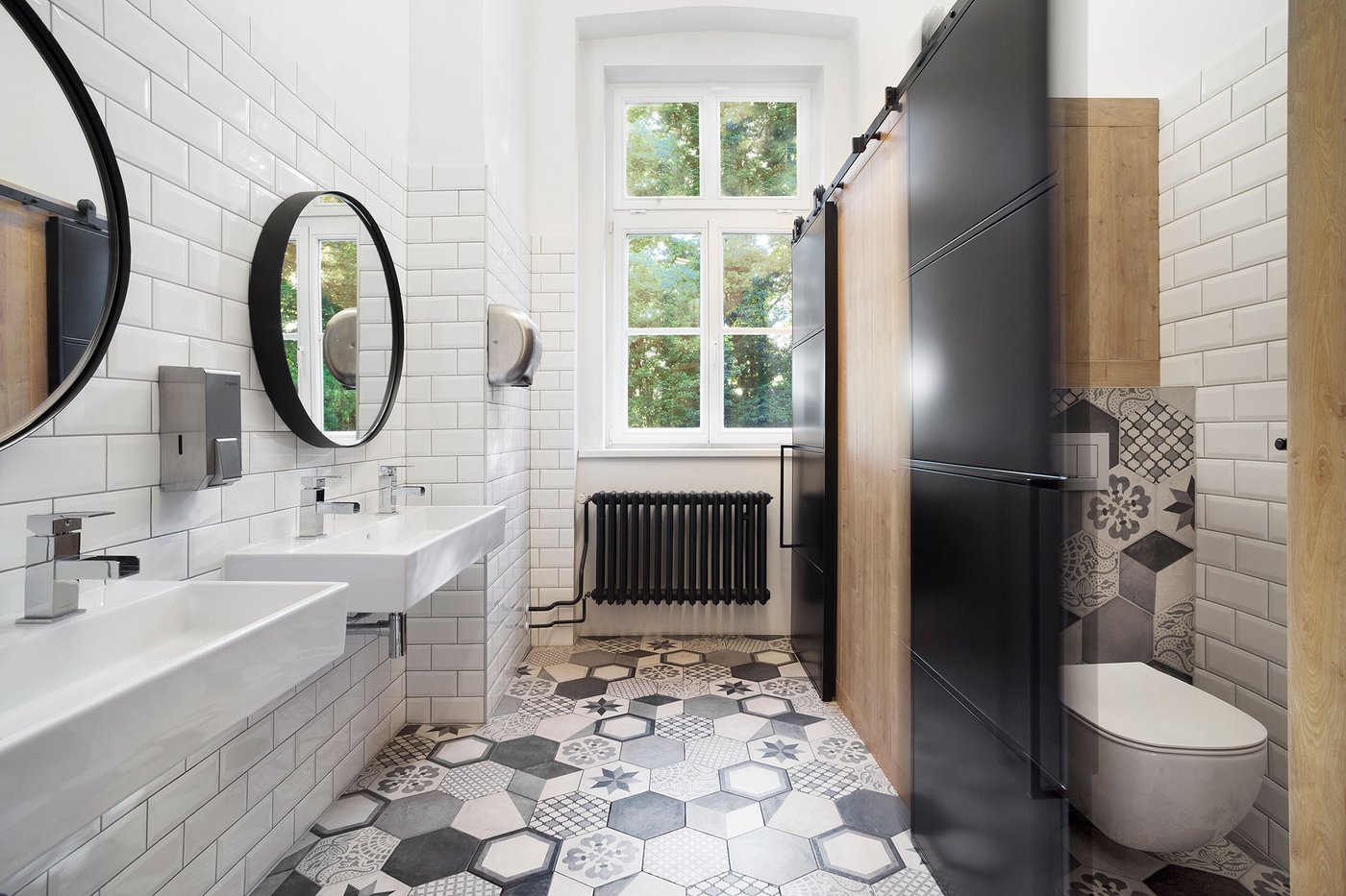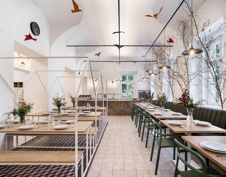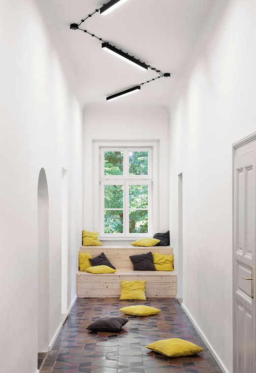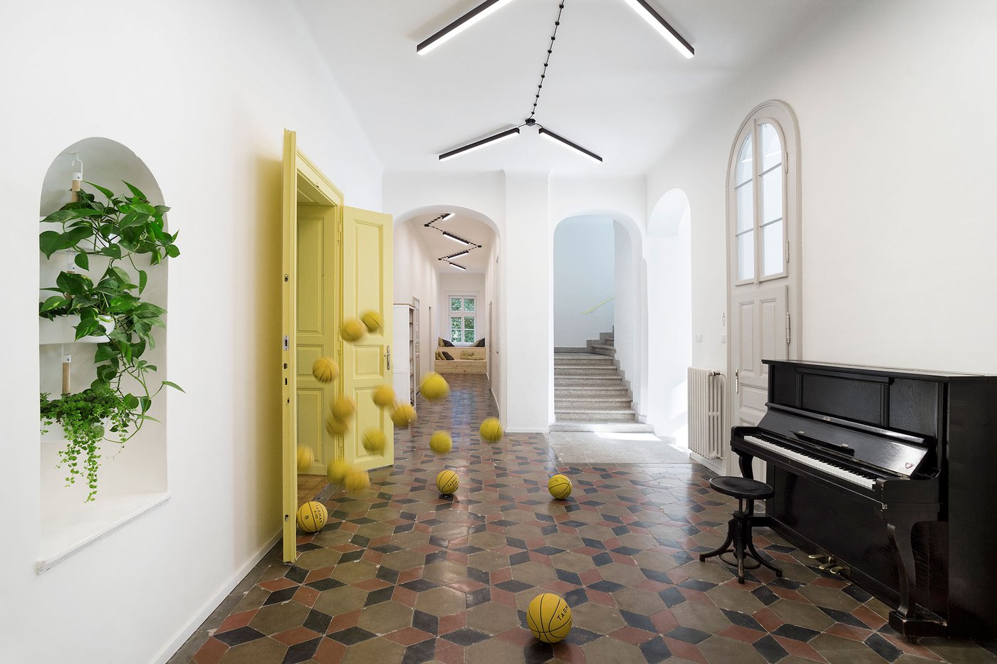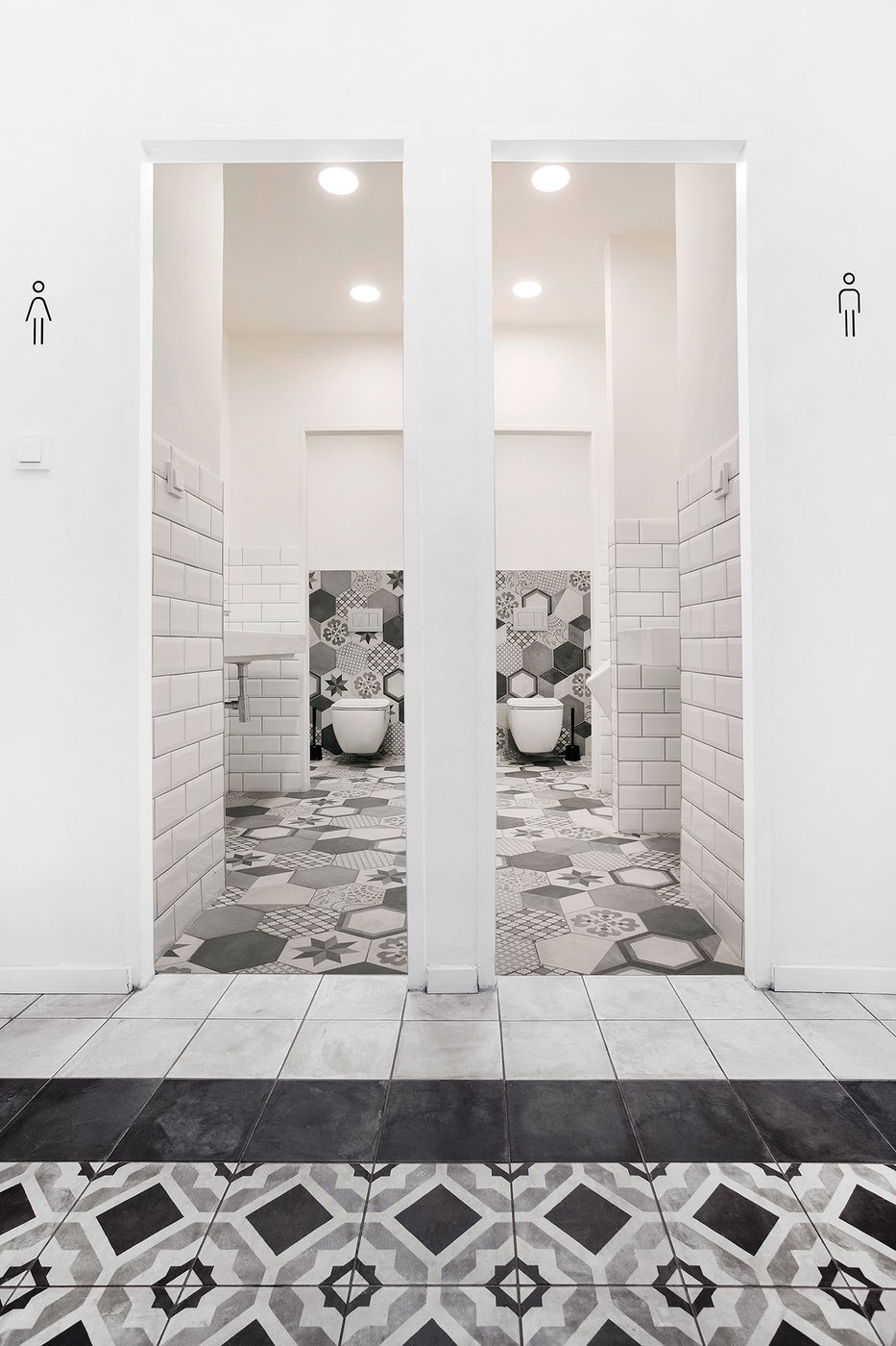 Para la remodelación de este antiguo castillo, convertido ahora en una escuela privada de primaria del método Montessori, el estudio Opálka Design ha elegido las baldosas, en formato pequeño, de nuestra Linea 1741. La serie Terra, baldosas hidráulicas de gres porcelánico sumamente decorativas, es perfecta para acoger a los jóvenes alumnos y crear un ambiente fresco y desenfadado. Ya desde la entrada, que se asoma a un hermoso parque centenario, los visitantes quedan cautivados por las cómodas butacas, por los coloridos origamis colgados del techo y por los originales pavimentos, donde la divertida decoración Geometria es enmarcada por los elegantes fondos gris y negro.