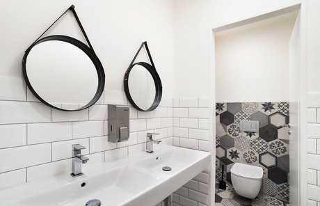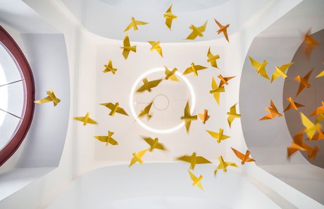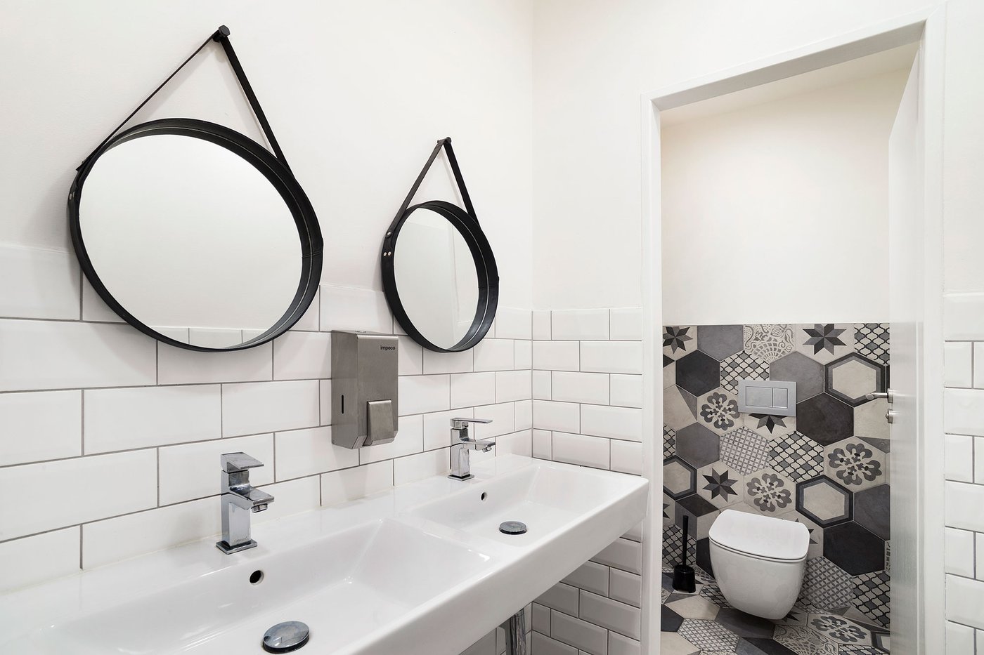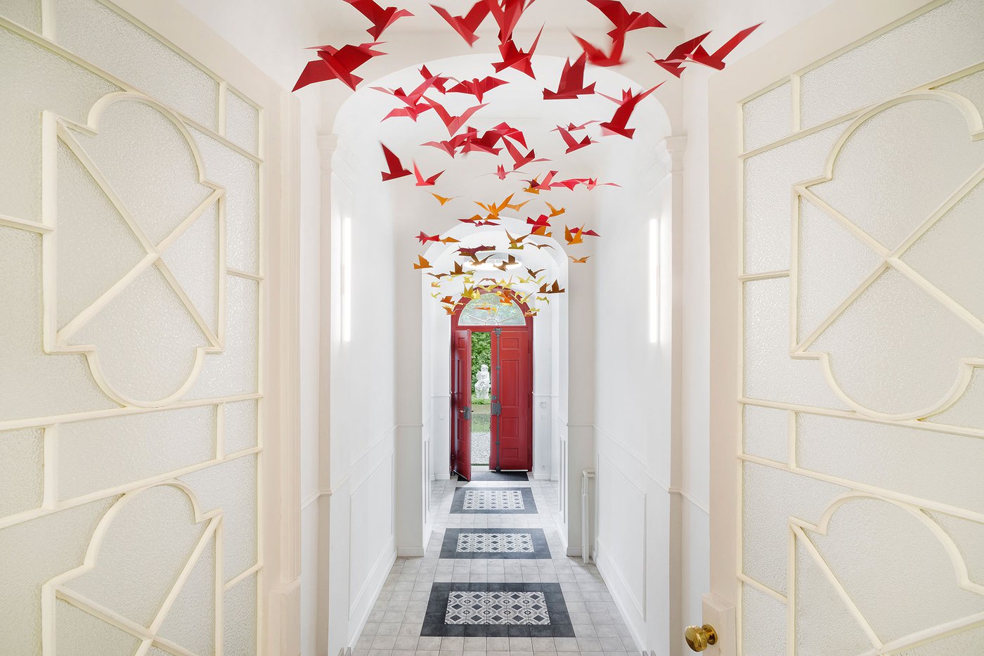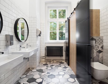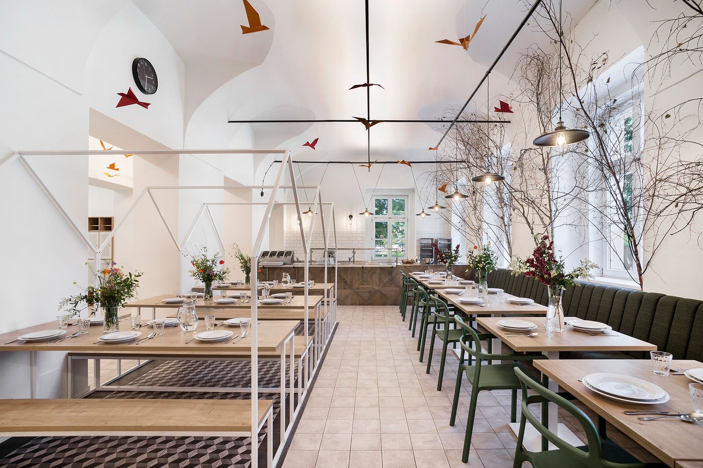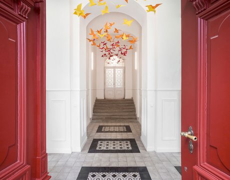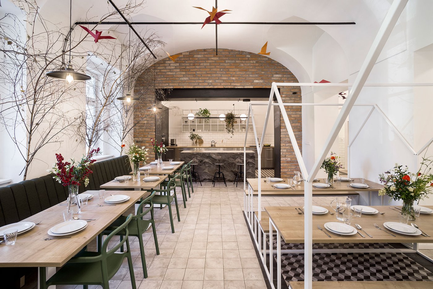 Para la remodelación de este antiguo castillo, convertido ahora en una escuela privada de primaria del método Montessori, el estudio Opálka Design ha elegido las baldosas, en formato pequeño, de nuestra Linea 1741. La serie Terra, baldosas hidráulicas de gres porcelánico sumamente decorativas, es perfecta para acoger a los jóvenes alumnos y crear un ambiente fresco y desenfadado. Ya desde la entrada, que se asoma a un hermoso parque centenario, los visitantes quedan cautivados por las cómodas butacas, por los coloridos origamis colgados del techo y por los originales pavimentos, donde la divertida decoración Geometria es enmarcada por los elegantes fondos gris y negro.