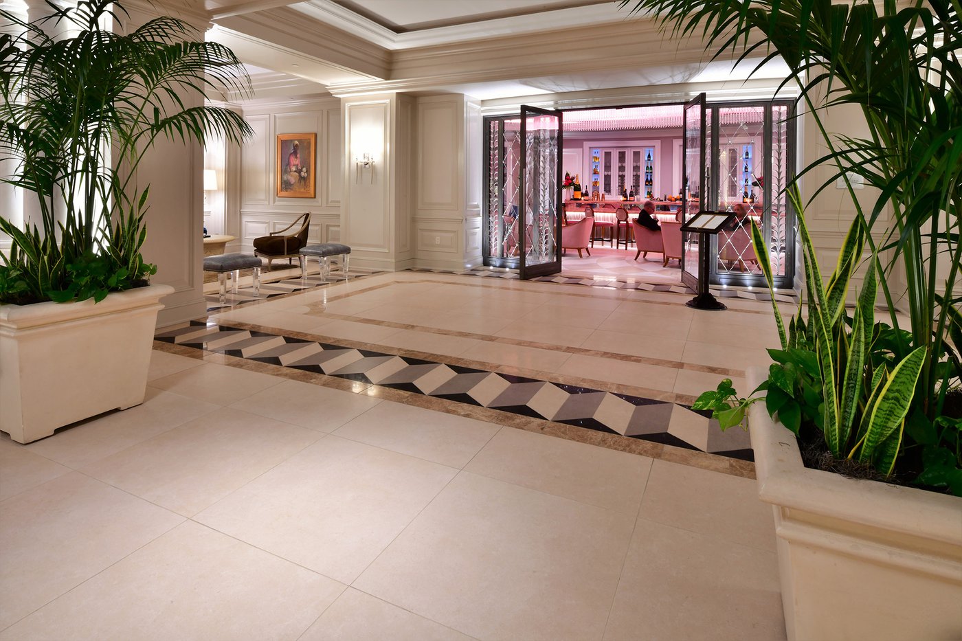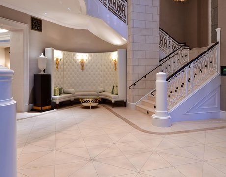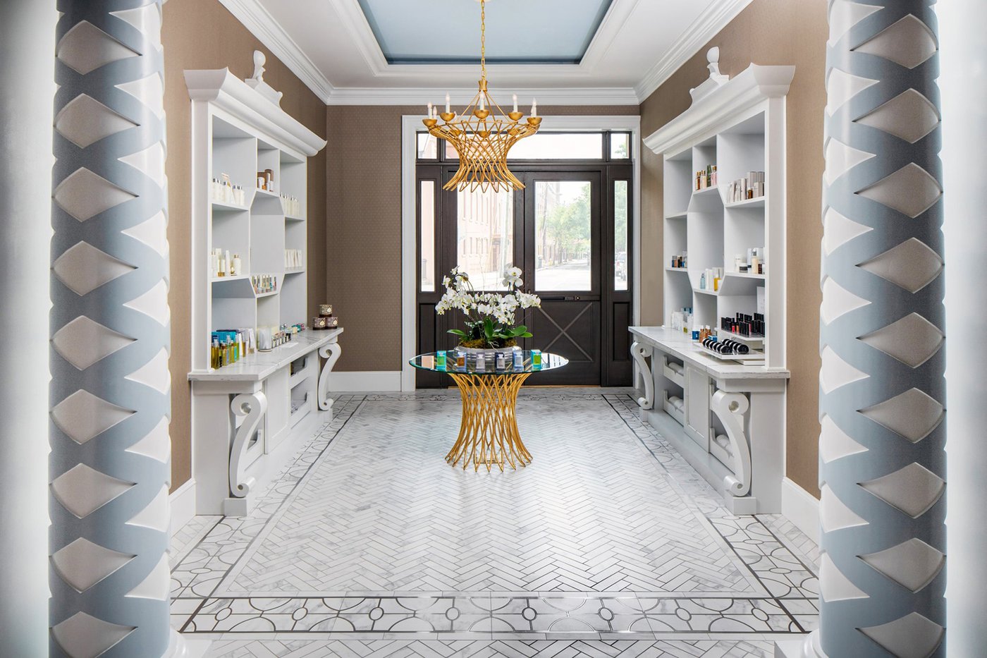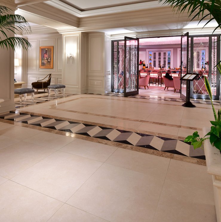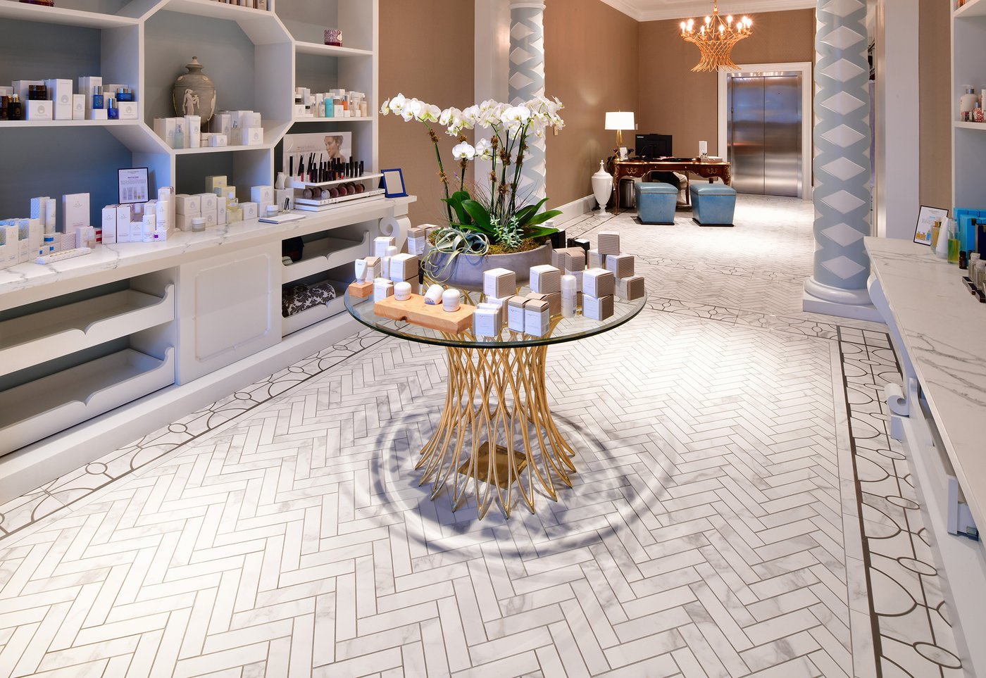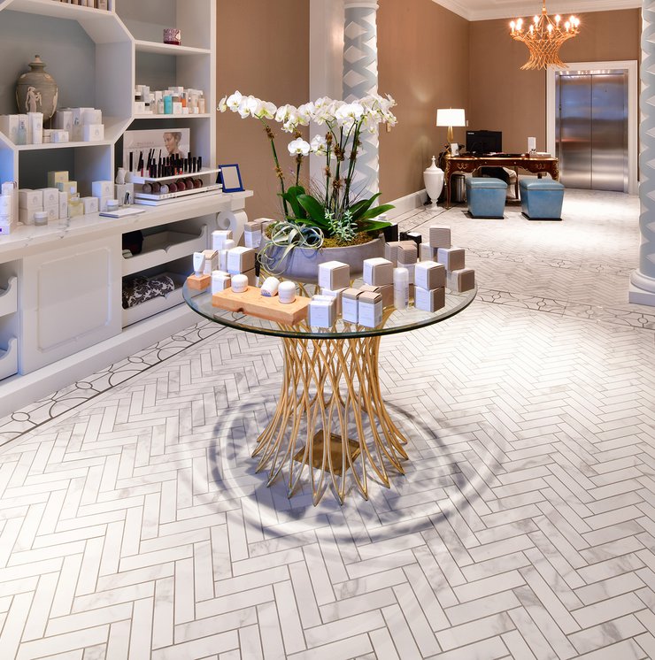 Los pavimentos y revestimientos de gres efecto mármol de la colección Deluxe se encuentran en la boutique del spa y en los aseos de las suites privadas.