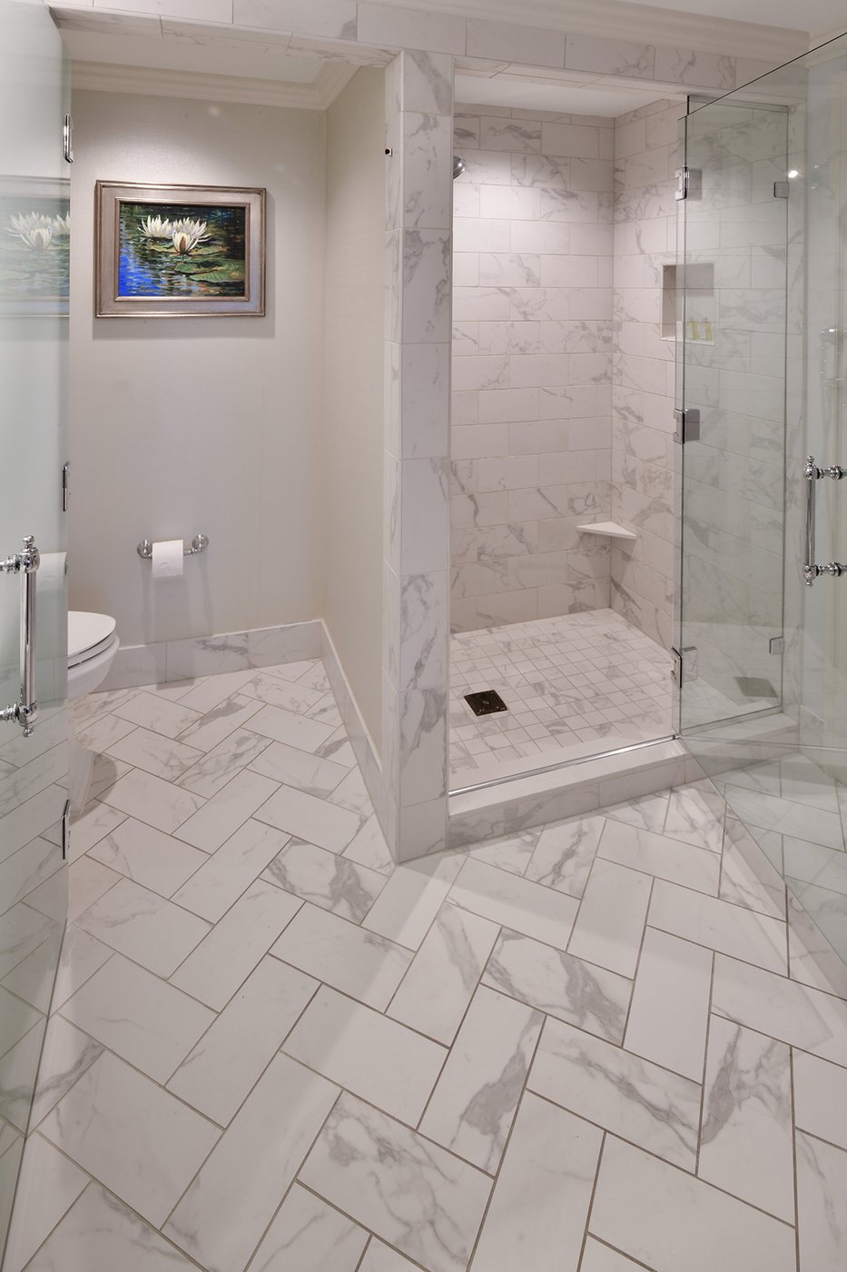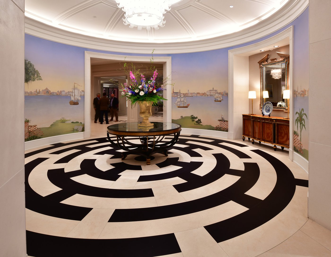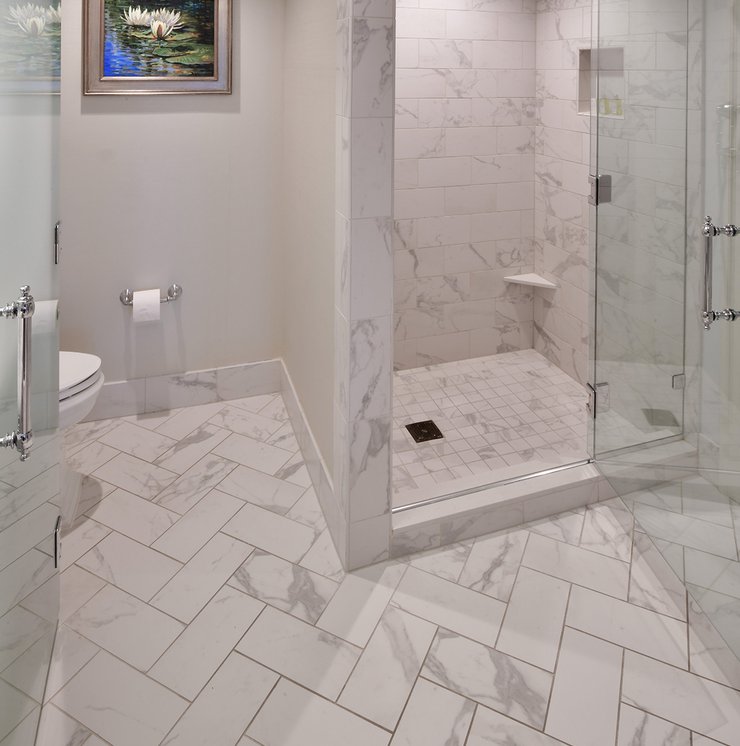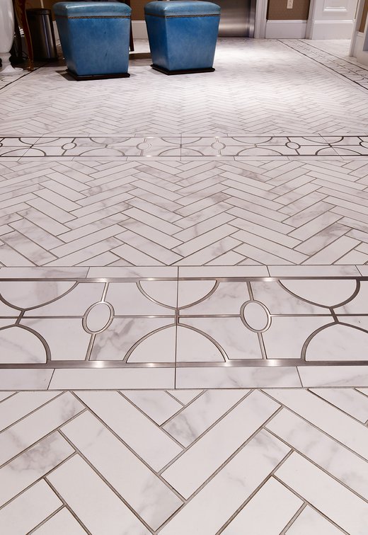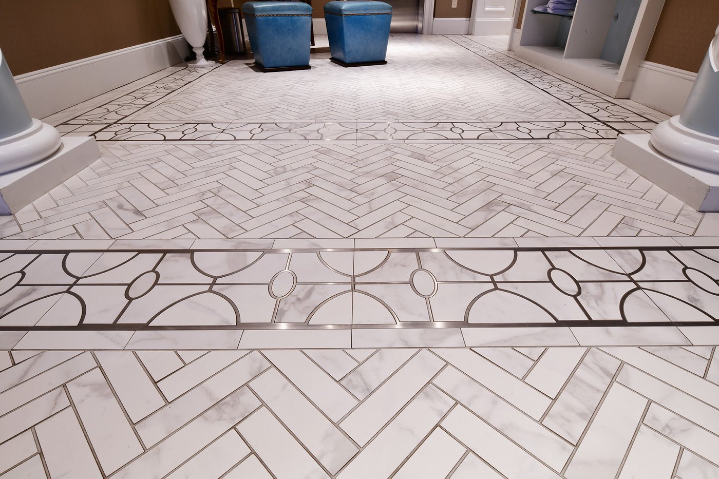 En particular, para valorizar el candor y la elegancia de las superficies Deluxe White, se han realizado cortes personalizados, con el fin de obtener refinados listelos y microteselas de las grandes placas.