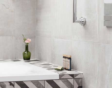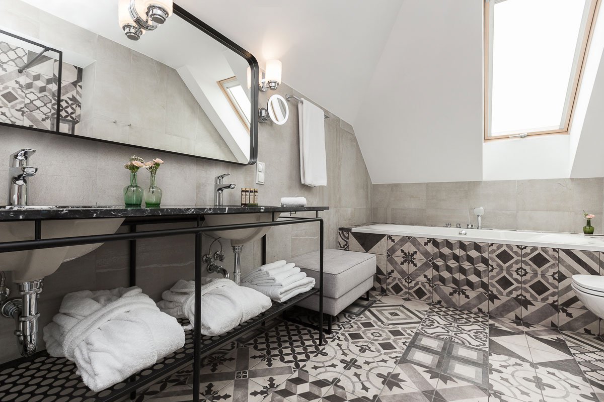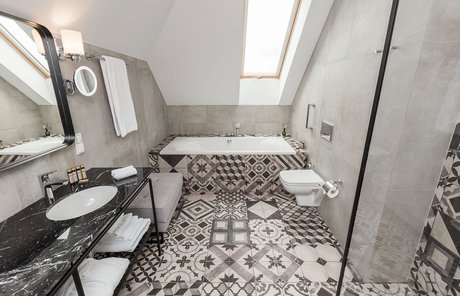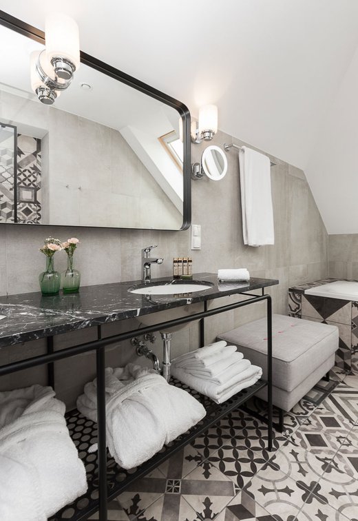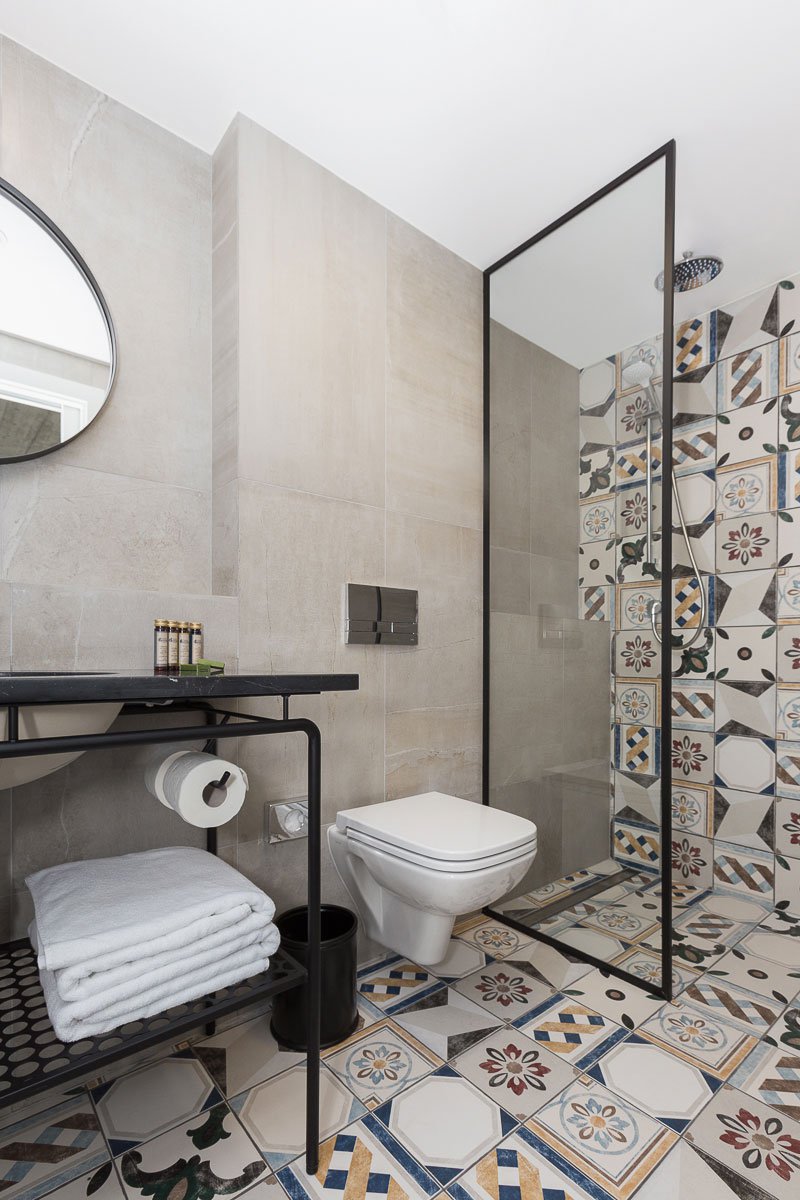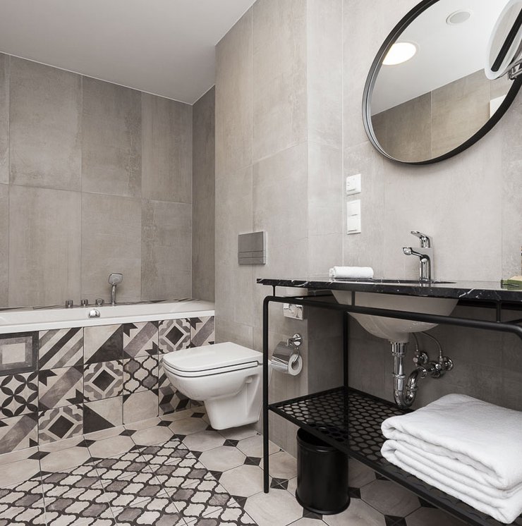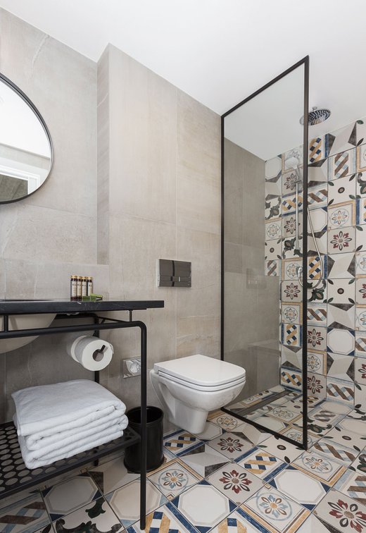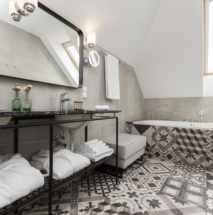 En este excéntrico hotel de Cracovia encontramos dos colecciones Marca Corona, StoneOne y Terra, elegidas para embellecer los baños de las numerosas suites. En el pavimento tenemos las elegantes baldosas hidráulicas Terra en el original Mix Decoro de tonos grises y, como revestimiento, podemos apreciar las superficies efecto piedra de StoneOne, modernas y decididas con su veteado natural.