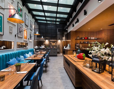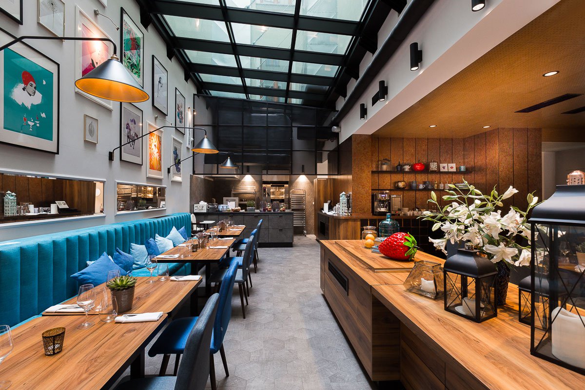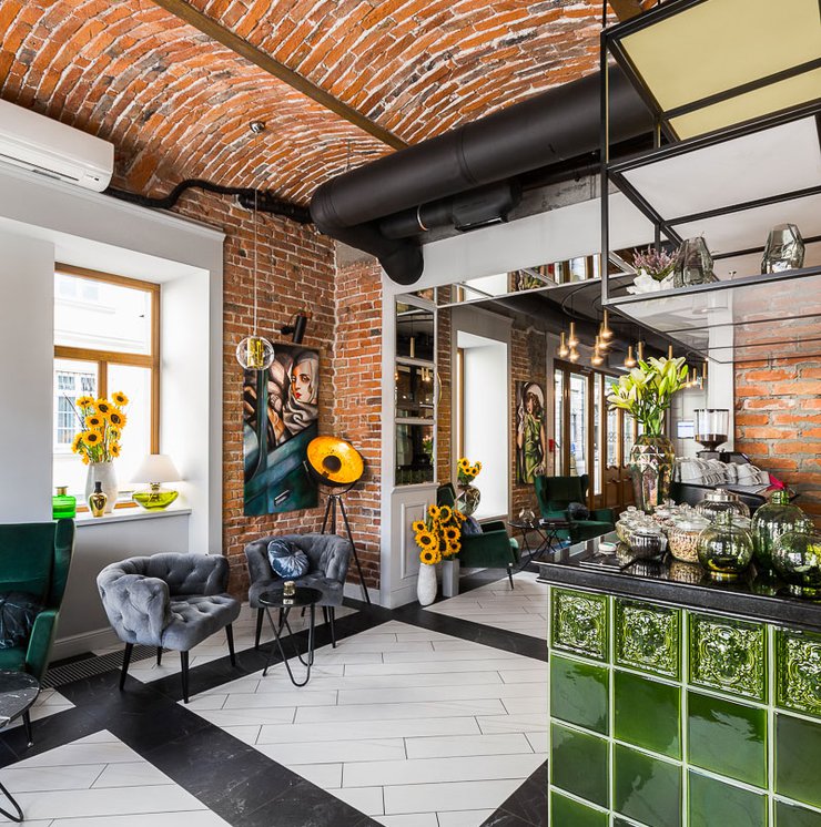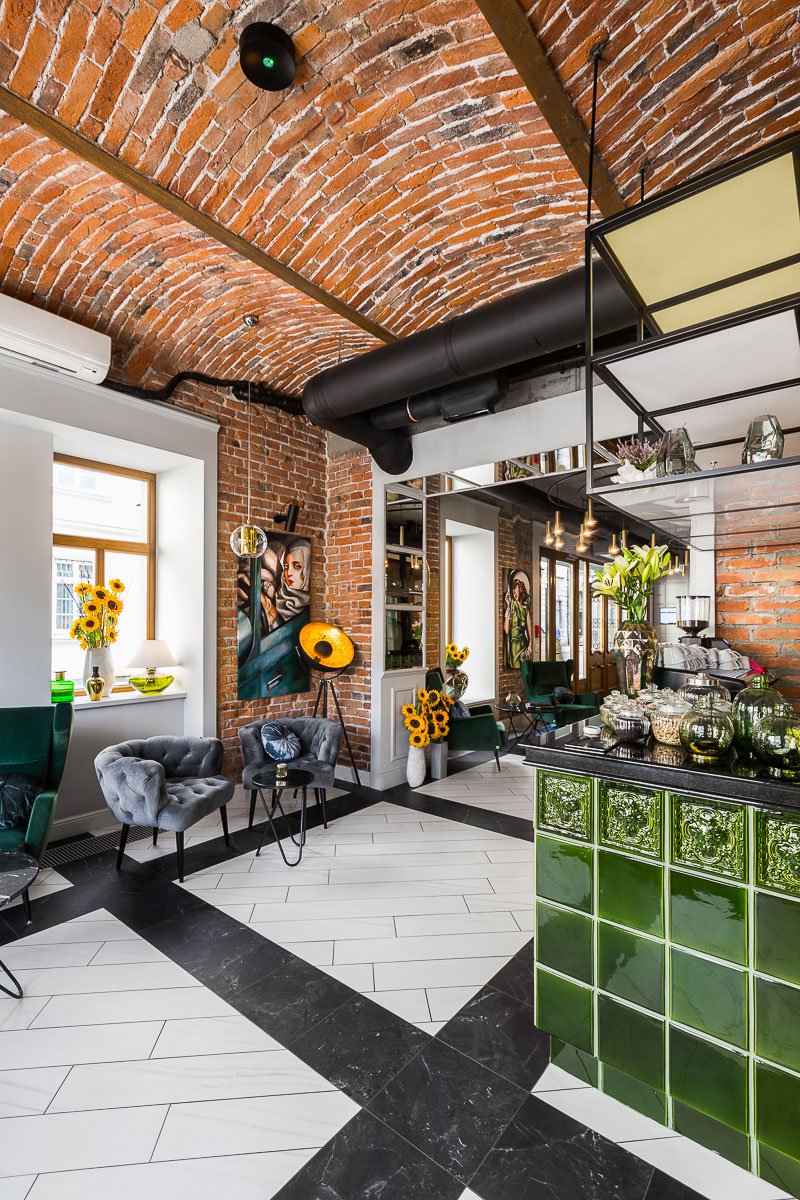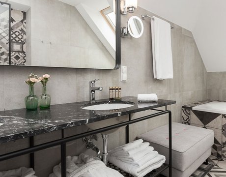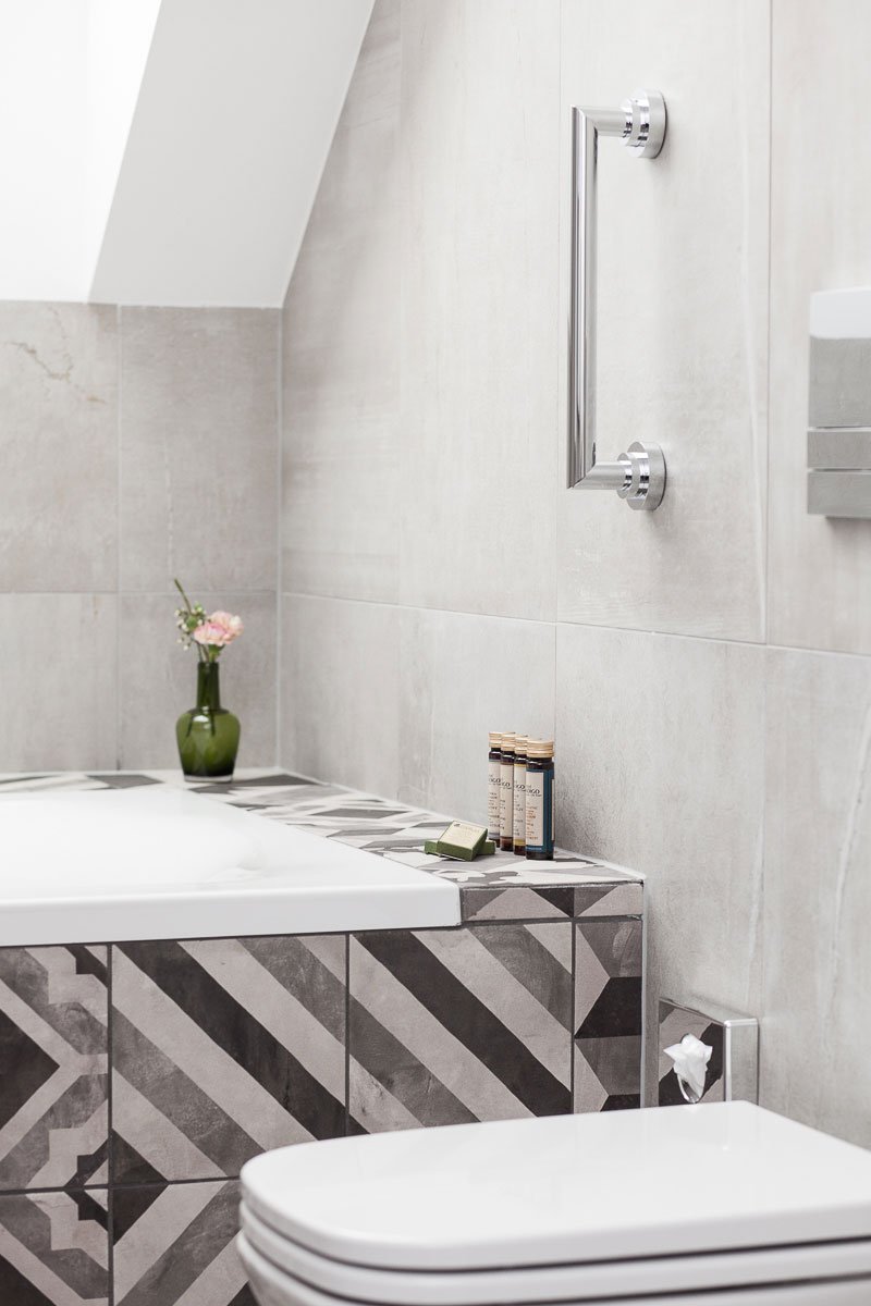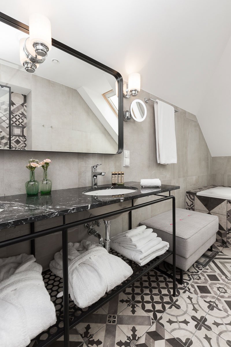 En este excéntrico hotel de Cracovia encontramos dos colecciones Marca Corona, StoneOne y Terra, elegidas para embellecer los baños de las numerosas suites. En el pavimento tenemos las elegantes baldosas hidráulicas Terra en el original Mix Decoro de tonos grises y, como revestimiento, podemos apreciar las superficies efecto piedra de StoneOne, modernas y decididas con su veteado natural.