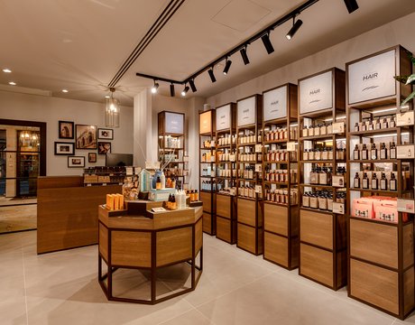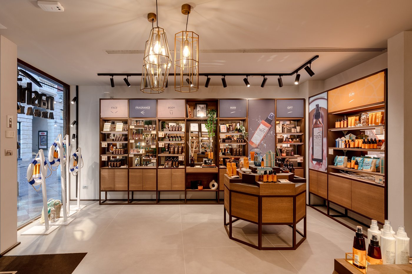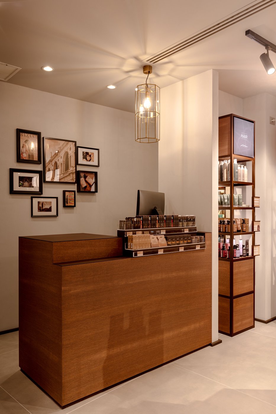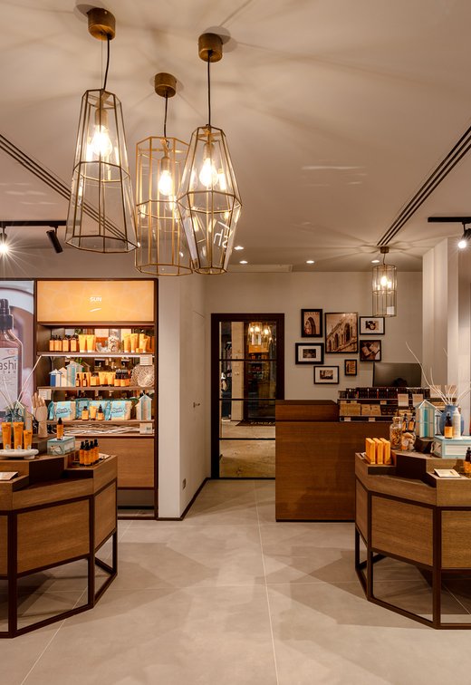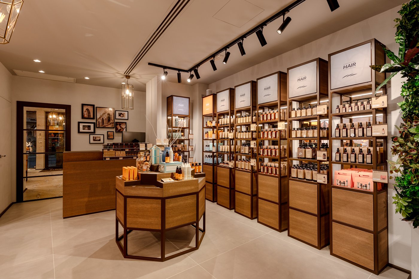 El objetivo del arquitecto responsable del proyecto era crear un espacio elegante que ofreciera al mismo tiempo la máxima visibilidad de los productos en venta, algo que se ha cumplido con creces, ya que, tras cruzar el umbral de la tienda, la sensación de bienestar y relax es casi inmediata gracias a los complementos de decoración en madera natural, un sistema de diseño lumínico con iluminación difusa y la elección de pavimentos y revestimientos en colores neutros, perfectos para potenciar la atmósfera tranquila que se respira en el interior de la tienda, además del delicioso aroma del argán contenido en cada cosmético.