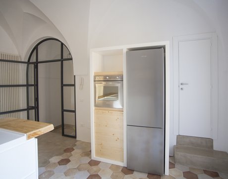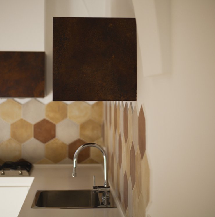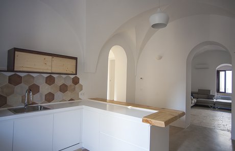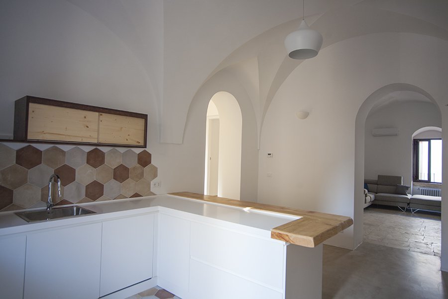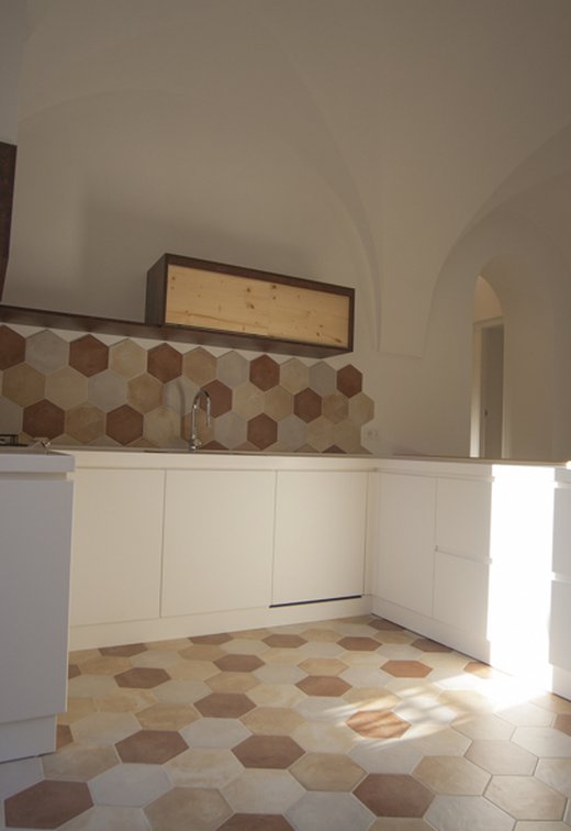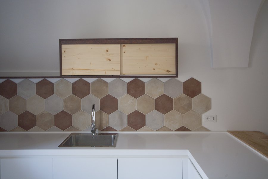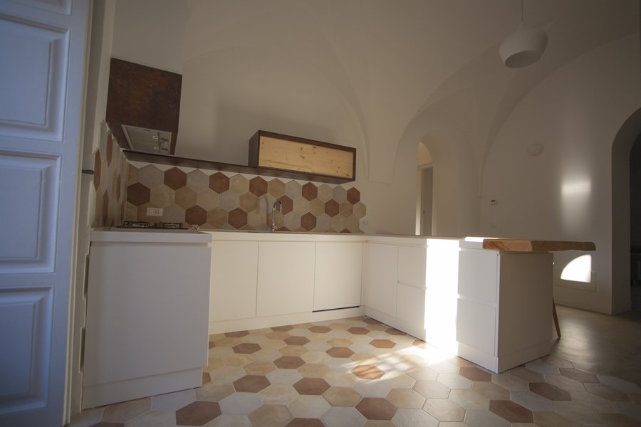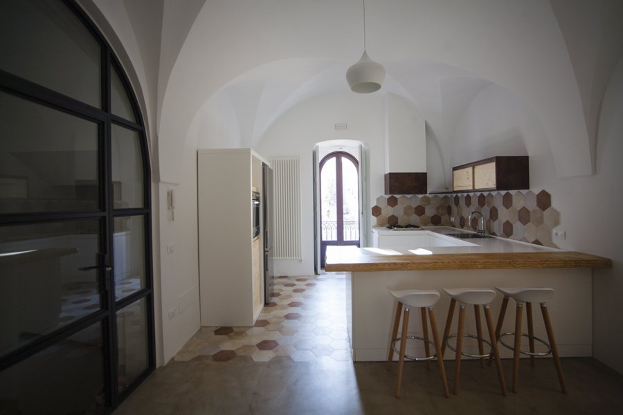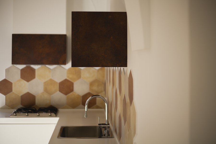 Con una vista impresionante a la iglesia de San Gioacchino y a todo el barrio de Ceglie Messaica, este apartamento reformado recientemente une a la austeridad de los muros antiguos y bóvedas de piedra la elegancia de modernas combinaciones matéricas. La protagonista indiscutible de la casa es la cocina, donde se ha colocado la serie Terra tanto en pavimento como en revestimiento; las baldosas hexagonales Marca Corona dan vida a una alfombra de tonos cálidos y envolventes y combinan a la perfección con el cemento, la madera y la piedra cándida que caracterizan el resto de la casa.