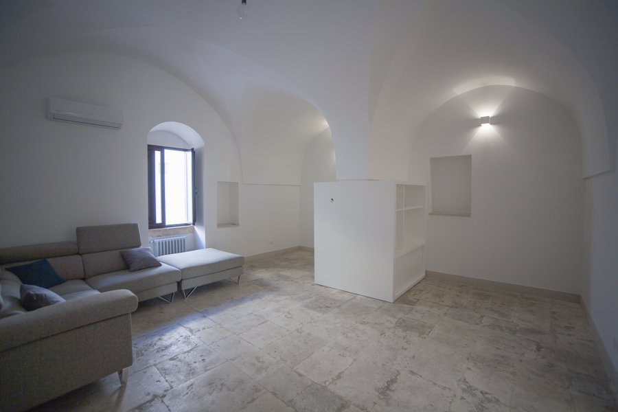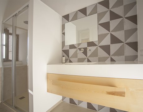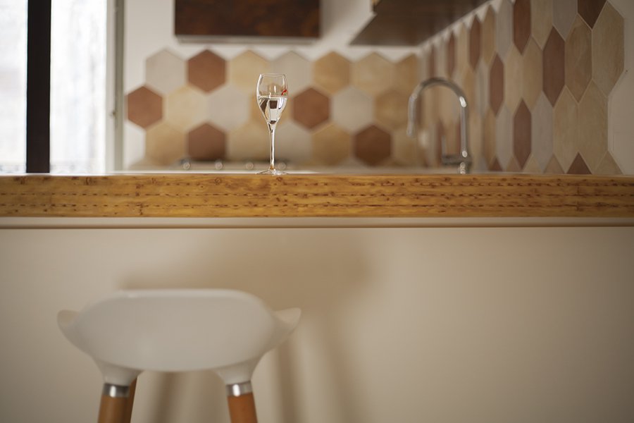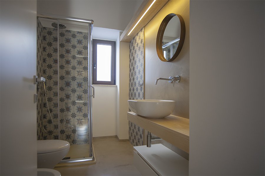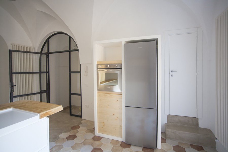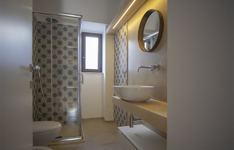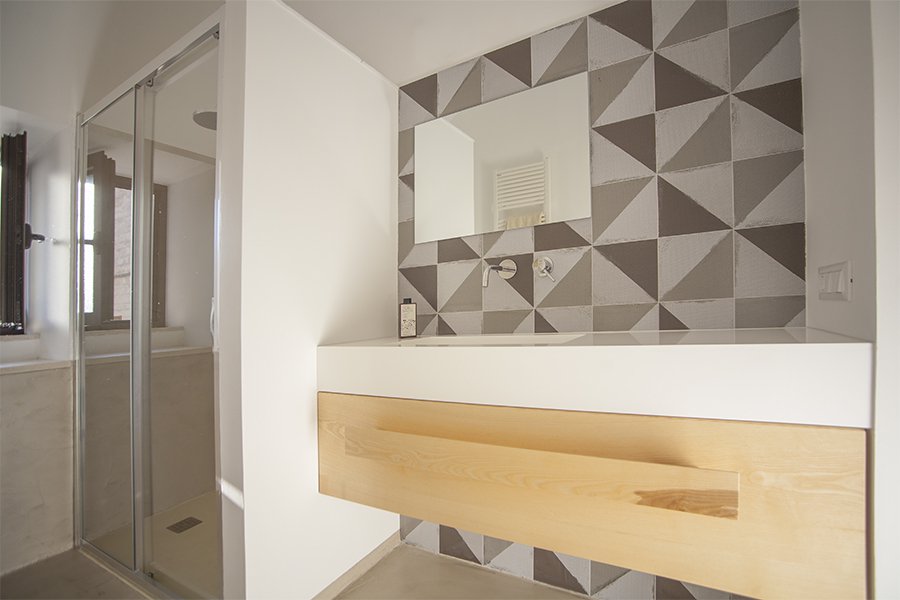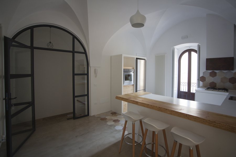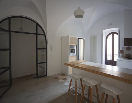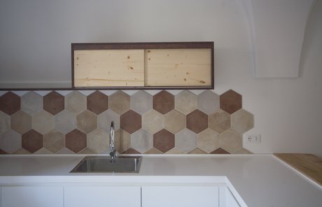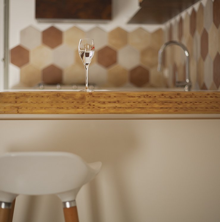 Con una vista impresionante a la iglesia de San Gioacchino y a todo el barrio de Ceglie Messaica, este apartamento reformado recientemente une a la austeridad de los muros antiguos y bóvedas de piedra la elegancia de modernas combinaciones matéricas. La protagonista indiscutible de la casa es la cocina, donde se ha colocado la serie Terra tanto en pavimento como en revestimiento; las baldosas hexagonales Marca Corona dan vida a una alfombra de tonos cálidos y envolventes y combinan a la perfección con el cemento, la madera y la piedra cándida que caracterizan el resto de la casa.