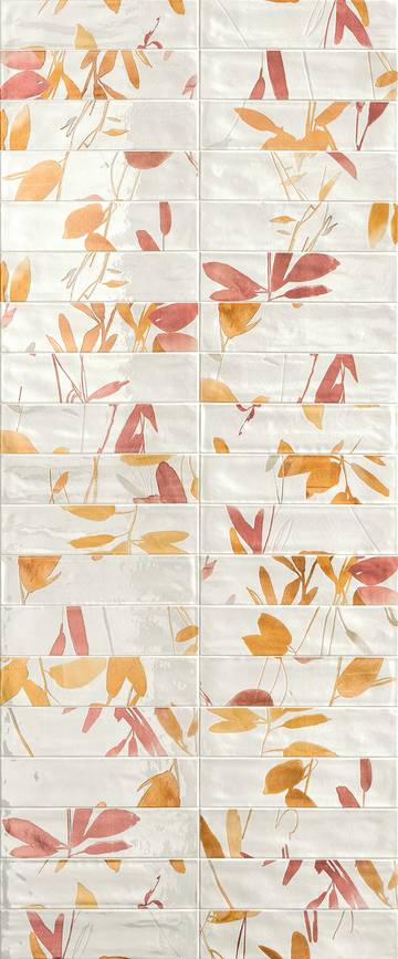 Huit couleurs d’esprit intimiste s’illuminent grâce à un matériau extrêmement brillant, qui apporte une consistance réaliste et une brillance vibrante aux surfaces. Des effets rendus encore plus vifs et profonds par une structure creuse aux angles ouvragés qui restitue la saveur unique des imperfections du travail réalisé à la main afin de contribuer à accroître la sensation de mouvement et de brillance de l’ensemble. Le résultat est un amalgame de qualités visuelles et tactiles naturellement accentuées dans le format Brick 7,5x30, adapté aux combinaisons de pose les plus variées, et idéal en répétition afin d’amplifier les phénomènes de réflexion de la lumière. L’esprit décoratif de la collection est enrichi par la décoration Ramage, dont les feuilles en finition satinée s’impriment sur des surfaces brillantes pour créer un contraste raffiné entre brillant et mat.