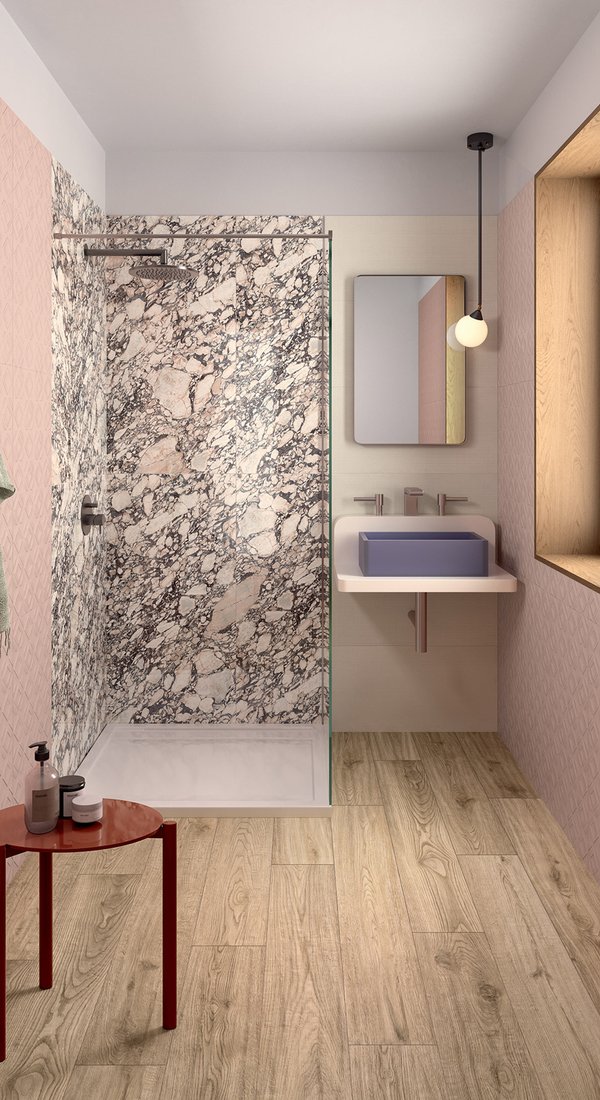 Les carreaux roses sont un choix élégant et délicat pour ceux qui souhaitent ajouter une touche de couleur à leurs pièces. Le rose, avec ses nuances allant du pastel aux tons plus clairs, s'intègre parfaitement dans une palette de couleurs qui privilégie les tons neutres, créant un environnement relaxant et accueillant. Les carreaux de porcelaine rose peuvent être combinés avec des matériaux naturels comme le bois ou le métal, créant ainsi un environnement qui équilibre modernité et confort.