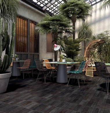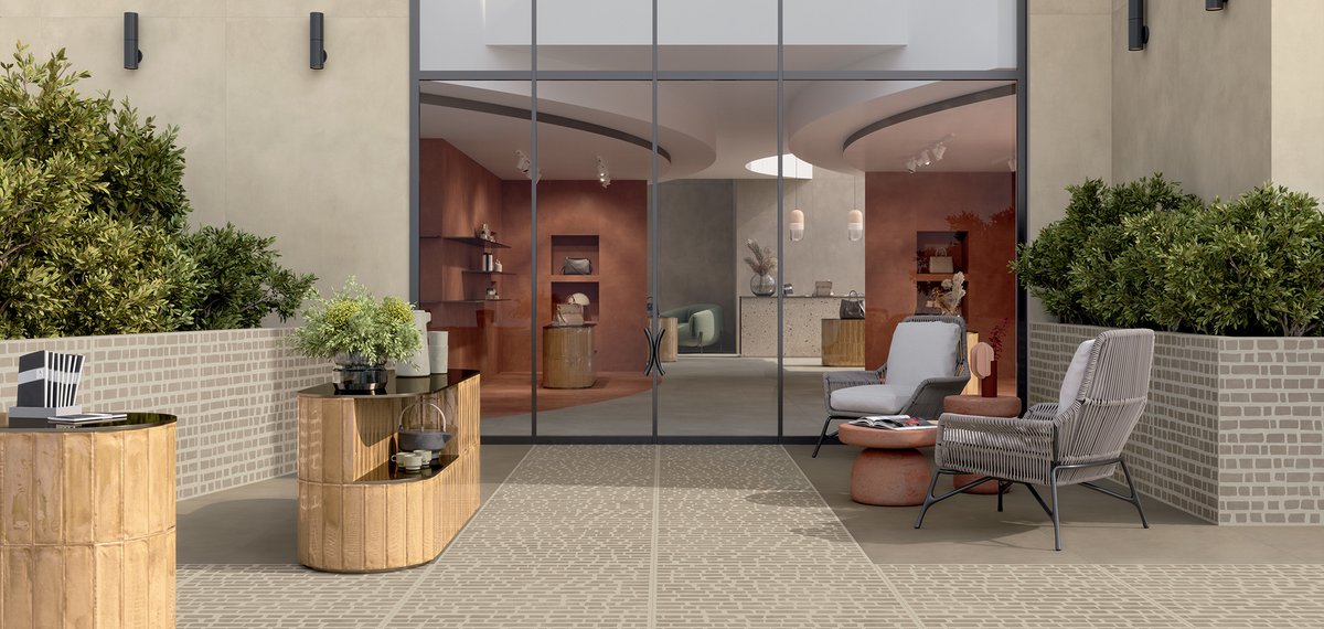 Les collections de céramique de Marca Corona comprennent également une vaste sélection de carreaux pour l'extérieur, conçus pour transformer les jardins, balcons, terrasses, piscines, allées et grands espaces partagés en espaces scéniques de design.