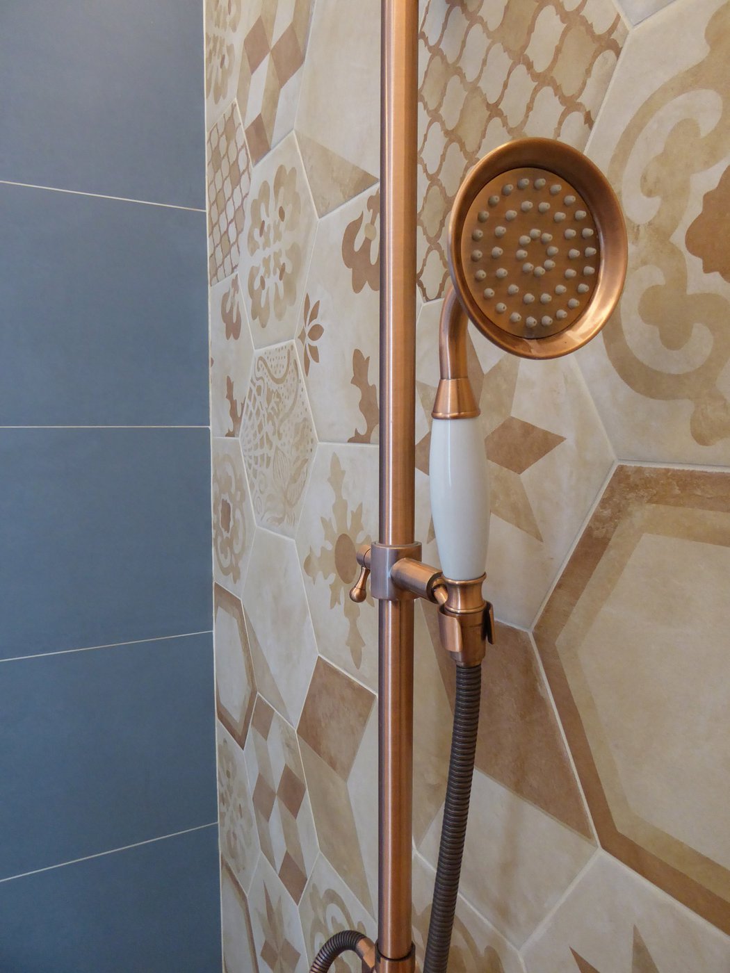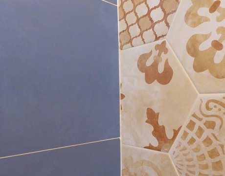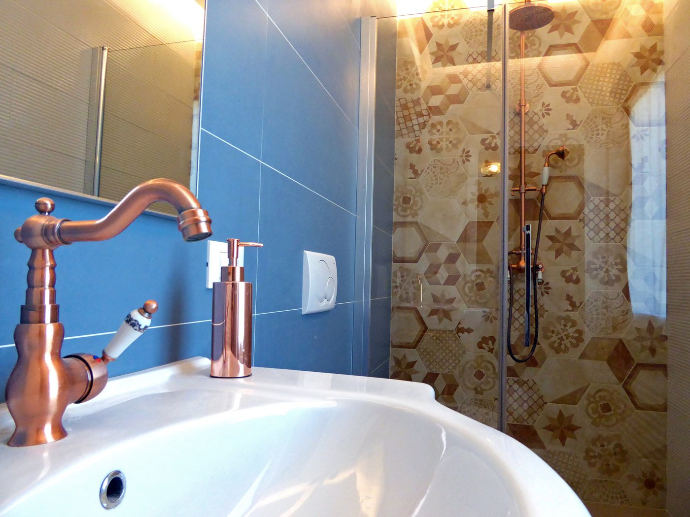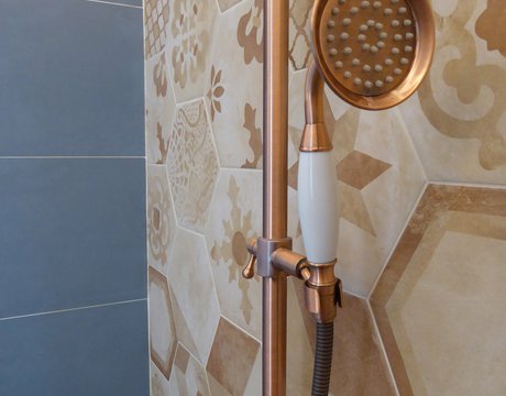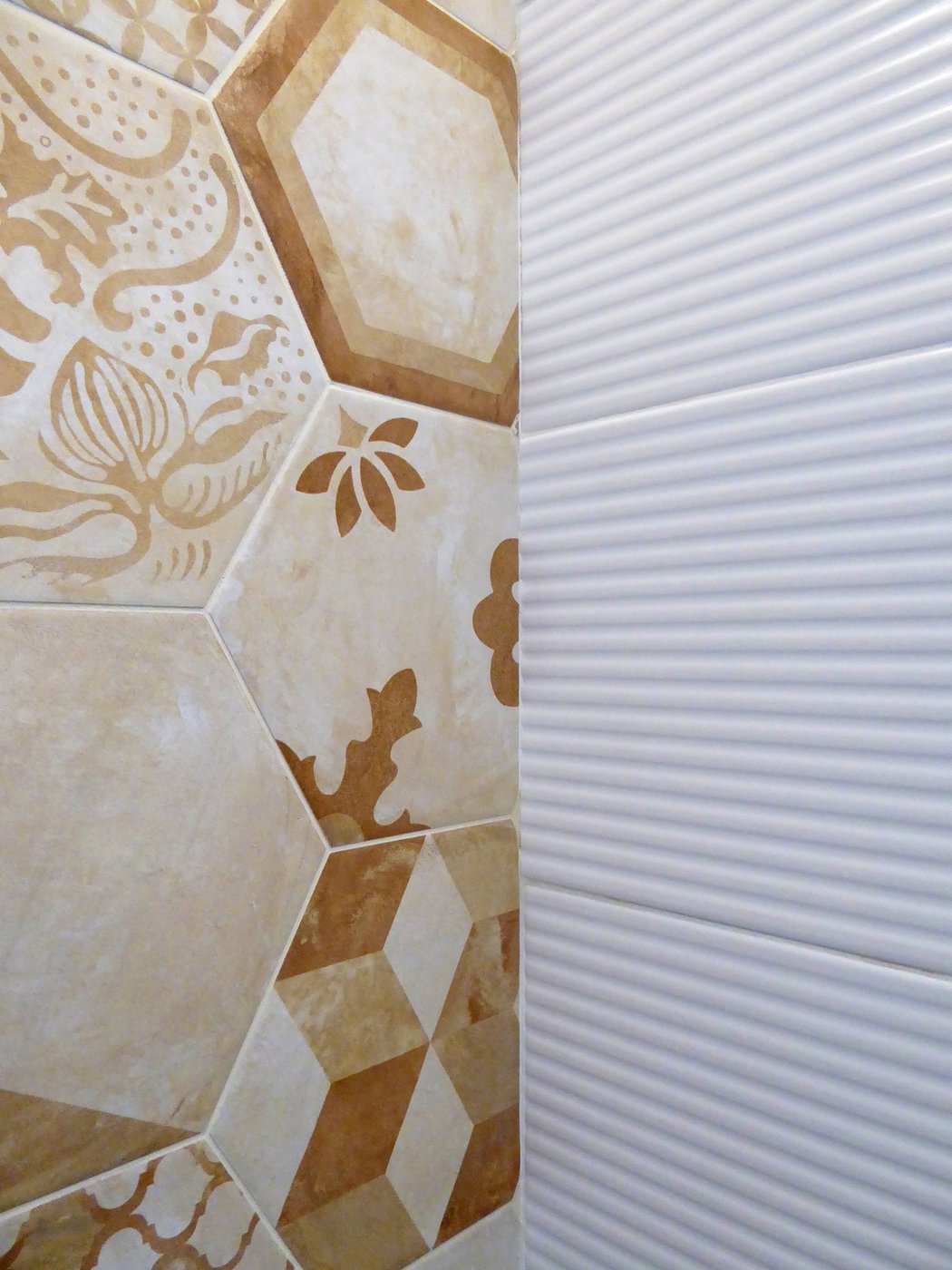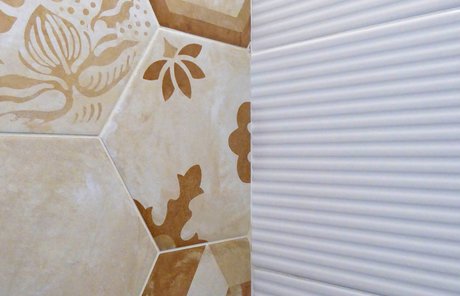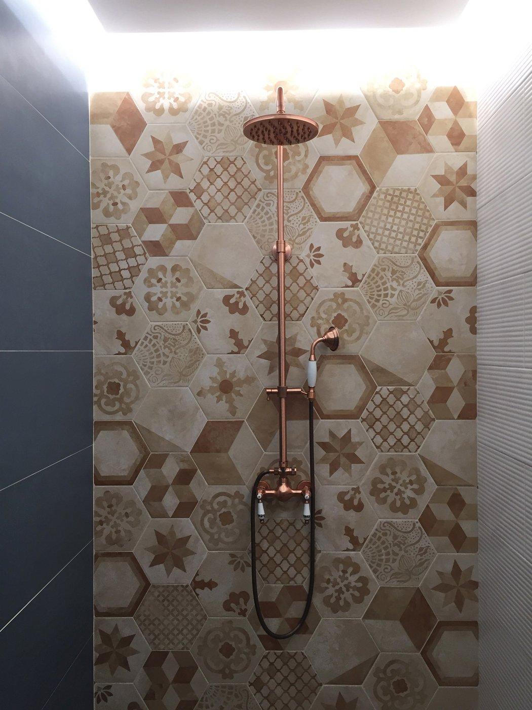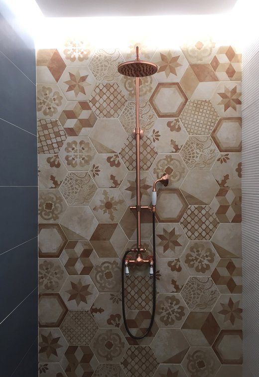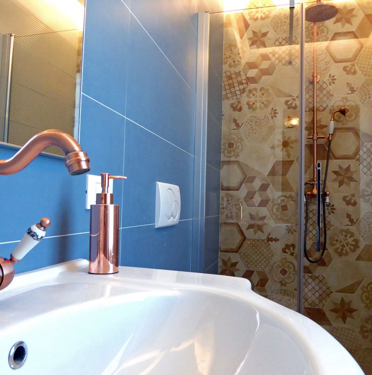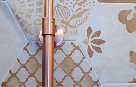 Pour la récente restructuration de cette salle de bain résidentielle on a misé sur la chaleur et l’originalité de la collection Terra. Les carreaux ciment Marca Corona de format hexagonal représentent en effet l’alliance idéale entre le classique et le moderne, parfaites en coordination sur les murs de couleur franche. La paroi de douche saisit les hôtes au premier regard grâce à l’originale combinaison des décors graphiques et aux raffinées robinetteries en cuivre.