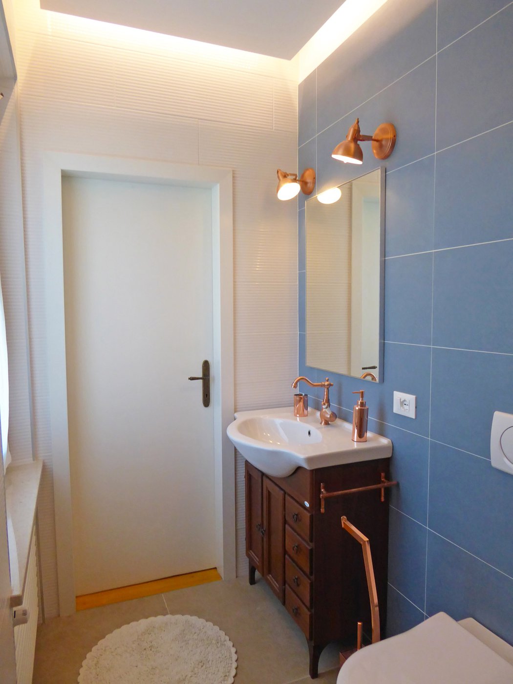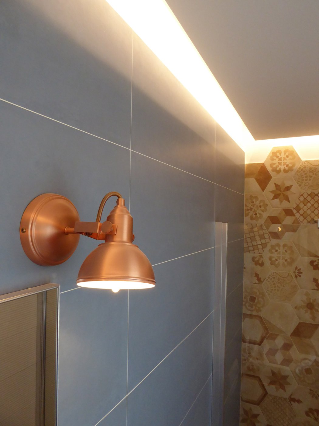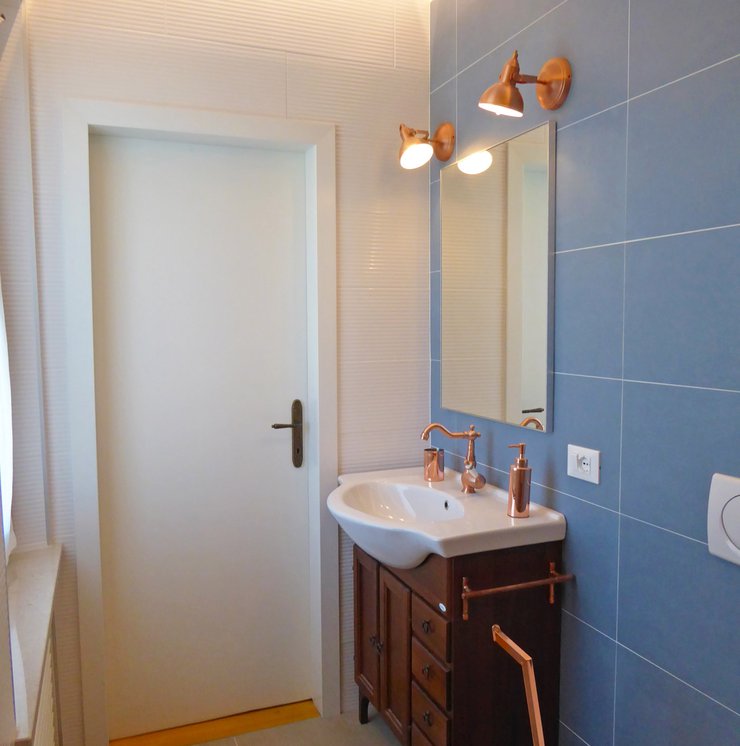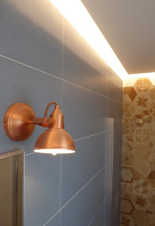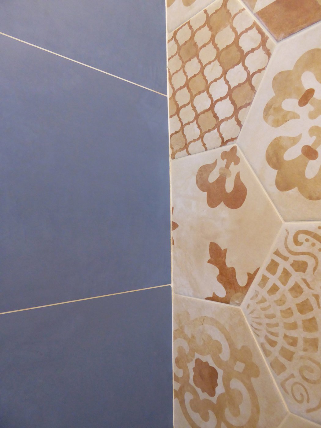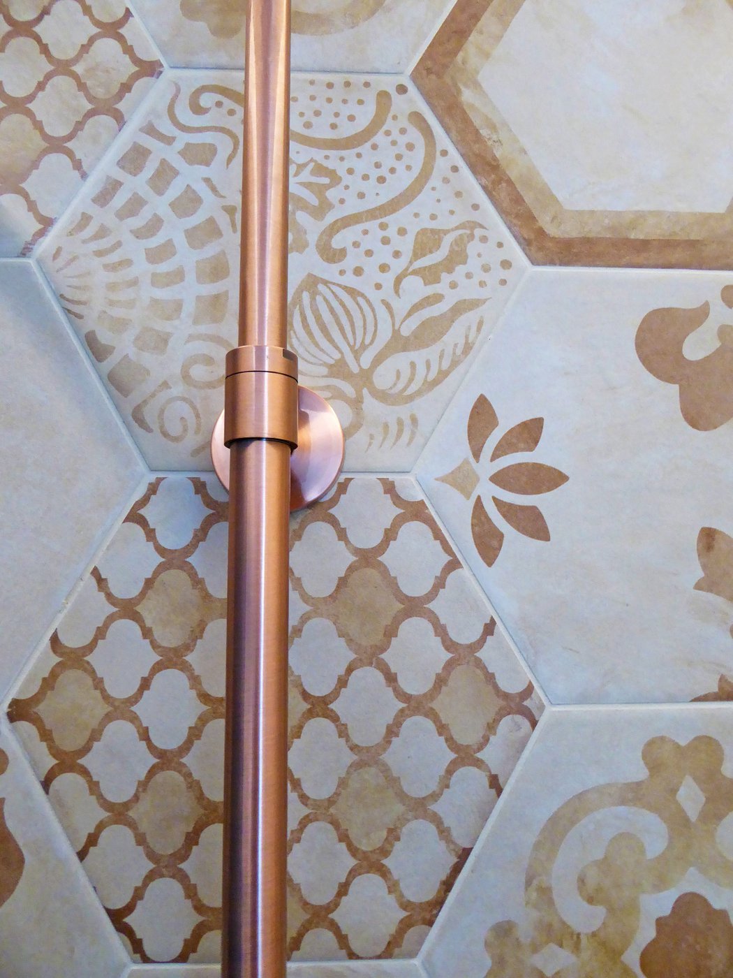 Pour la récente restructuration de cette salle de bain résidentielle on a misé sur la chaleur et l’originalité de la collection Terra. Les carreaux ciment Marca Corona de format hexagonal représentent en effet l’alliance idéale entre le classique et le moderne, parfaites en coordination sur les murs de couleur franche. La paroi de douche saisit les hôtes au premier regard grâce à l’originale combinaison des décors graphiques et aux raffinées robinetteries en cuivre.