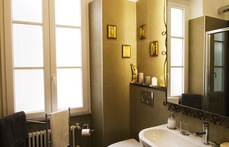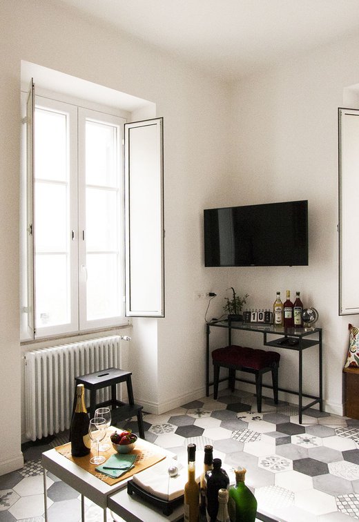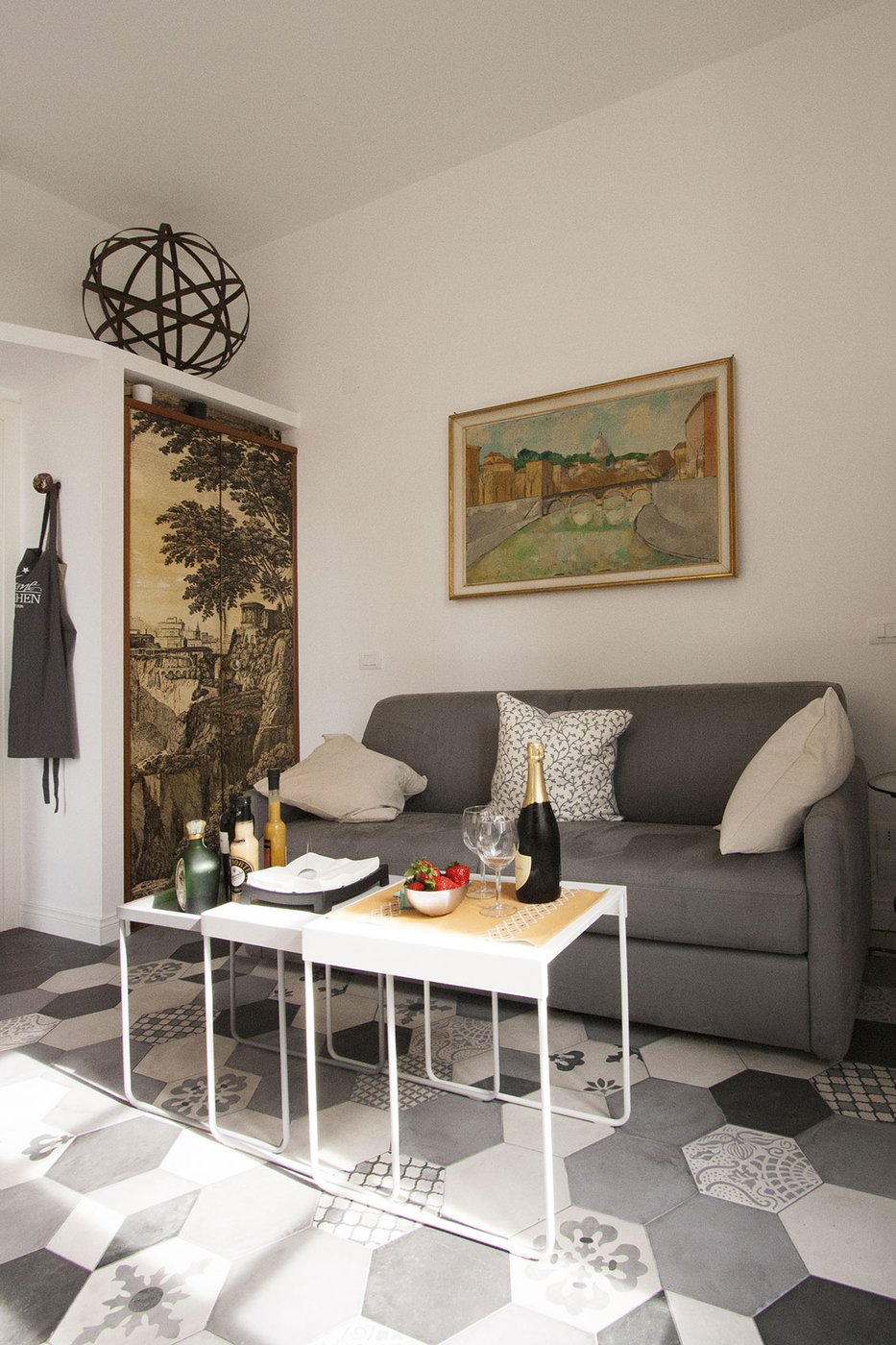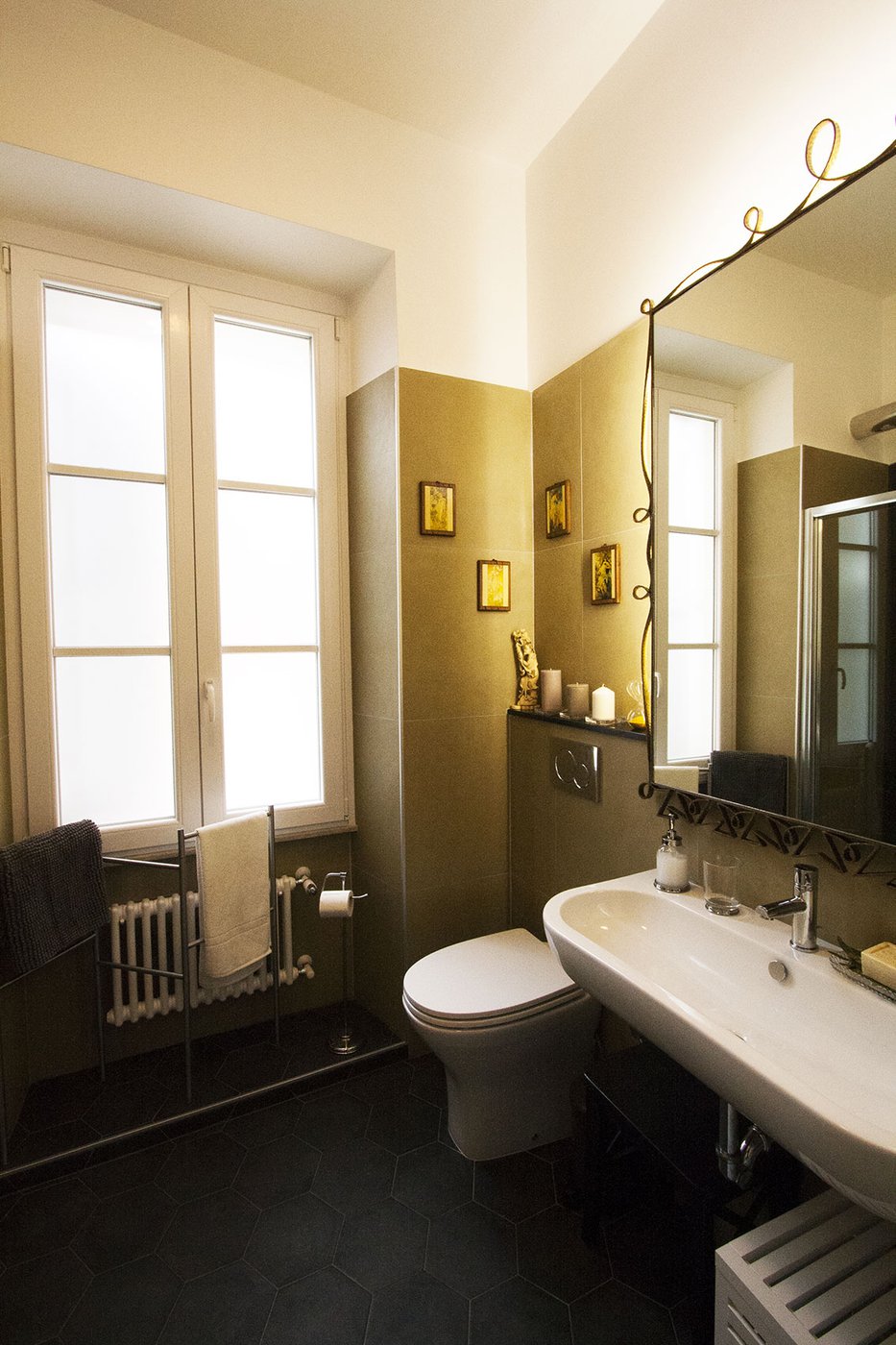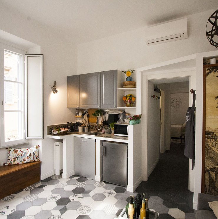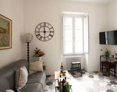 Un appartement de style « Bohème » à deux pas des Musées du Vatican à Rome. Les carreaux de ciment Terra sont idéals pour apporter à chaque pièce une touche de fantaisie et d’élégance. Dans l’espace jour et dans la chambre à coucher, l’original format hexagonal du Mix Decori F donne vie à un irrésistible jeu de motifs et de nuances délicatement poudreuses. Pour le sol de salle de bain, un raffiné tapis monochrome a été réalisé, composé de Terra Antracite 25x21,6.