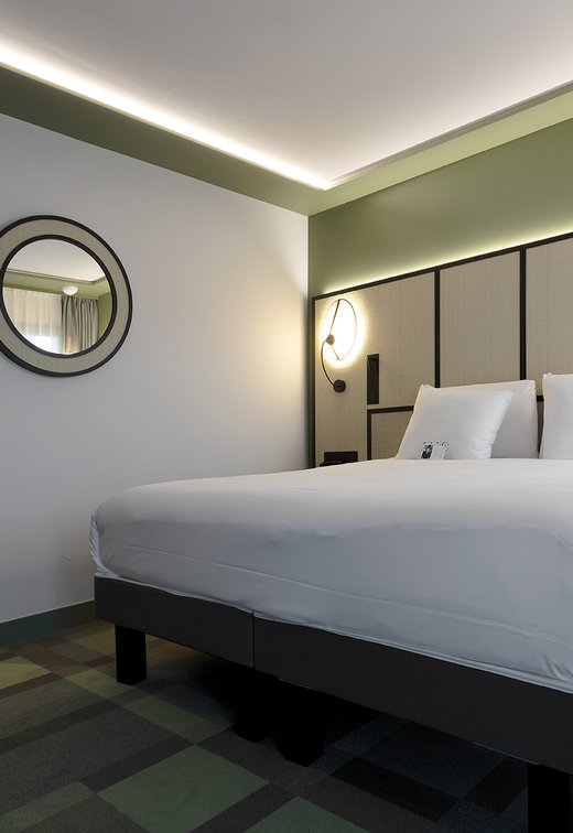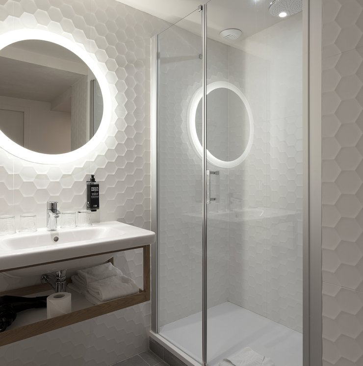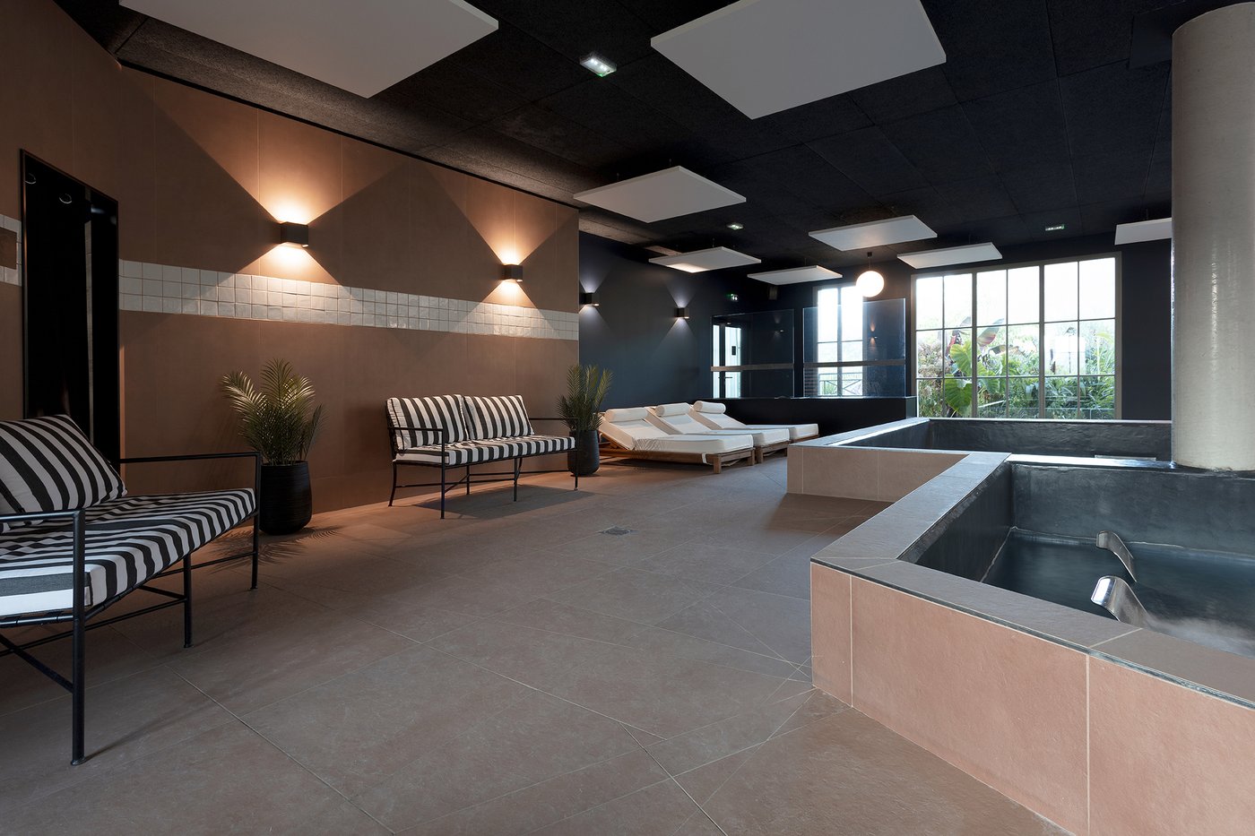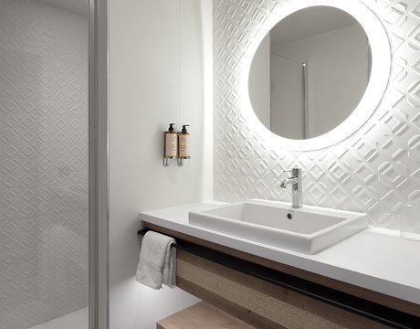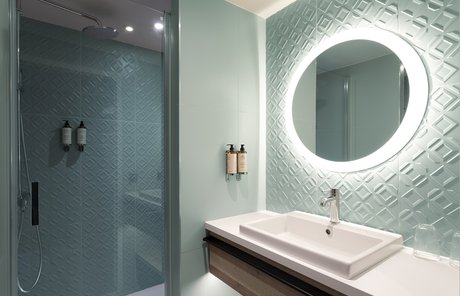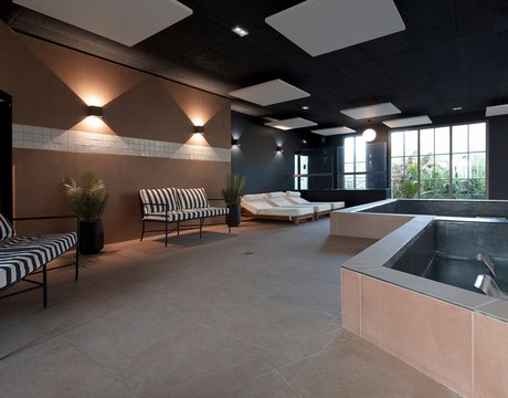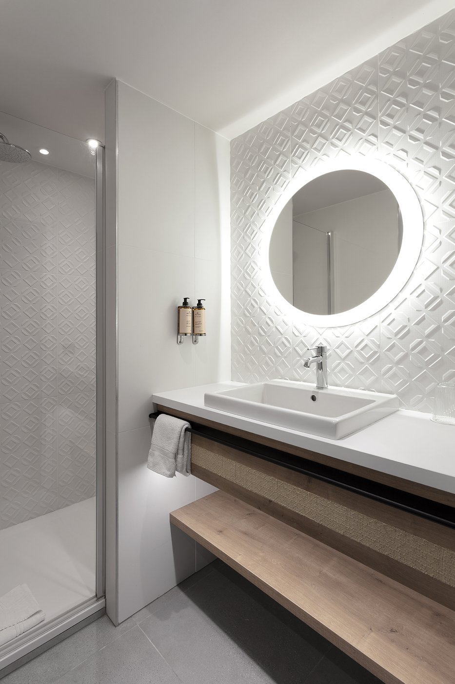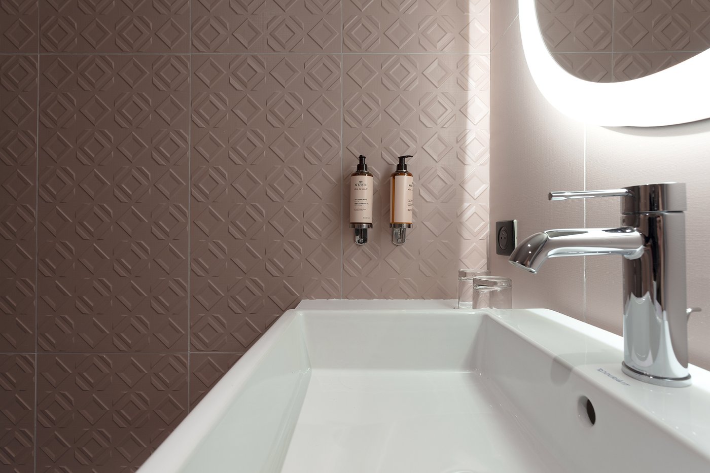 Pour rénover l’espace bien-être commun aux trois établissements et pour les chambres de chaque hôtel, le studio Roque Intérieurs a choisi le prestige et la qualité des sols et de revêtements en grès cérame signés Marca Corona. Voyons en détail lesquels ! Dans le grand spa doté de piscine et solarium, nous trouvons les précieuses surfaces Overclay installées au sol et en revêtement dans différents formats. Parfaites pour réchauffer l’environnement et le rendre encore plus chic et exclusif, elles garantissent une résistance à l’humidité et une sécurité maximale grâce à leurs propriétés antidérapantes. Poursuivant la découverte de chaque établissement, on peut remarquer l’utilisation de différentes collections céramiques Marca Corona pour décorer les salles de bains présentes dans les chambres et suites : les dalles raffinées effet marbre Foyer, proposées dans la variante Joy, offrent un effet lumineux et glamour aux salles de bains de l’hôtel Tribe : la collection éclectique et très colorée de revêtements Victoria mise sur le motif tridimensionnel Art pour créer un agréable effet relief le long des murs, tandis que les surfaces matérielles Phase et les revêtements originaux 4D ornent les murs et sols du dernier hôtel de complexe hôtelier, l’Ibis Style.