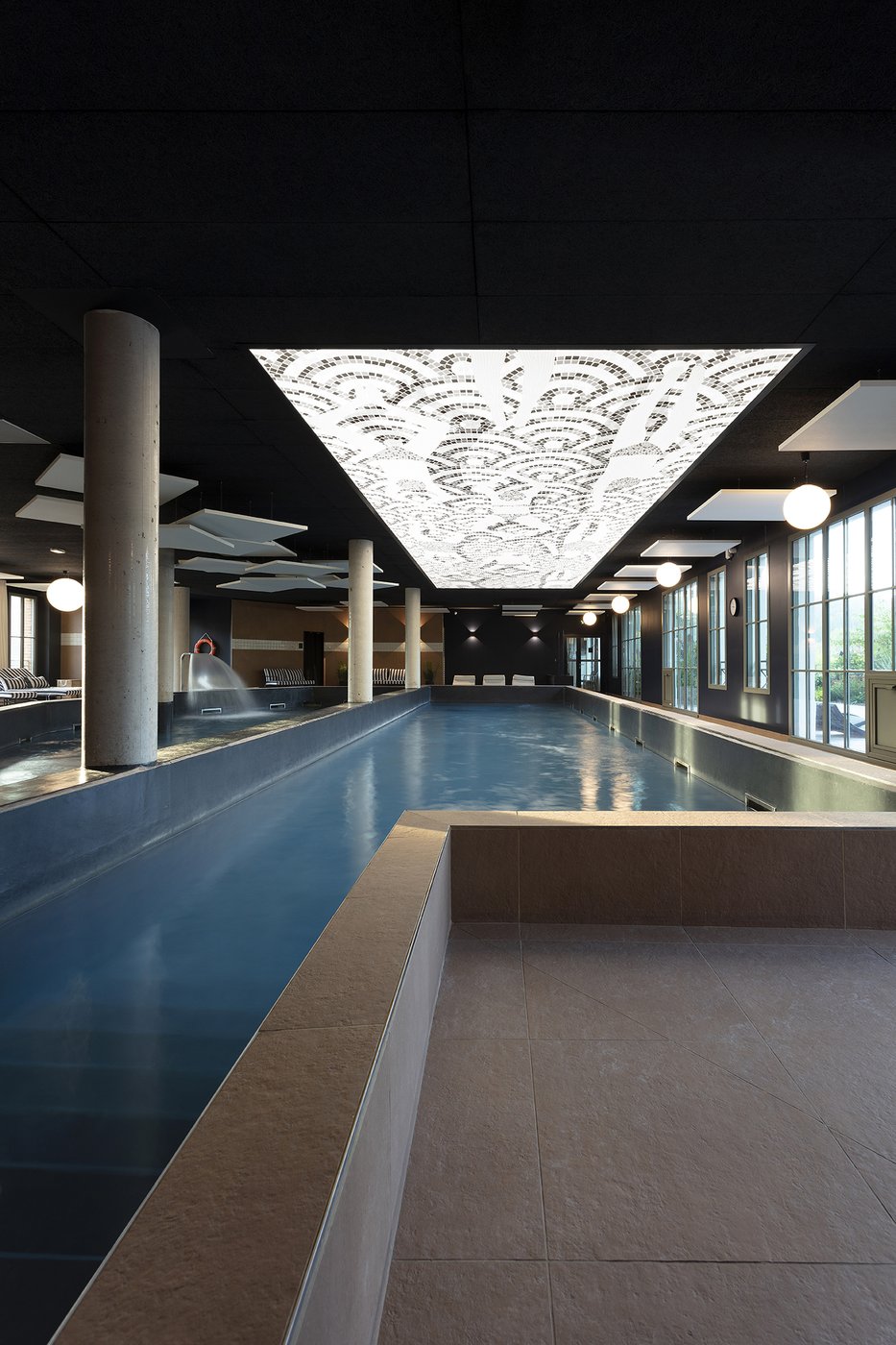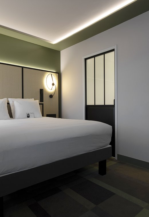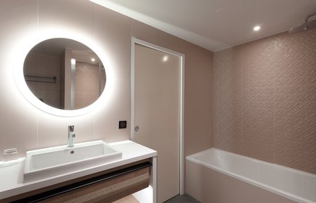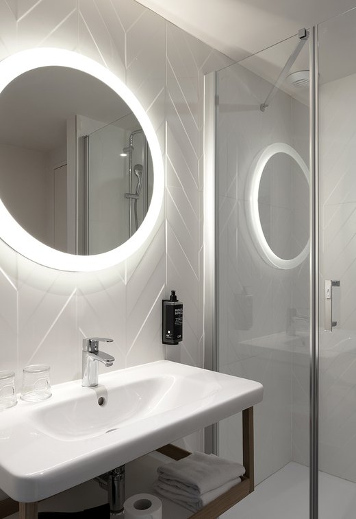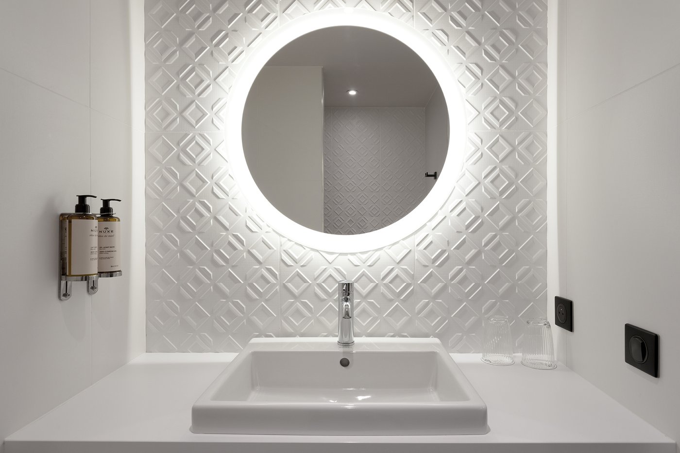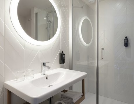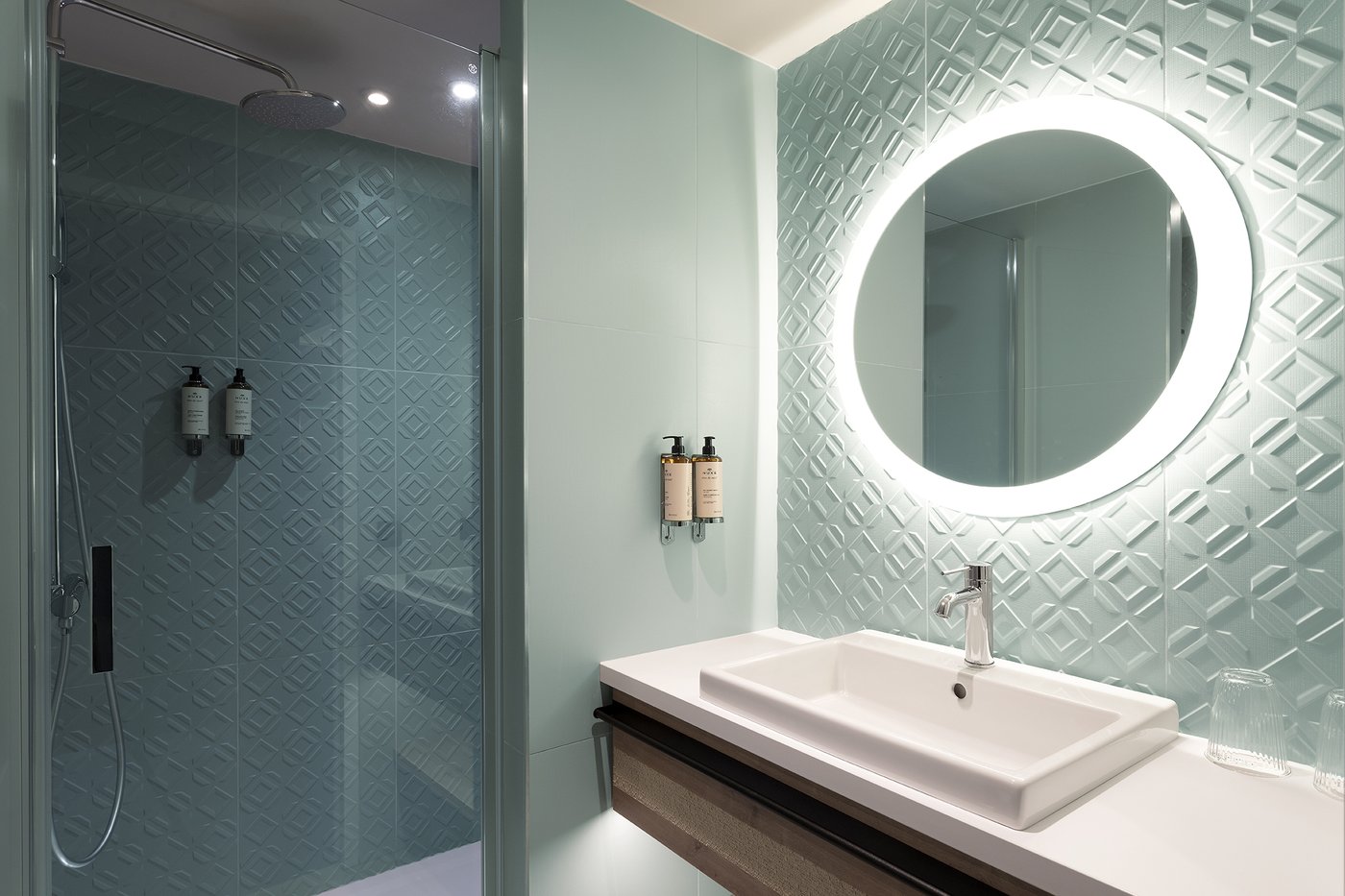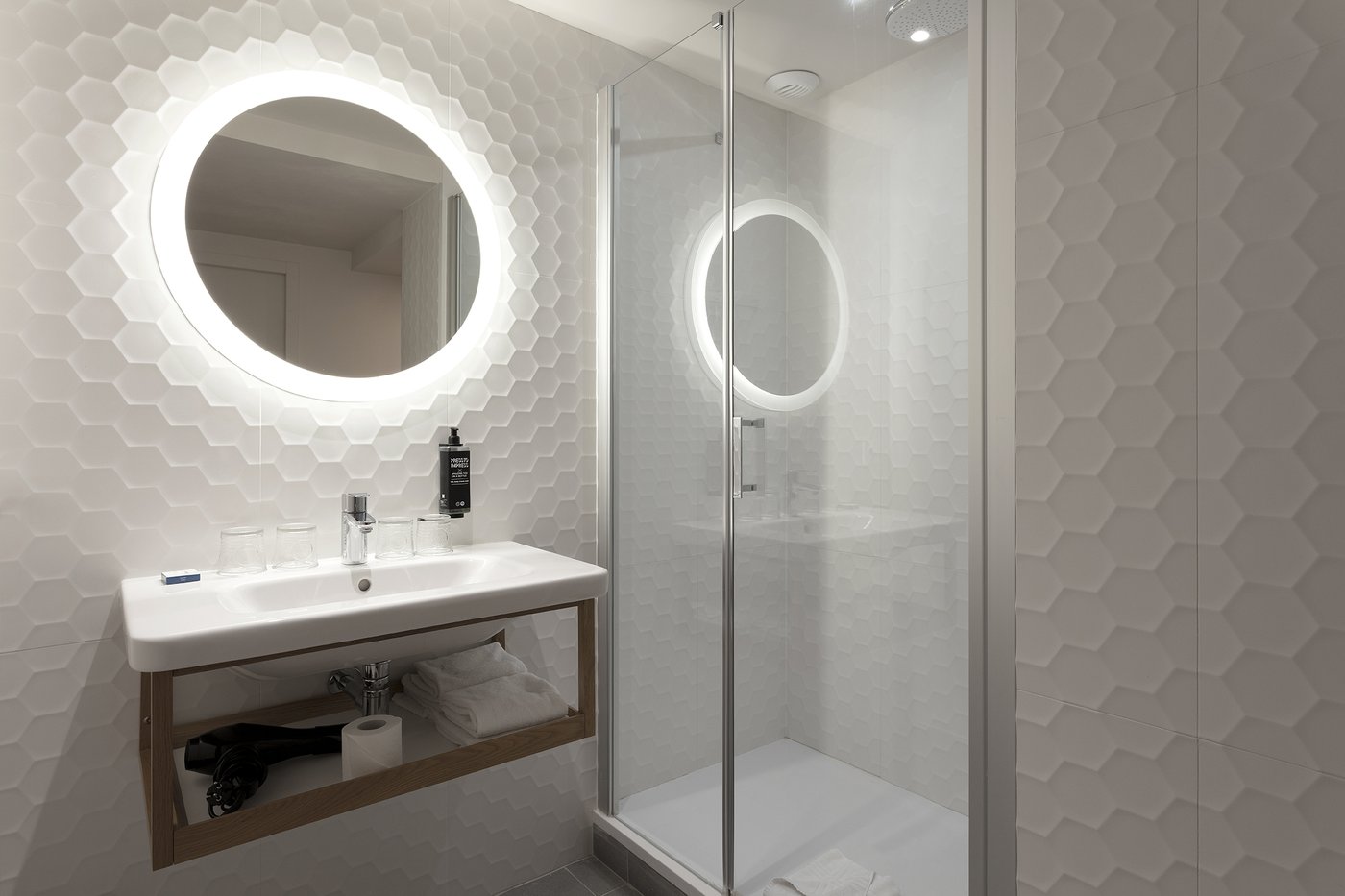 Pour rénover l’espace bien-être commun aux trois établissements et pour les chambres de chaque hôtel, le studio Roque Intérieurs a choisi le prestige et la qualité des sols et de revêtements en grès cérame signés Marca Corona. Voyons en détail lesquels ! Dans le grand spa doté de piscine et solarium, nous trouvons les précieuses surfaces Overclay installées au sol et en revêtement dans différents formats. Parfaites pour réchauffer l’environnement et le rendre encore plus chic et exclusif, elles garantissent une résistance à l’humidité et une sécurité maximale grâce à leurs propriétés antidérapantes. Poursuivant la découverte de chaque établissement, on peut remarquer l’utilisation de différentes collections céramiques Marca Corona pour décorer les salles de bains présentes dans les chambres et suites : les dalles raffinées effet marbre Foyer, proposées dans la variante Joy, offrent un effet lumineux et glamour aux salles de bains de l’hôtel Tribe : la collection éclectique et très colorée de revêtements Victoria mise sur le motif tridimensionnel Art pour créer un agréable effet relief le long des murs, tandis que les surfaces matérielles Phase et les revêtements originaux 4D ornent les murs et sols du dernier hôtel de complexe hôtelier, l’Ibis Style.
