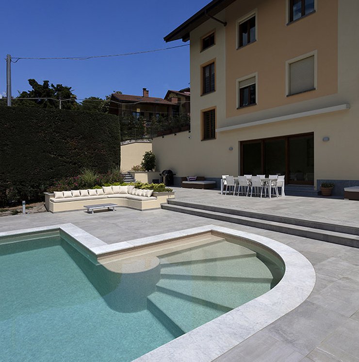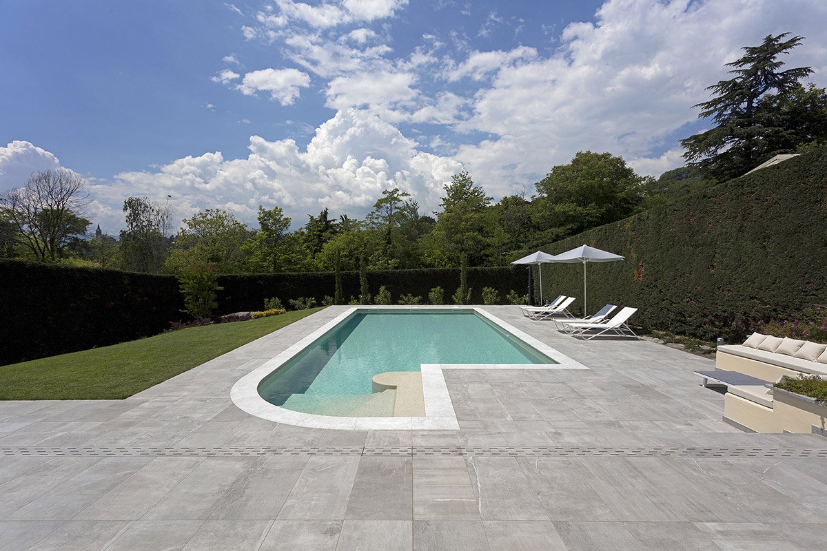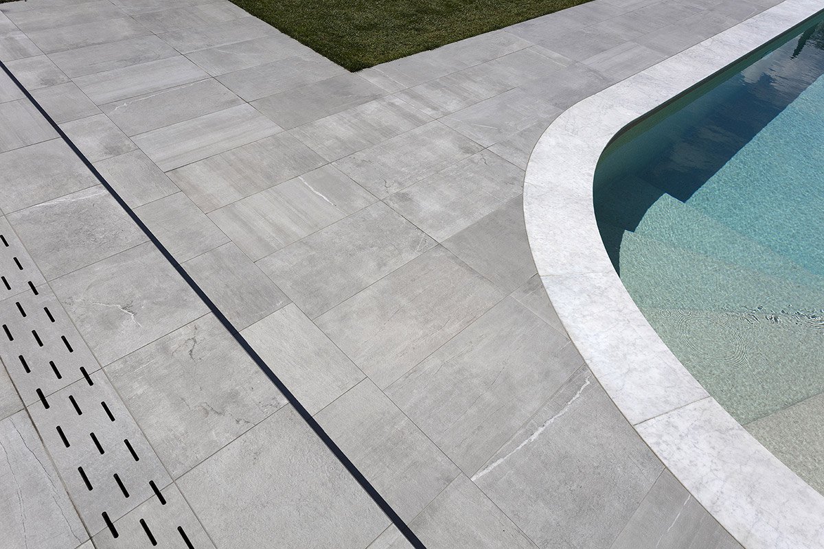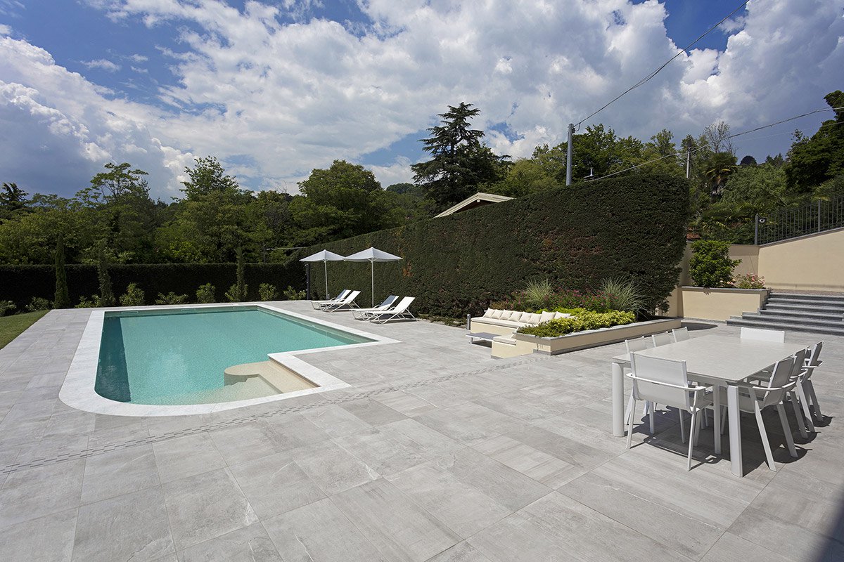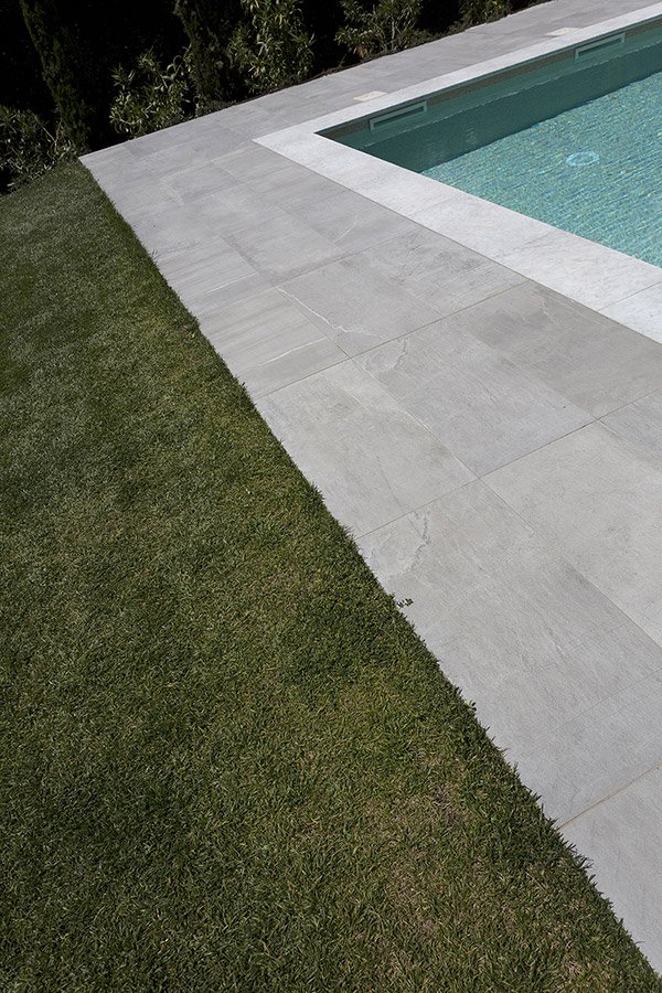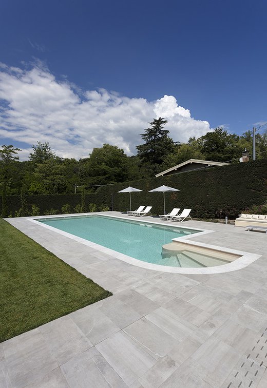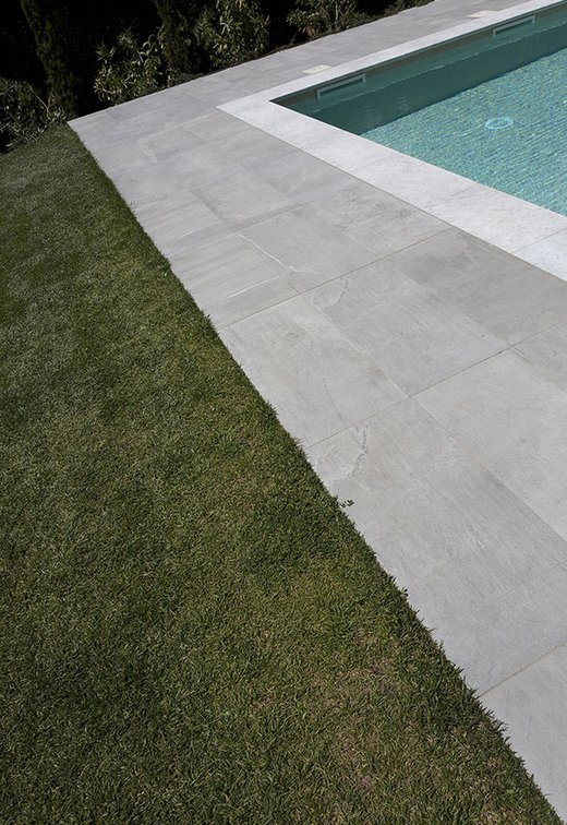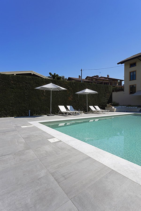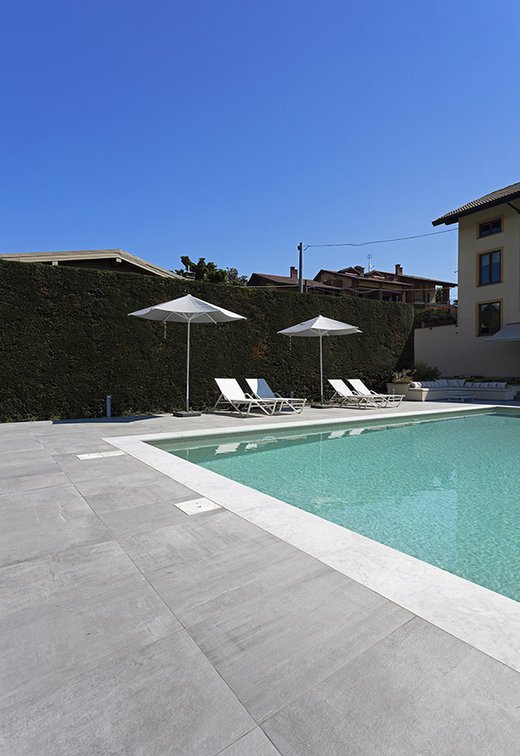 Le grand jardin, la magnifique piscine extérieure et la zone relax, sont mis en valeur par l’expressivité graphique de StoneOne, dans l’élégante tonalité Silver.