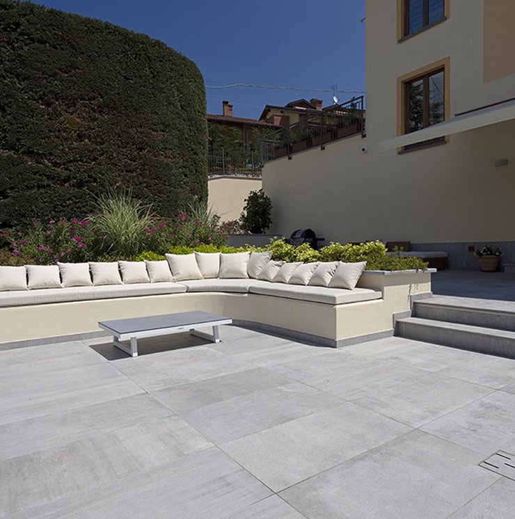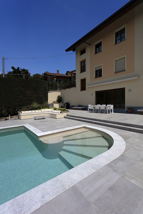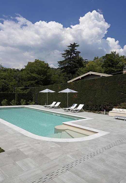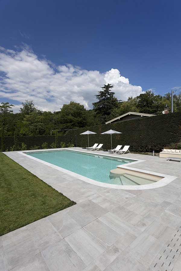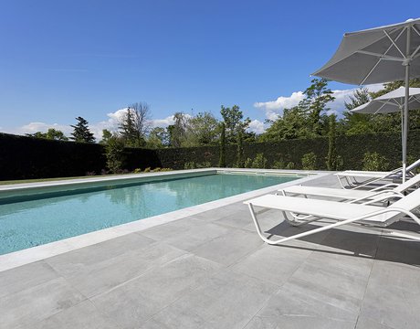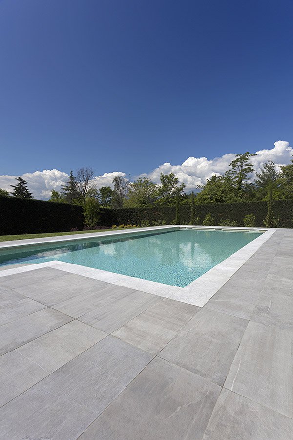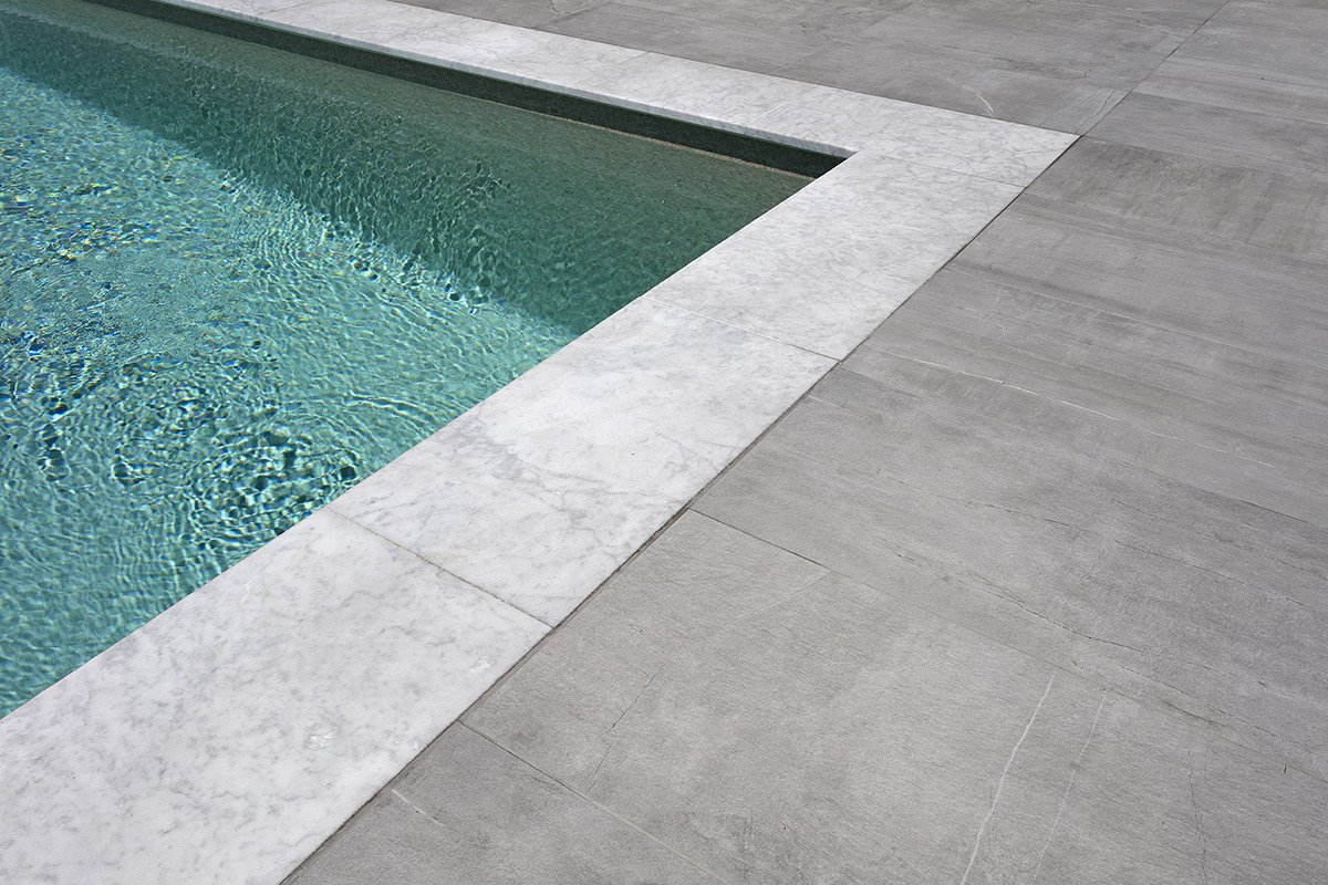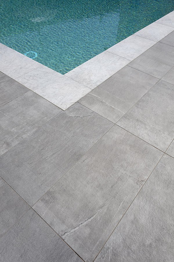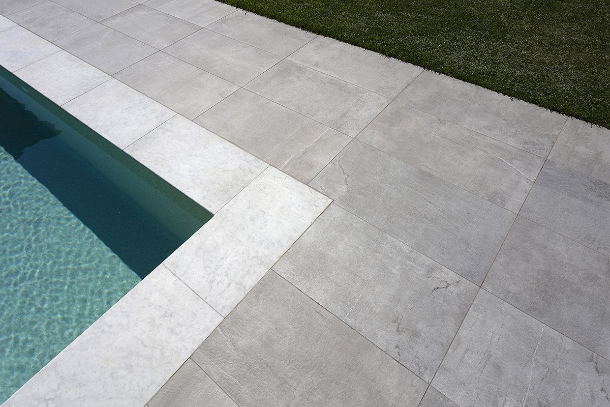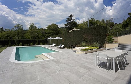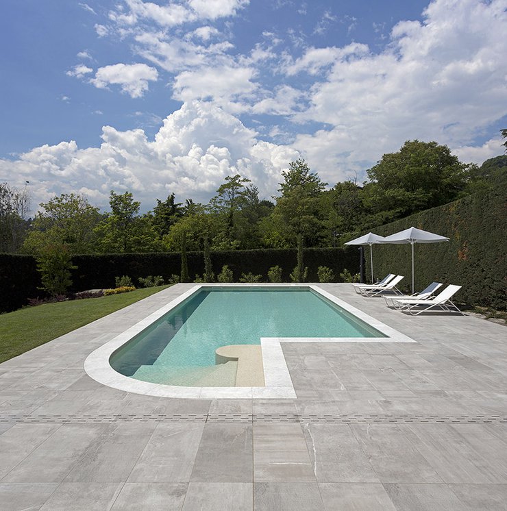 Le grand jardin, la magnifique piscine extérieure et la zone relax, sont mis en valeur par l’expressivité graphique de StoneOne, dans l’élégante tonalité Silver.