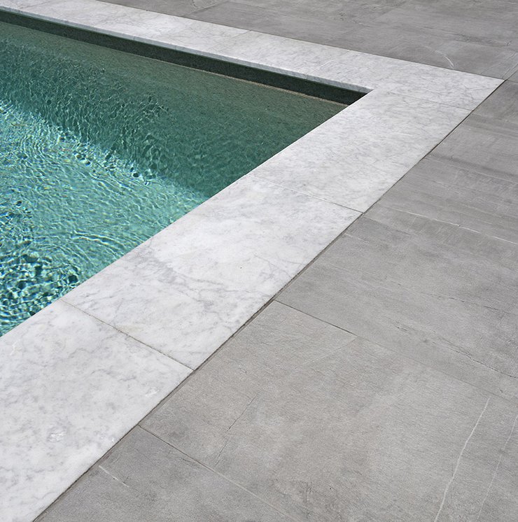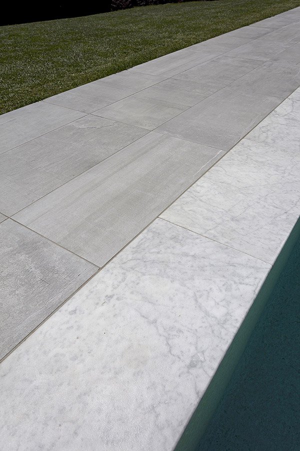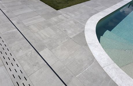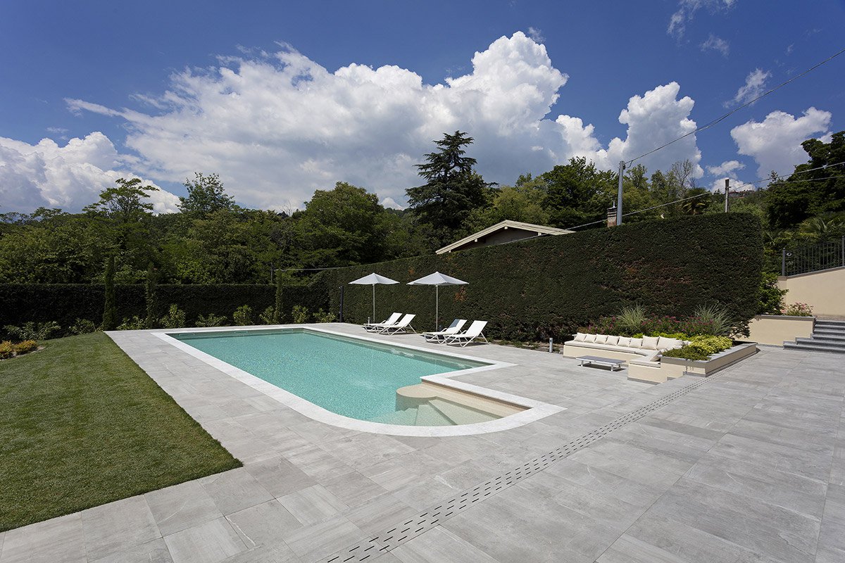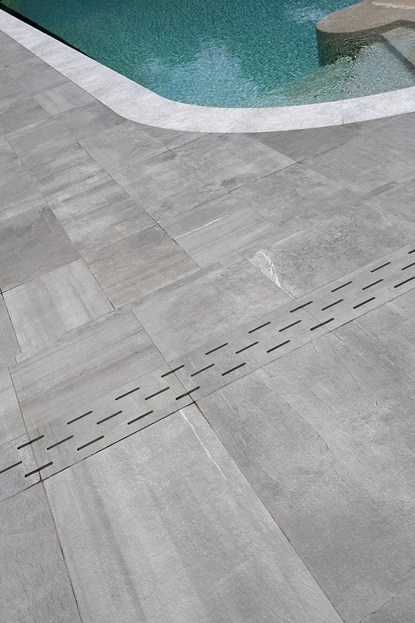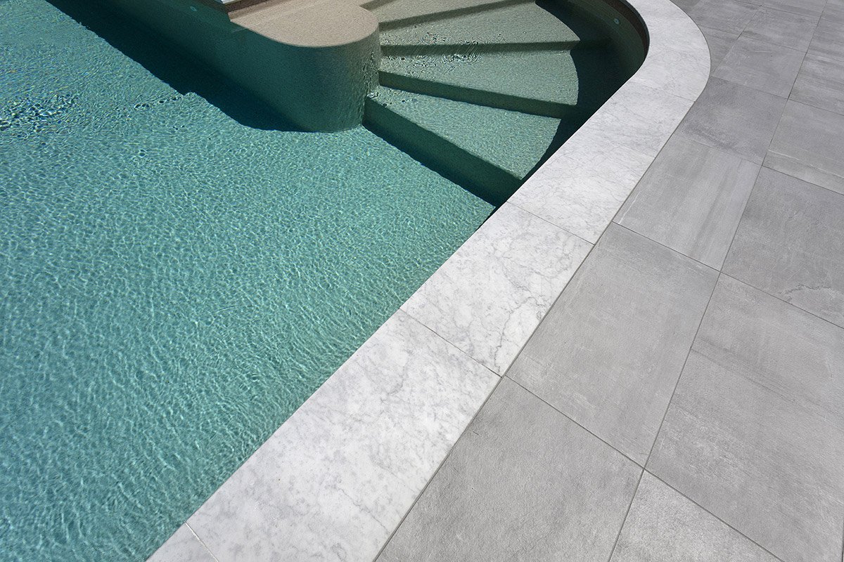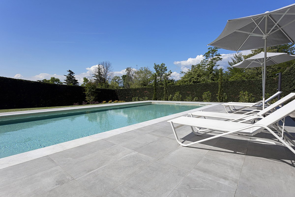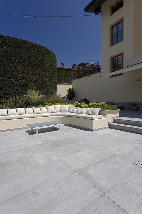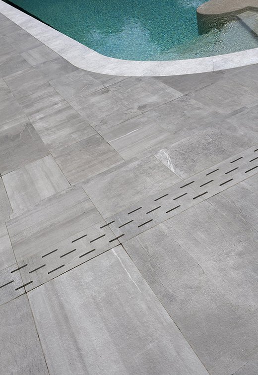 Le grand jardin, la magnifique piscine extérieure et la zone relax, sont mis en valeur par l’expressivité graphique de StoneOne, dans l’élégante tonalité Silver.