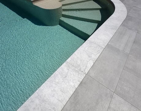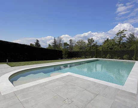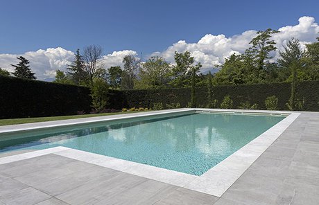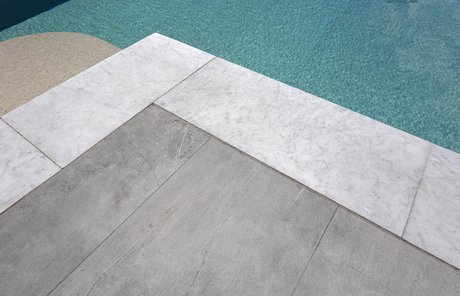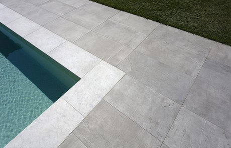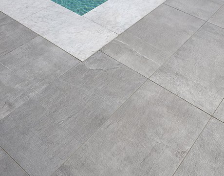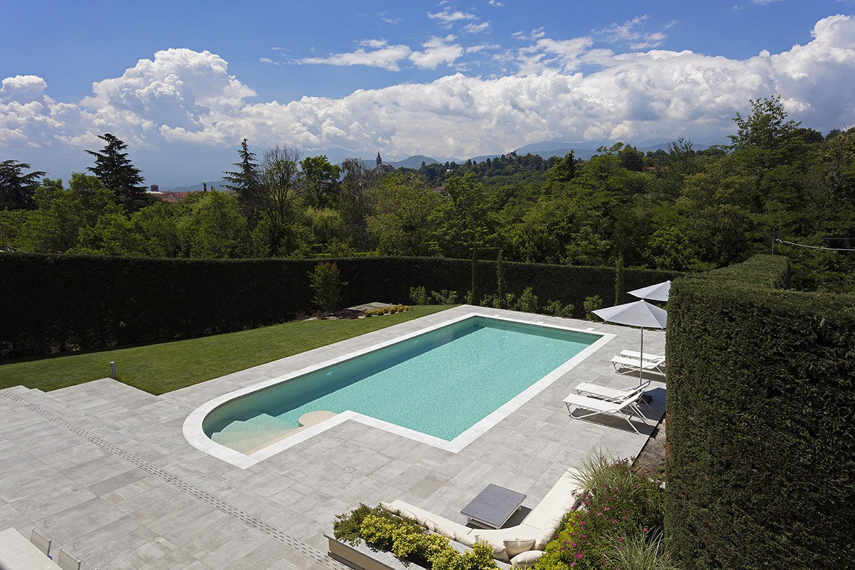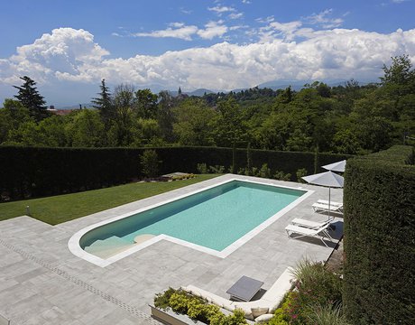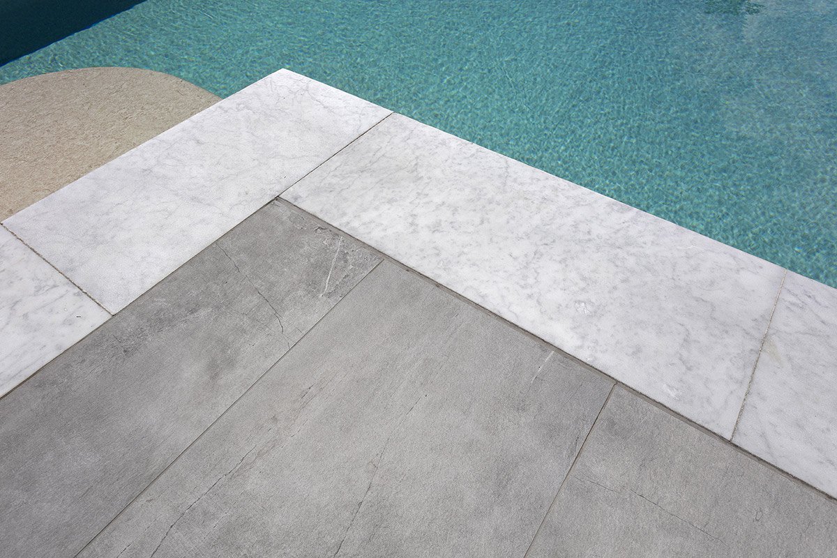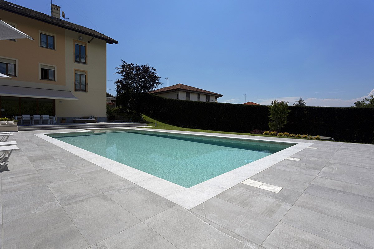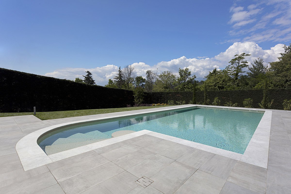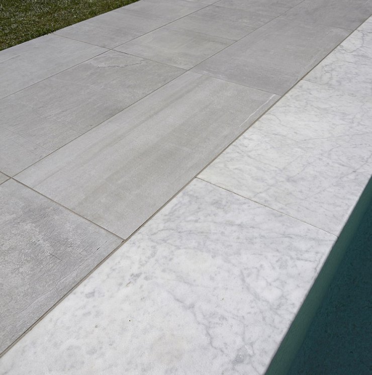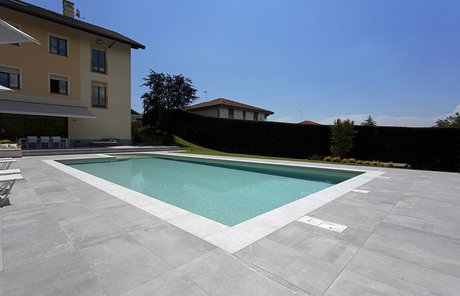 Le grand jardin, la magnifique piscine extérieure et la zone relax, sont mis en valeur par l’expressivité graphique de StoneOne, dans l’élégante tonalité Silver.