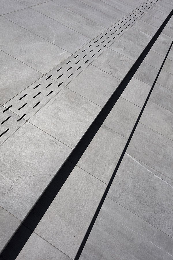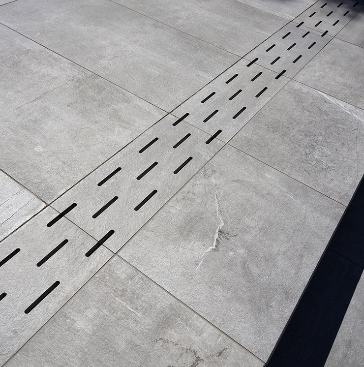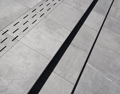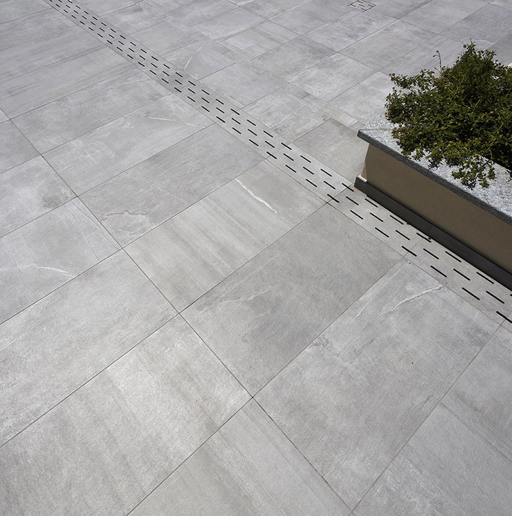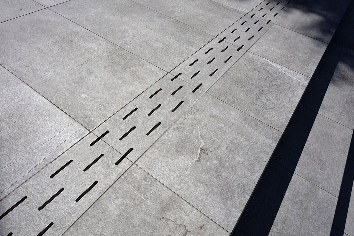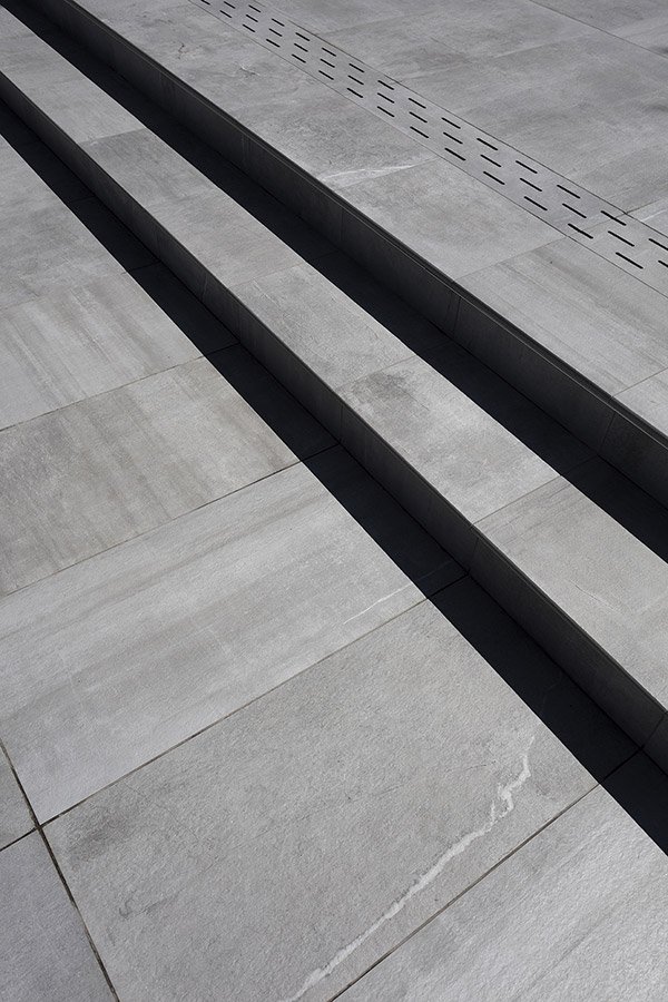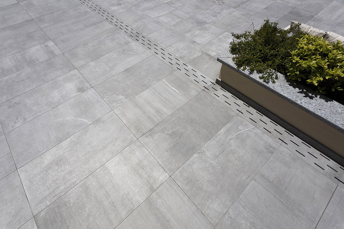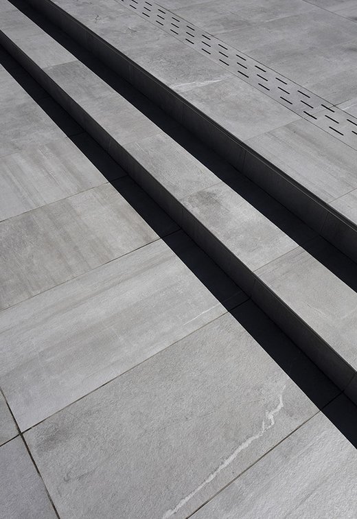 Grâce à la version forte épaisseur HiThick, les sols StoneOne assurent une résistance maximale aux variations atmosphériques, substances acides, intempéries et chocs mécaniques. La finition structurée R11 et la disponibilité de nombreuses pièces spéciales font de StoneOne la solution idéale aussi pour couvrir le bord et le fond de la piscine. Même la zone Garage est entièrement revêtue de céramiques StoneOne, qui dessinent un espace essentiel mais accueillant, en continuité avec l’extérieur.