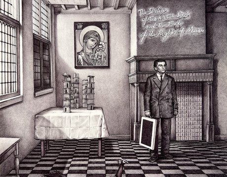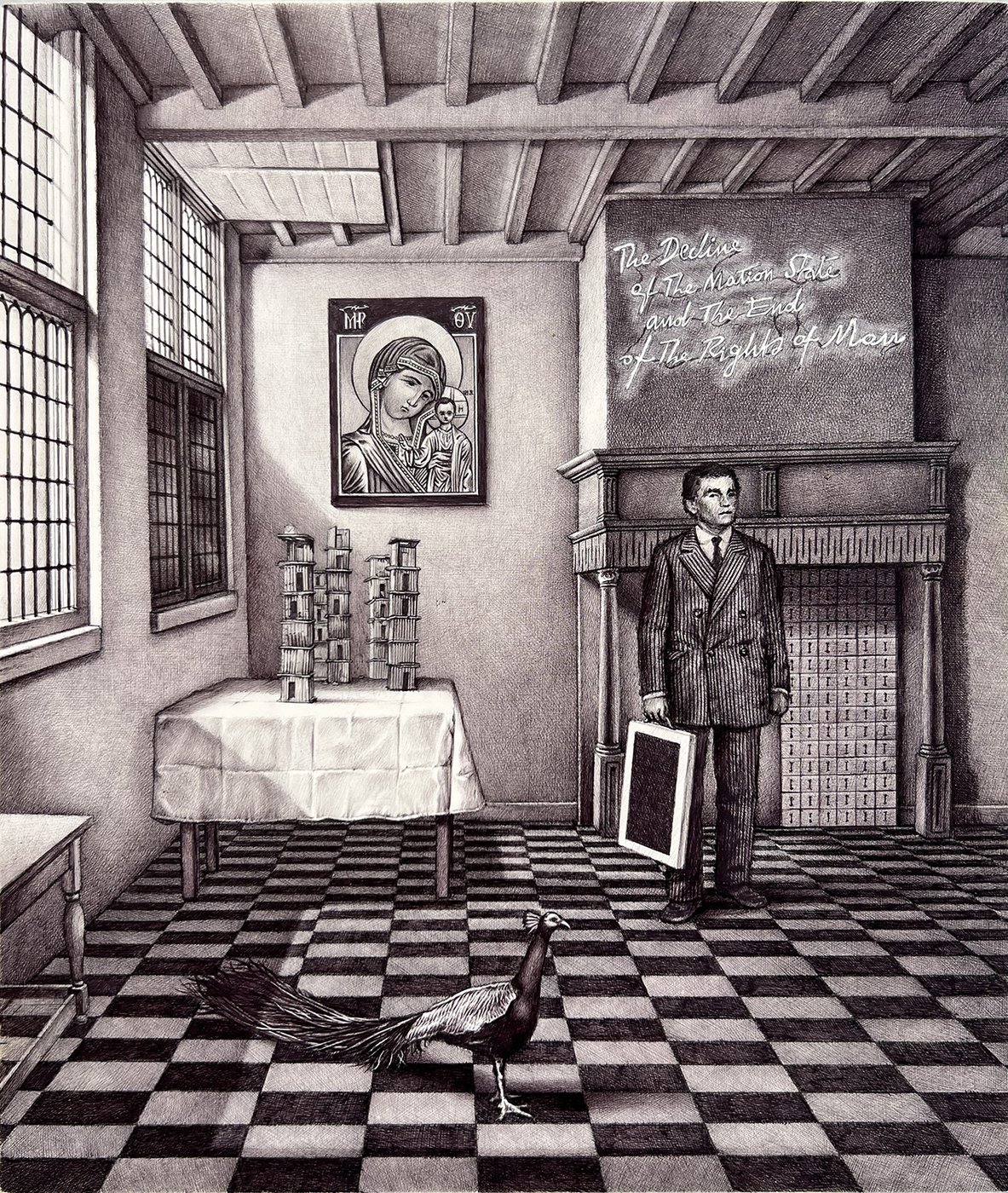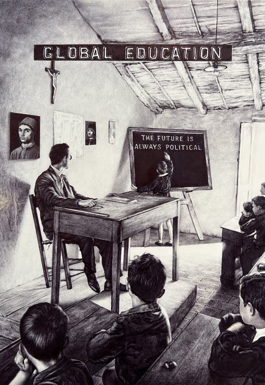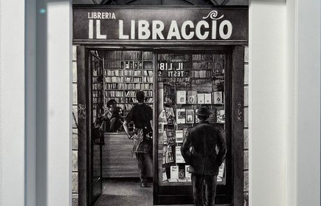Immagini di paesaggi si alternano a opere complesse e stratificate in luoghi chiusi, che nel tempo trovano entrambe il loro compimento. Tematiche quali immigrazione, politica, giochi di potere e sottomissione, sono sviscerate nei disegni di Stampone.