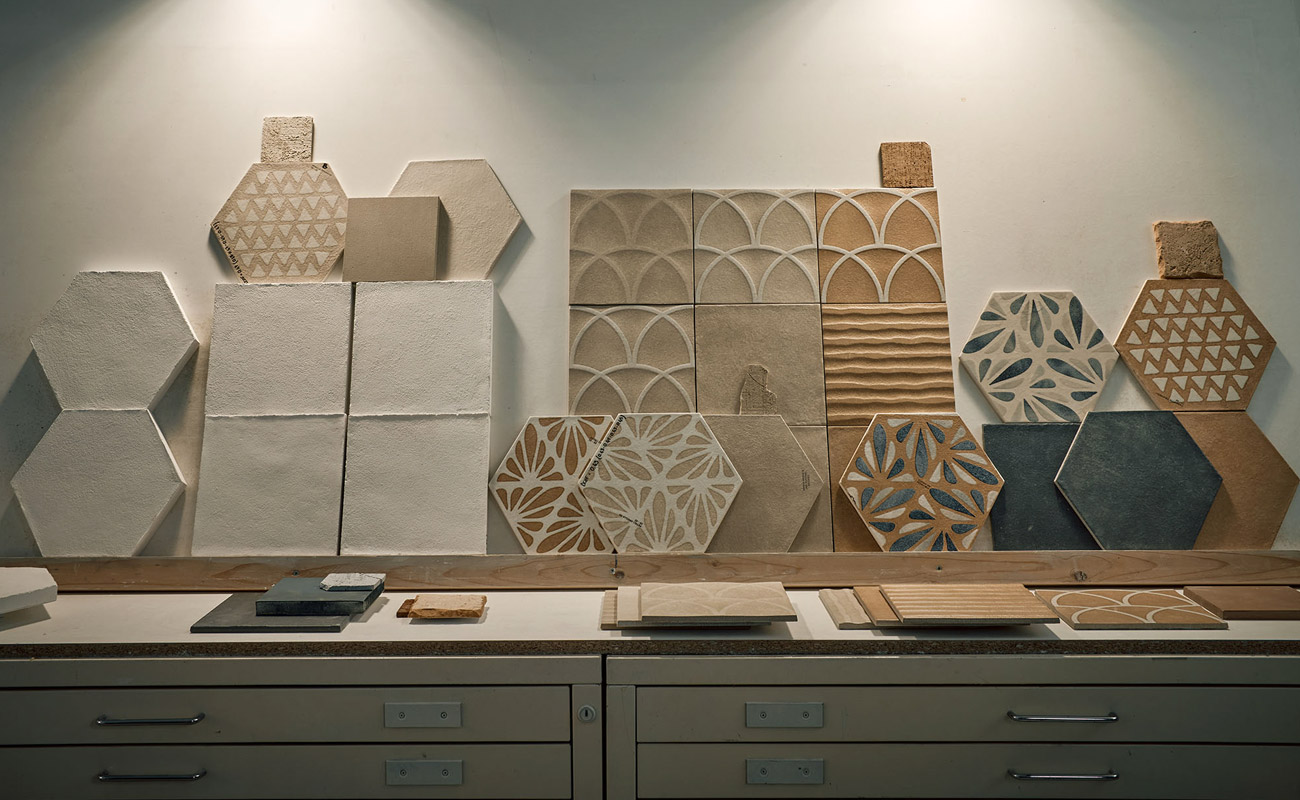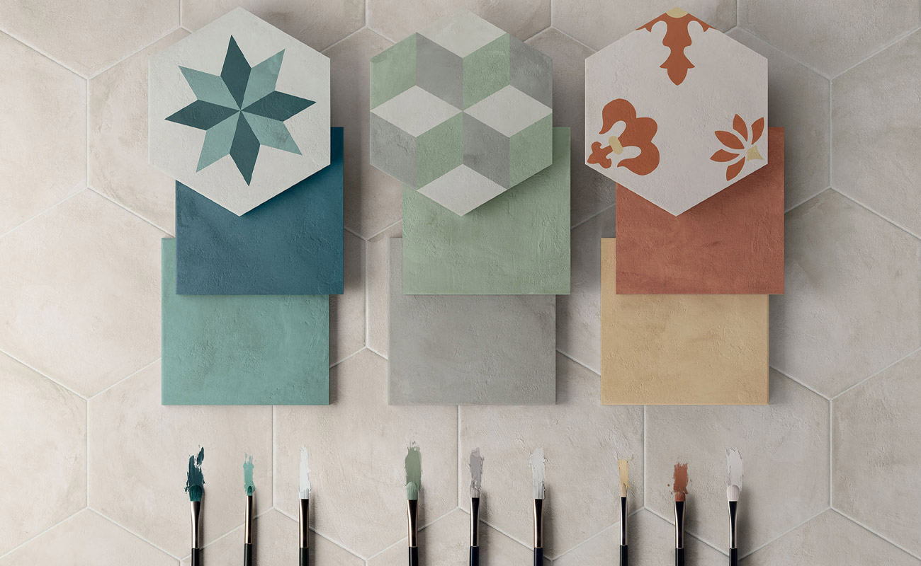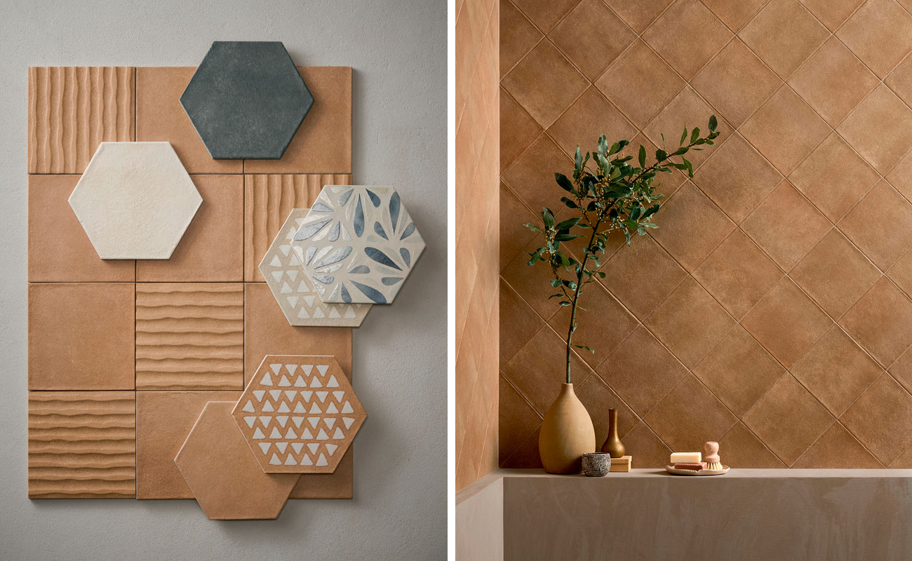 La creta si combina a graniglie vetrose in un gioco a due ispirato all'antica tecnica artigianale dell'intarsio nei pattern geometrici e floreali Cesello e Intarsio, disponibili nel formato esagona e nei colori Argilla e Chamotte. Grazie a particolari accorgimenti tecnologici, e all’utilizzo di una materia ricca e corposa, è possibile posare questa particolare tipologia di pattern “con graniglia” non solo a parete, ma anche a pavimento, assicurando buone prestazioni dal punto di vista della resistenza allo scivolamento.