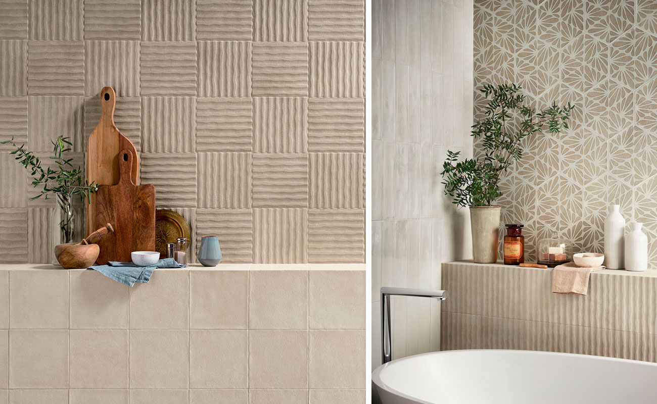 La materia naturale plasmata e modellata a mano si concretizza nei pattern tridimensionali Rilievo, segnato da tratti perpendicolari, e Forma, caratterizzato da un susseguirsi di archi, con delicati giochi di luce che animano le superfici.